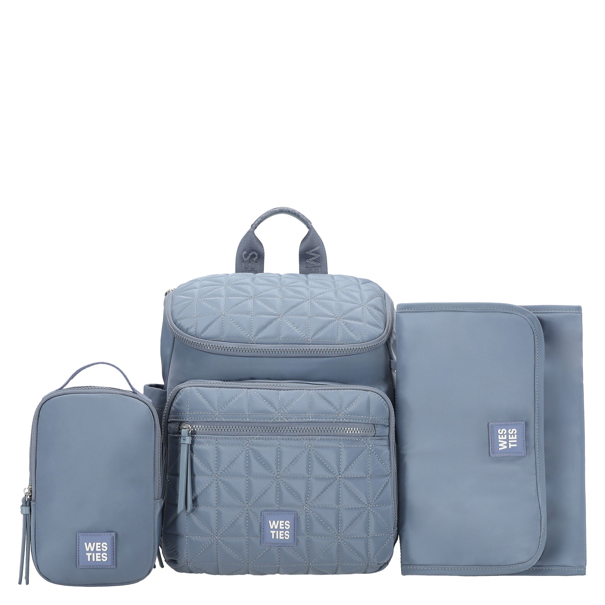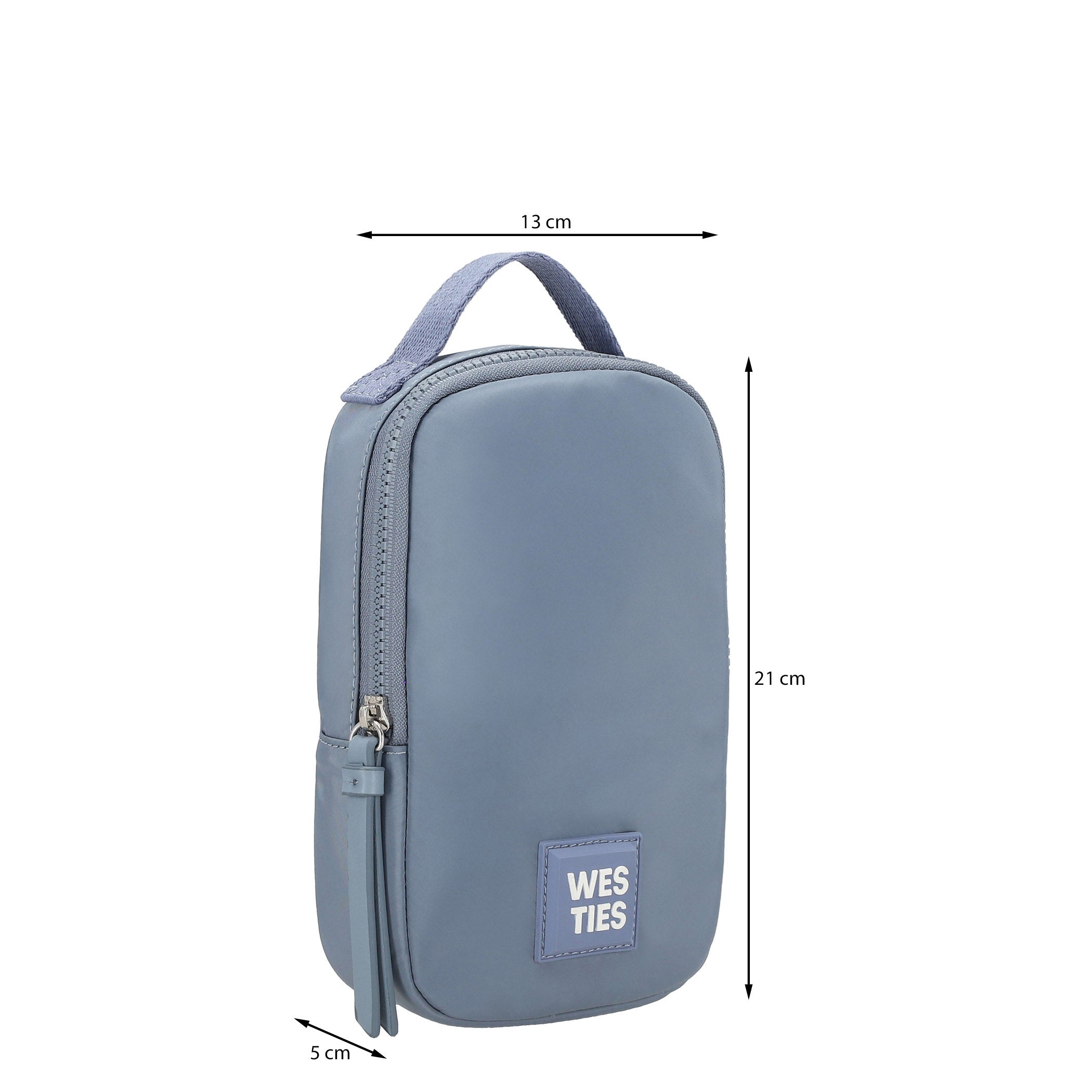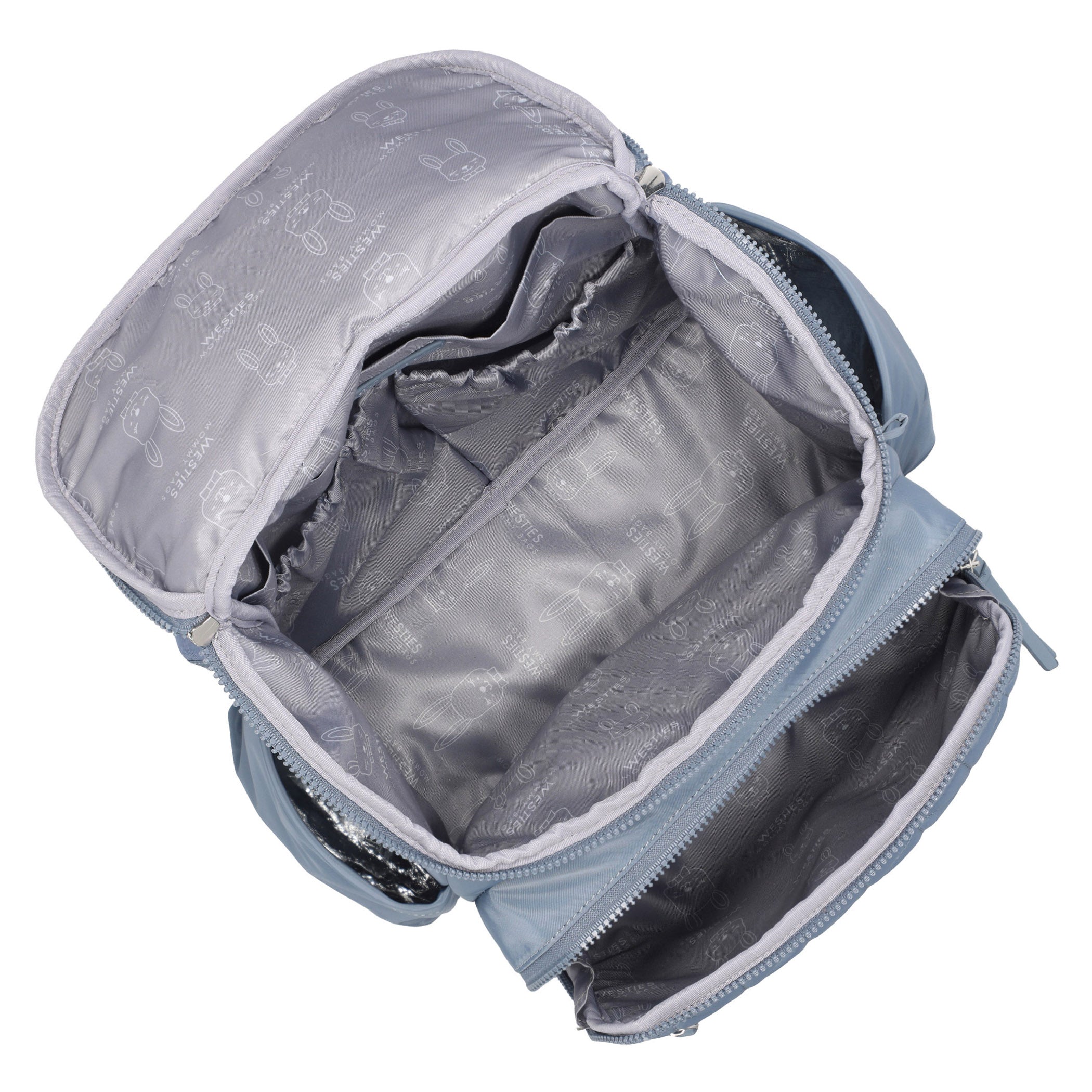 Pañalera Westies para mujer elaborada en material textil con estampado liso, fijación de cierre, forro de poliéster y textura lisa.