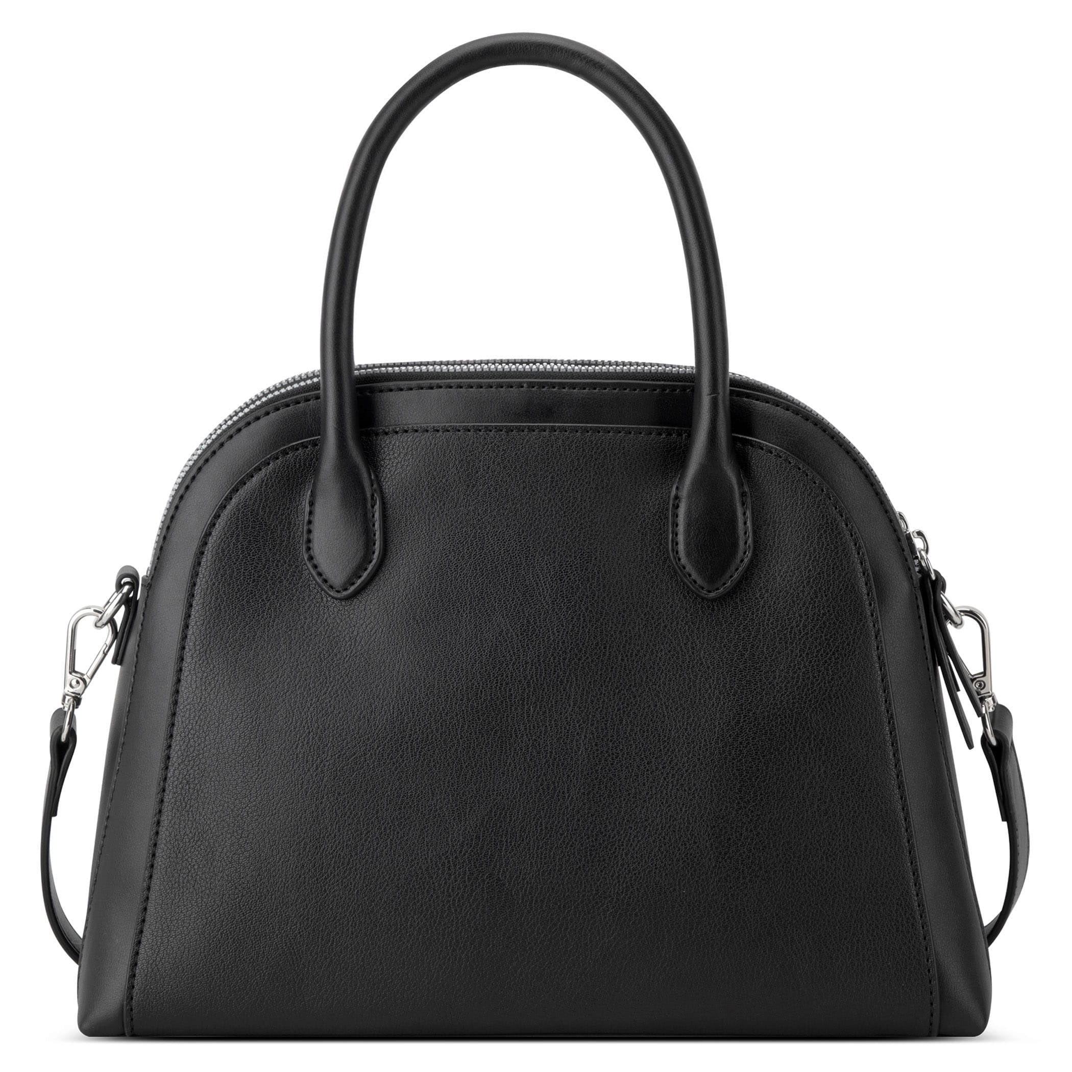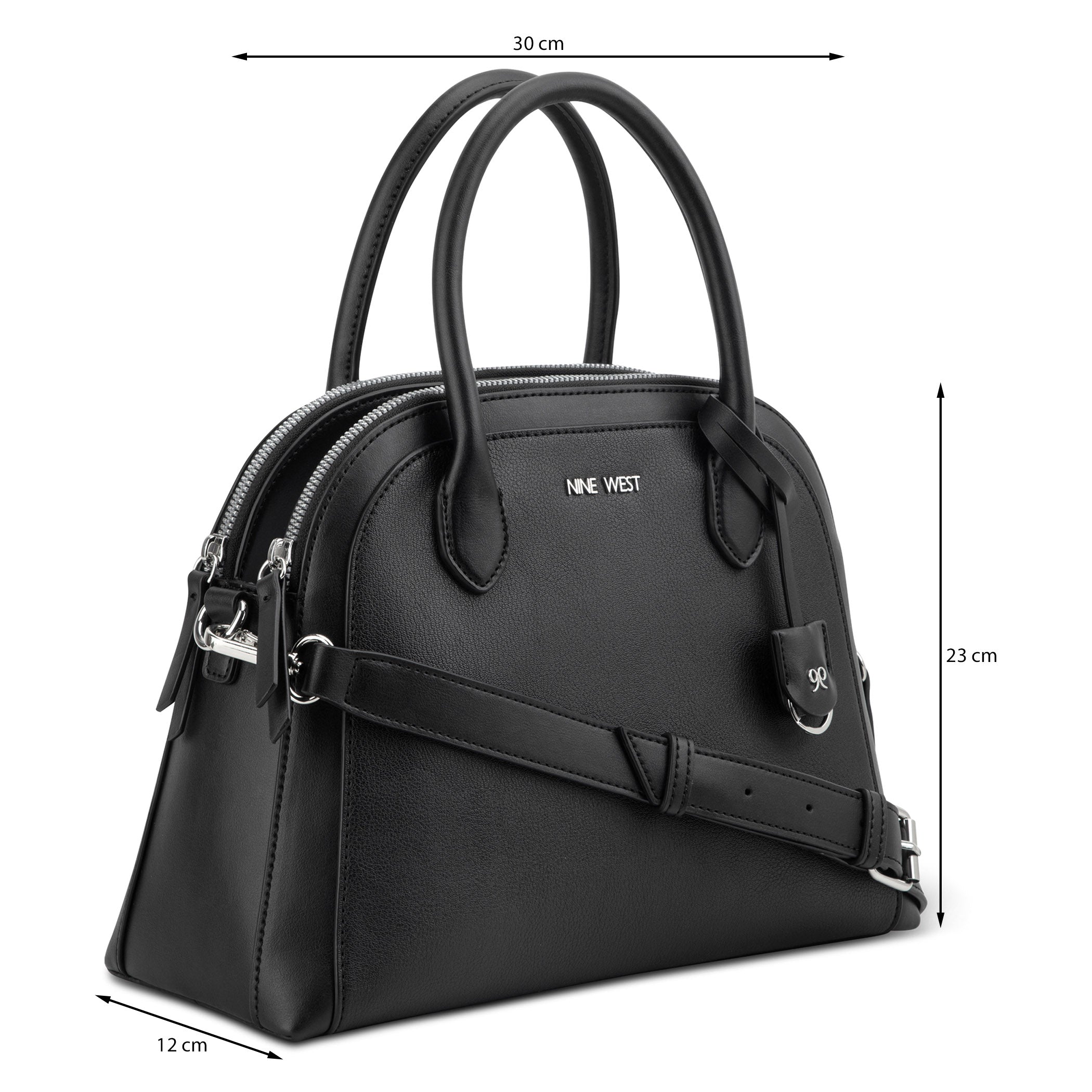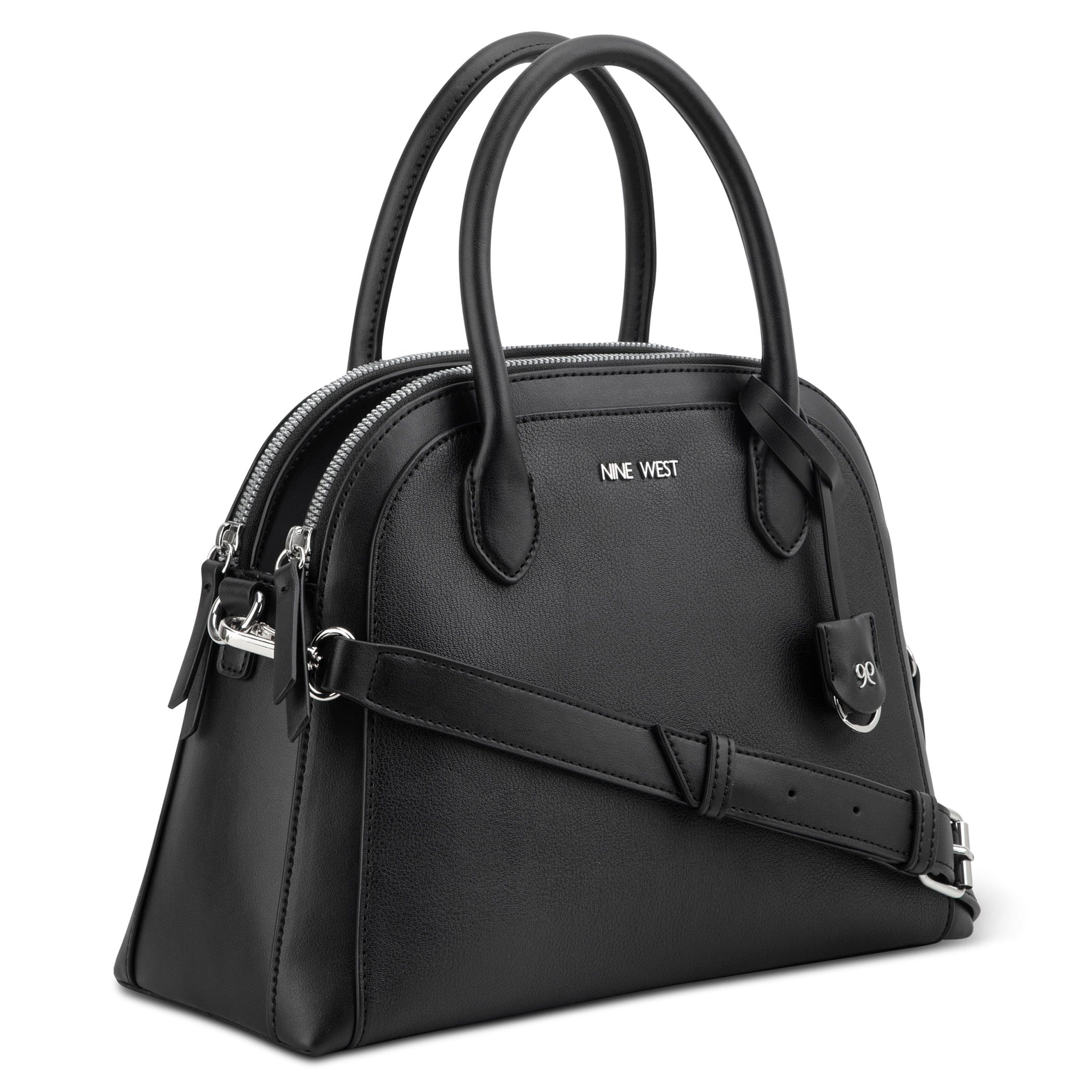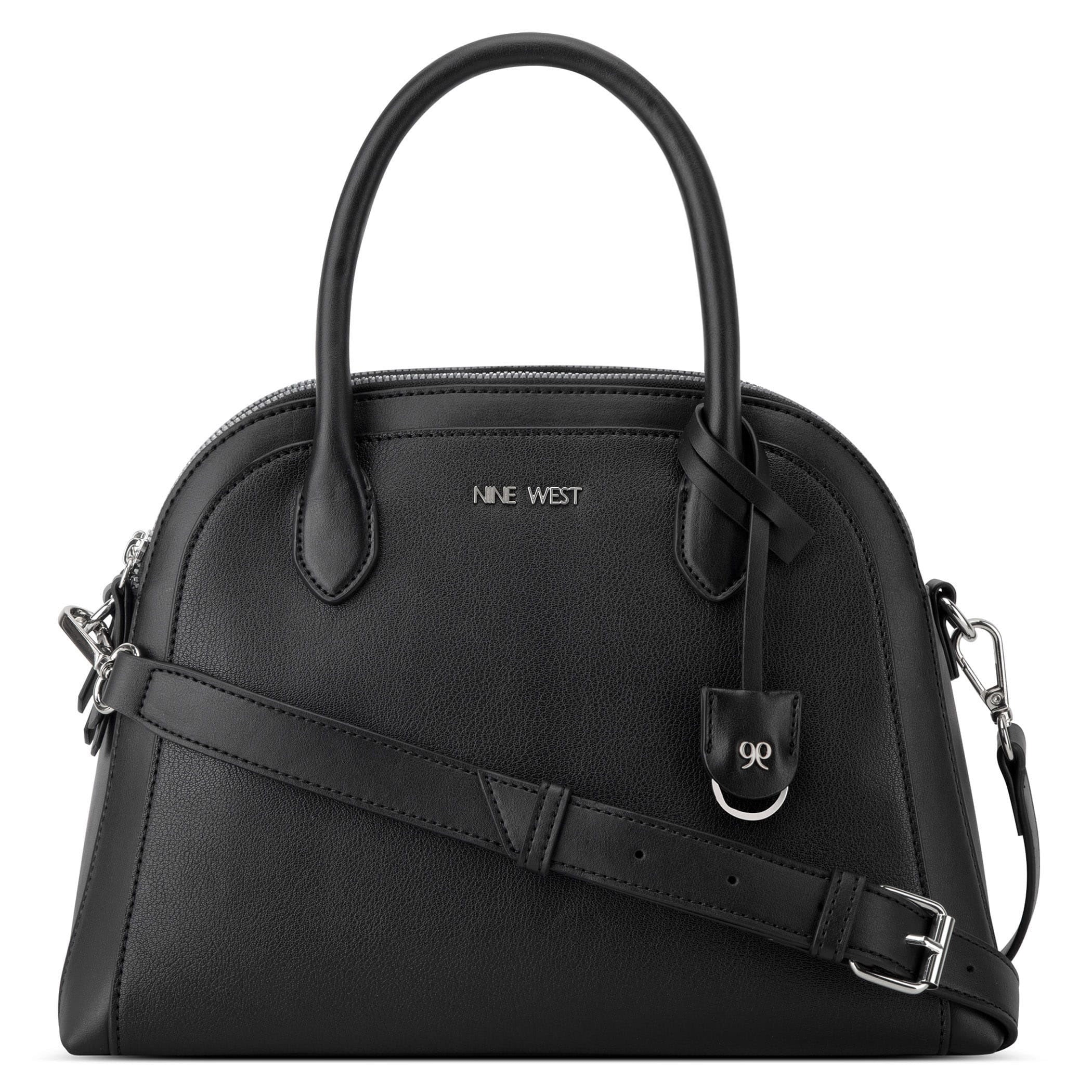 Bolsa de mano Nine West para mujer elaborada en material sintético con aplicación de accesorio dorado, estampado liso, fijación de cierre y textura lisa.