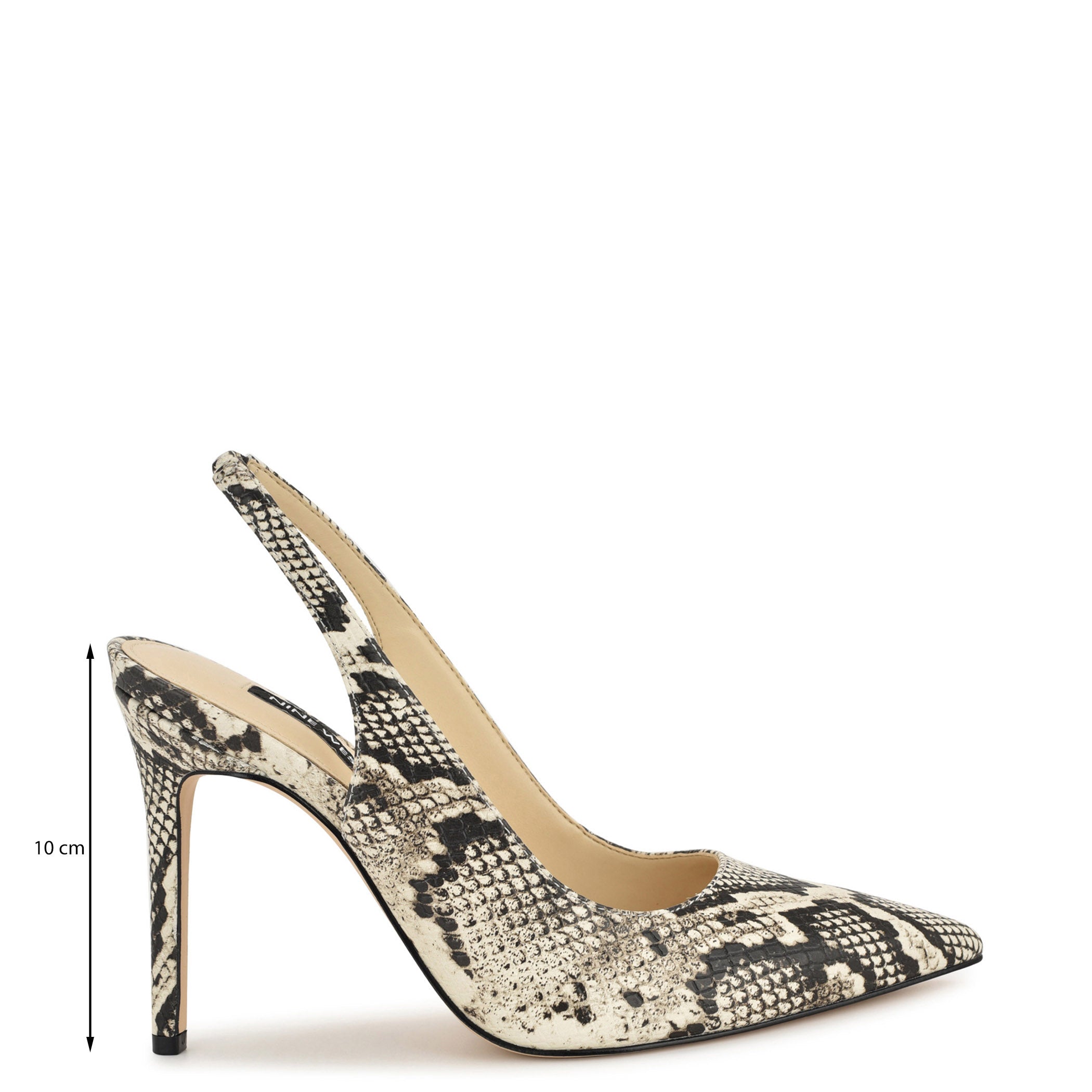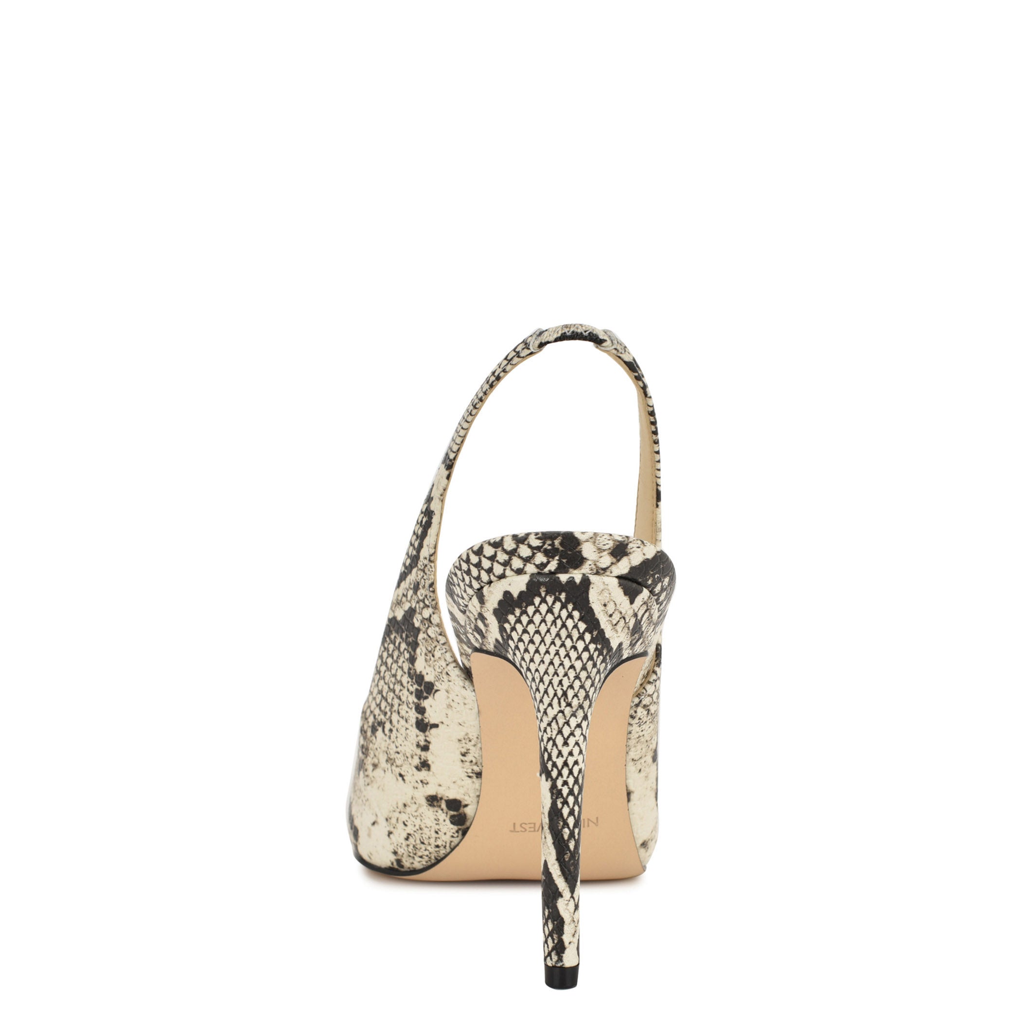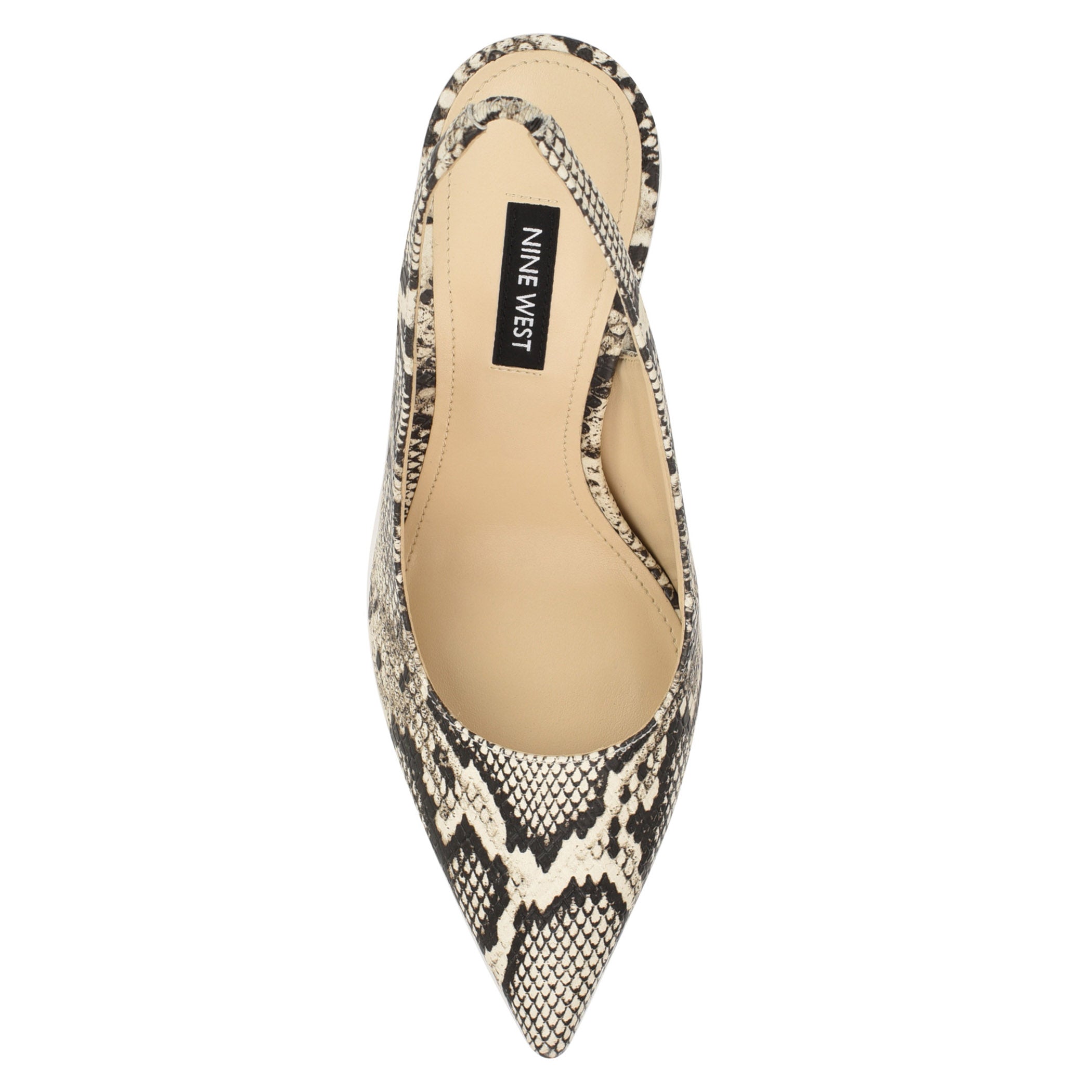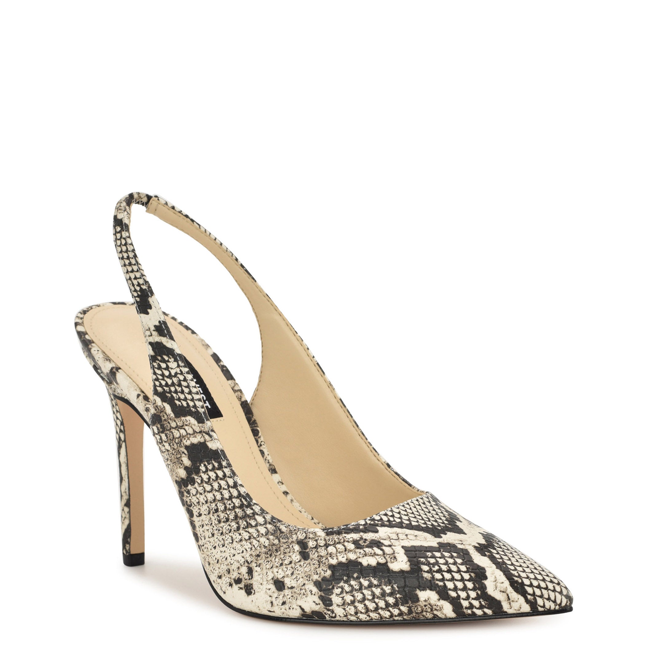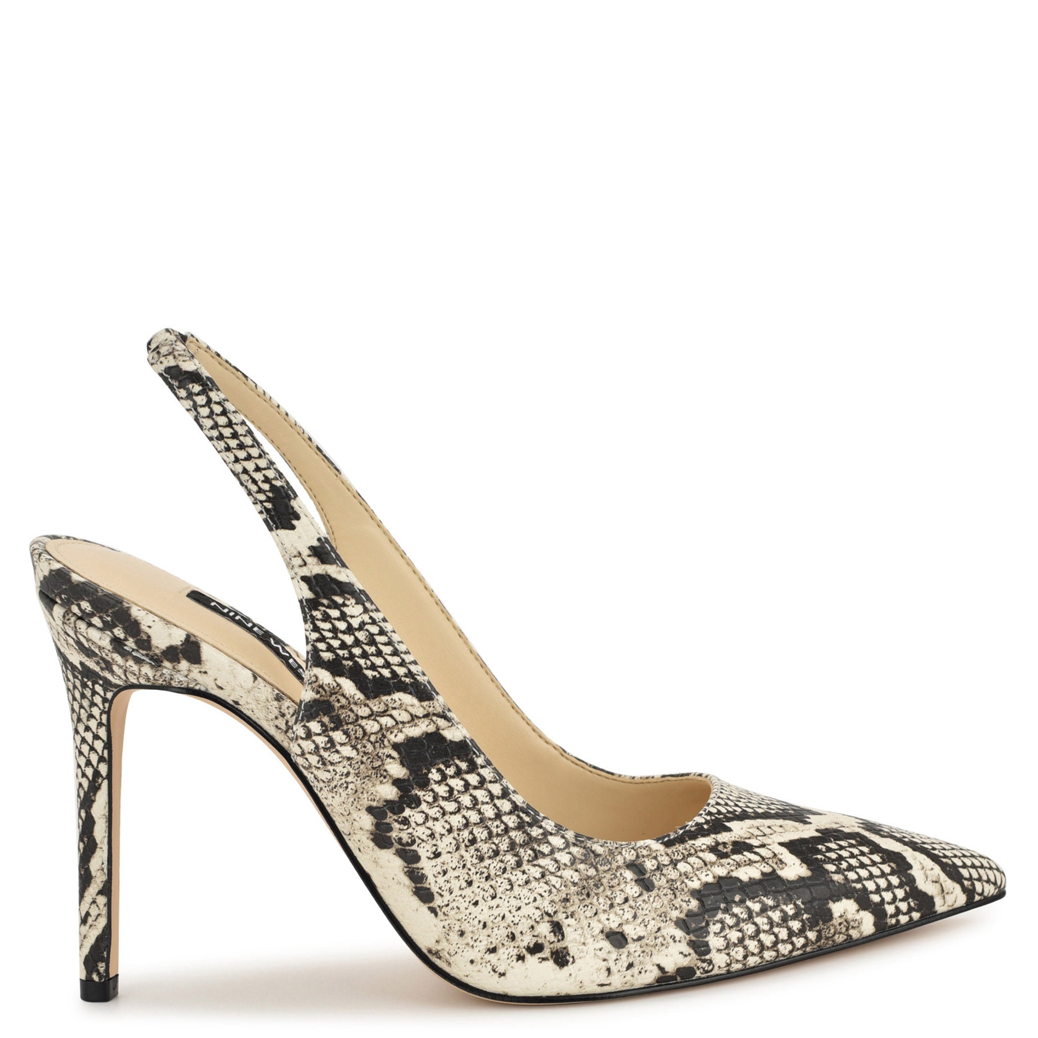 Zapatilla Nine West para mujer elaborada en material sintético con estampado liso, fijación de hebilla, punta puntal, textura lisa y cuña alta.