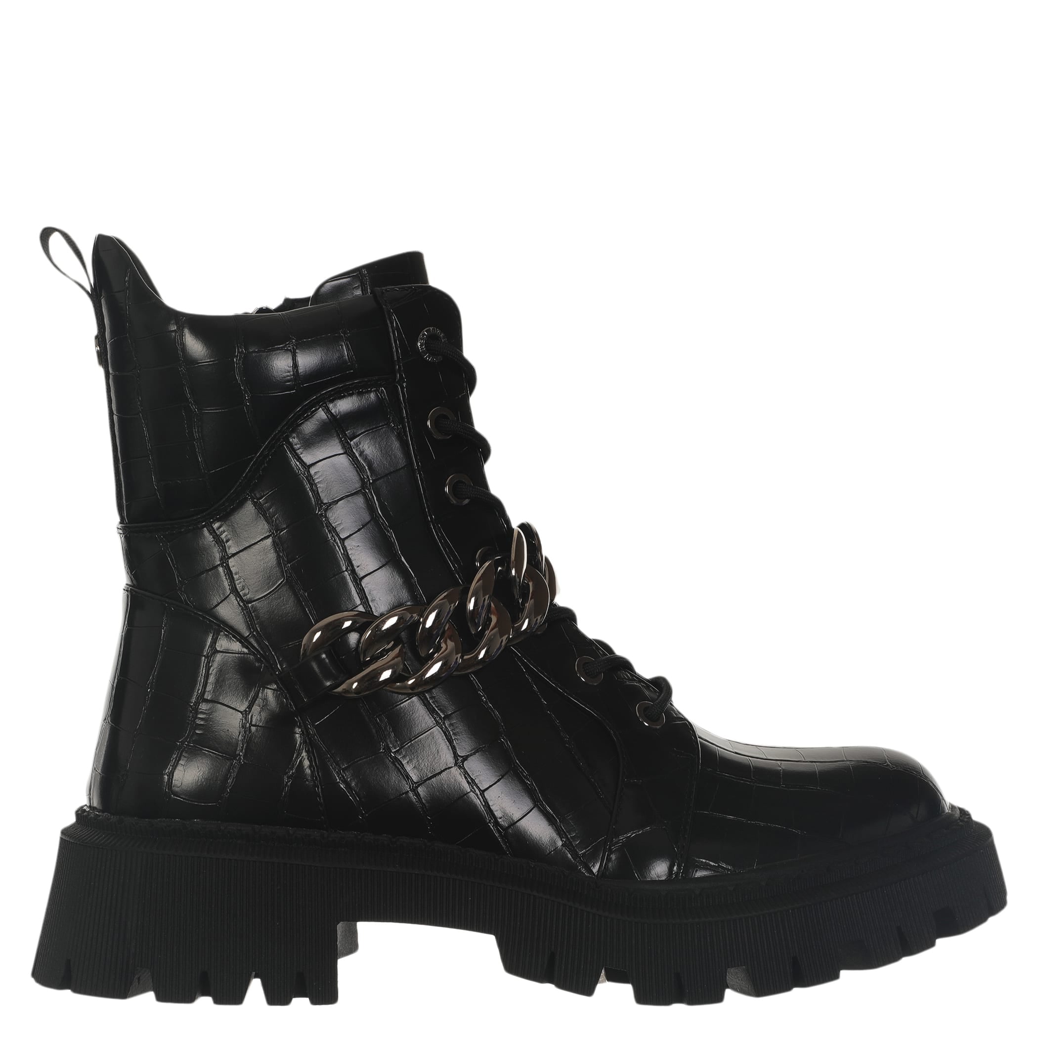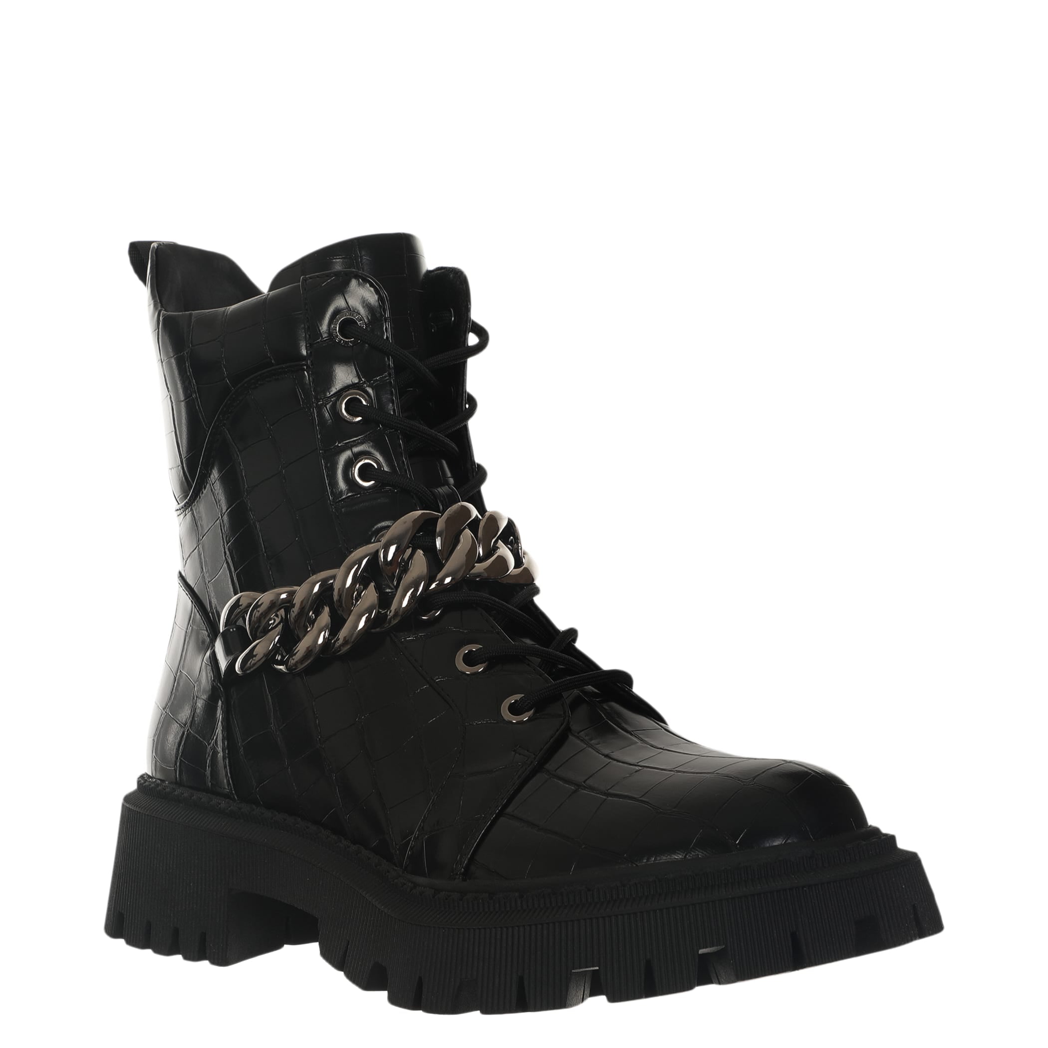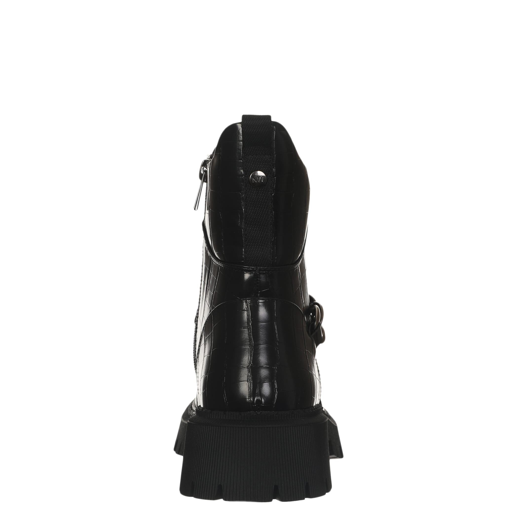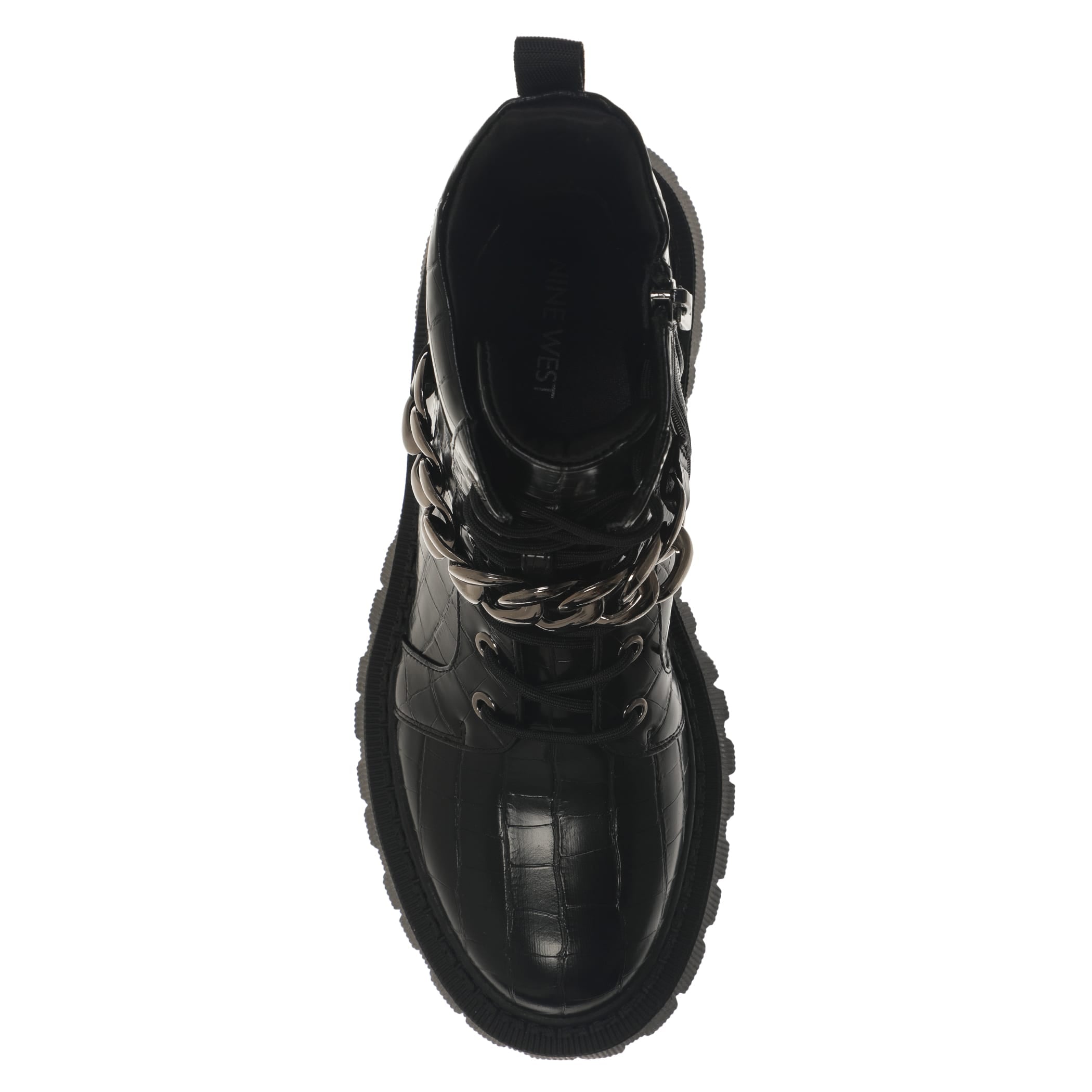 Bota con tacón Nine West para mujer elaborado en material sintético con aplicación de cadena, estampado animal print, fijación de agujeta, punta redonda, textura de cocodrilo y altura de tacón 5 cm
