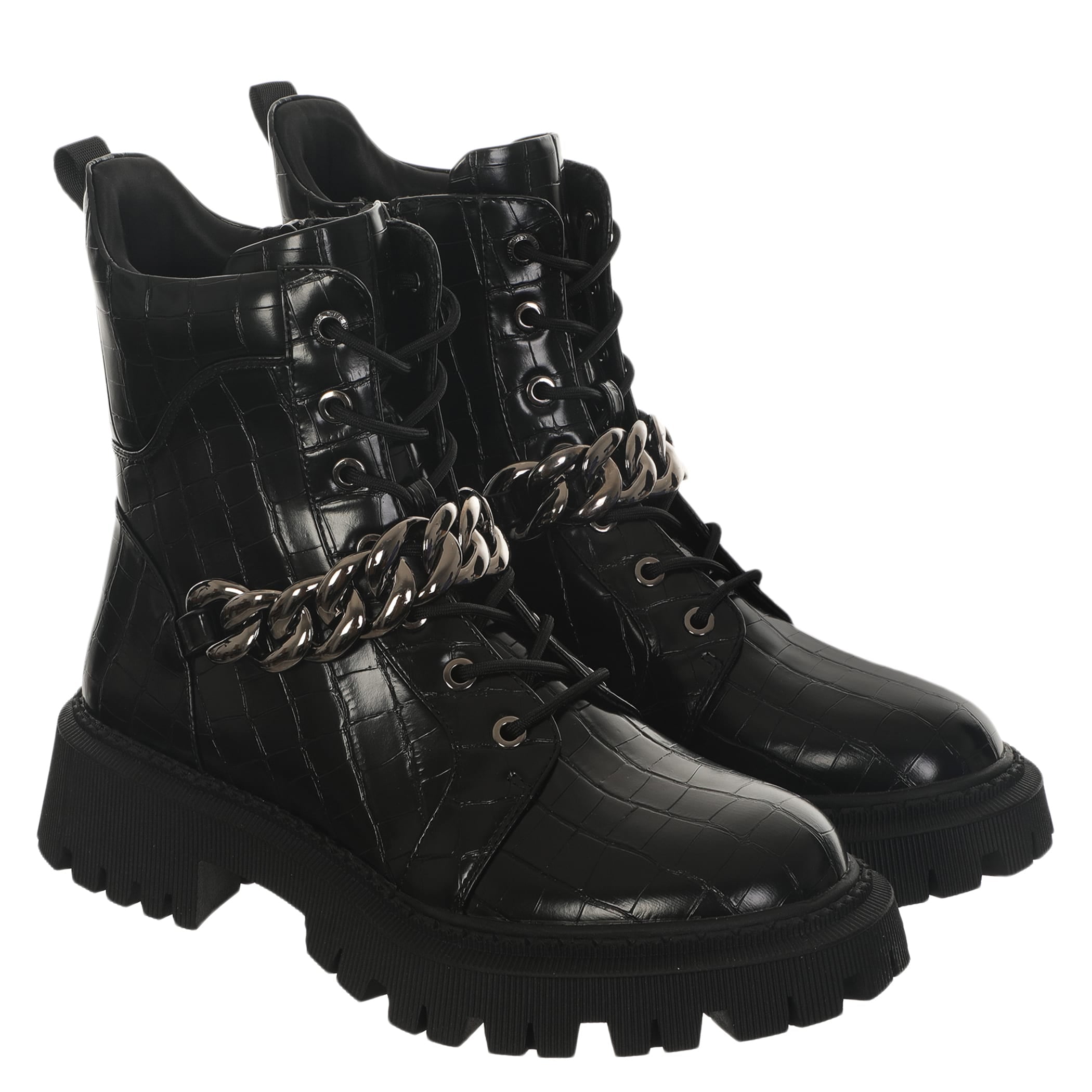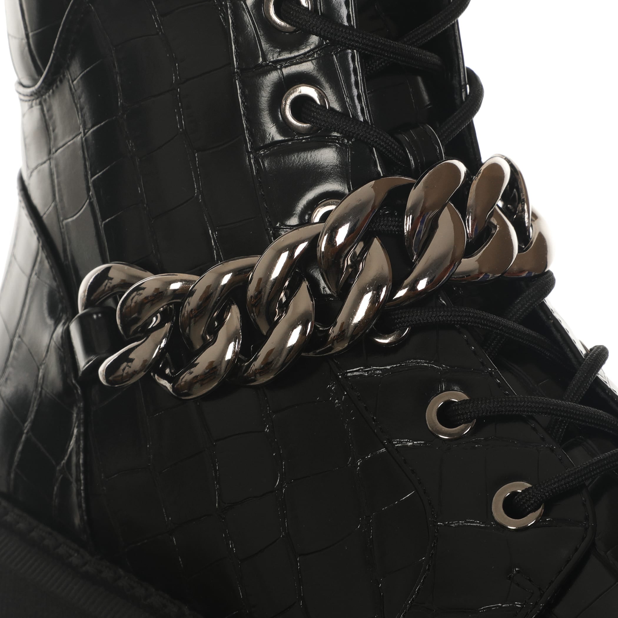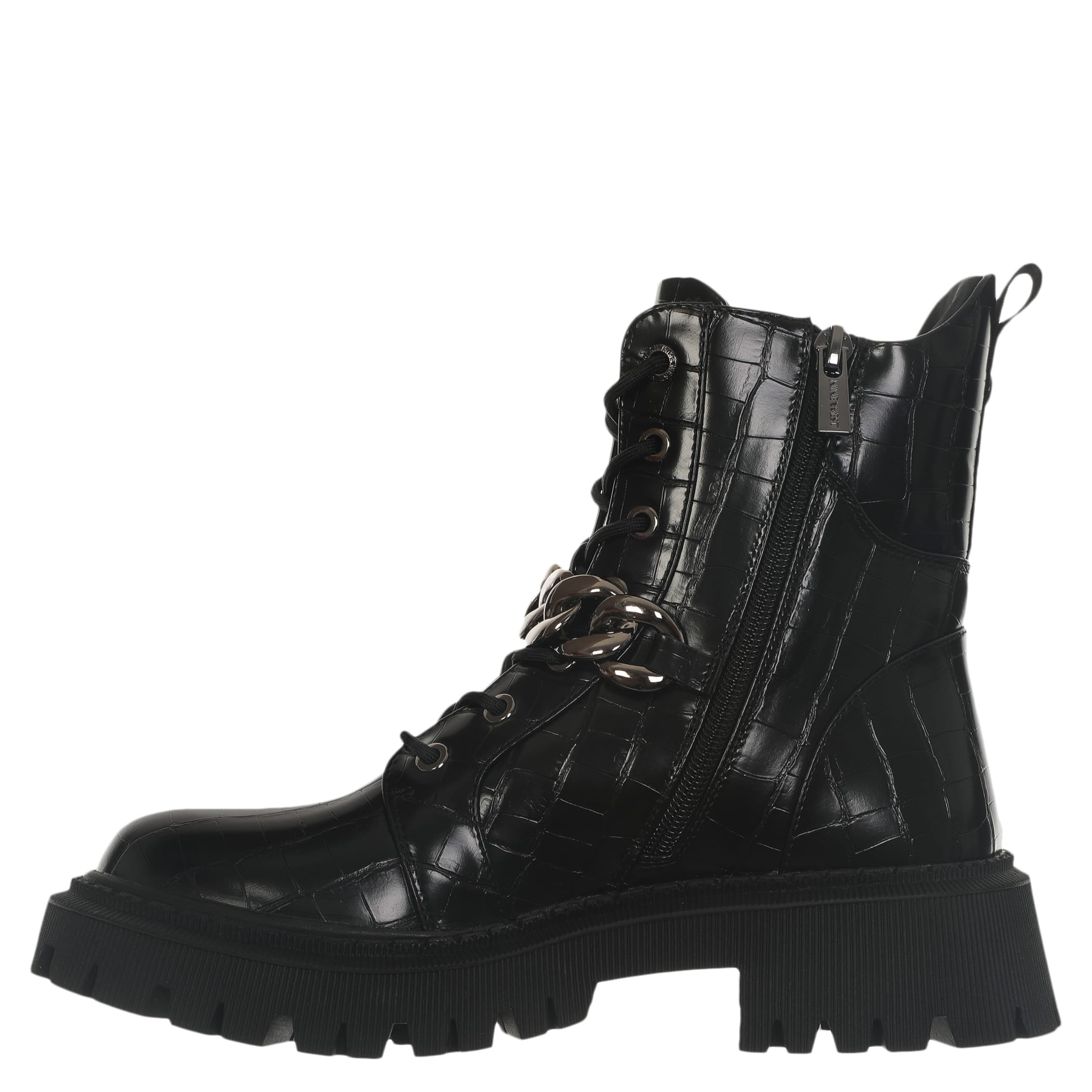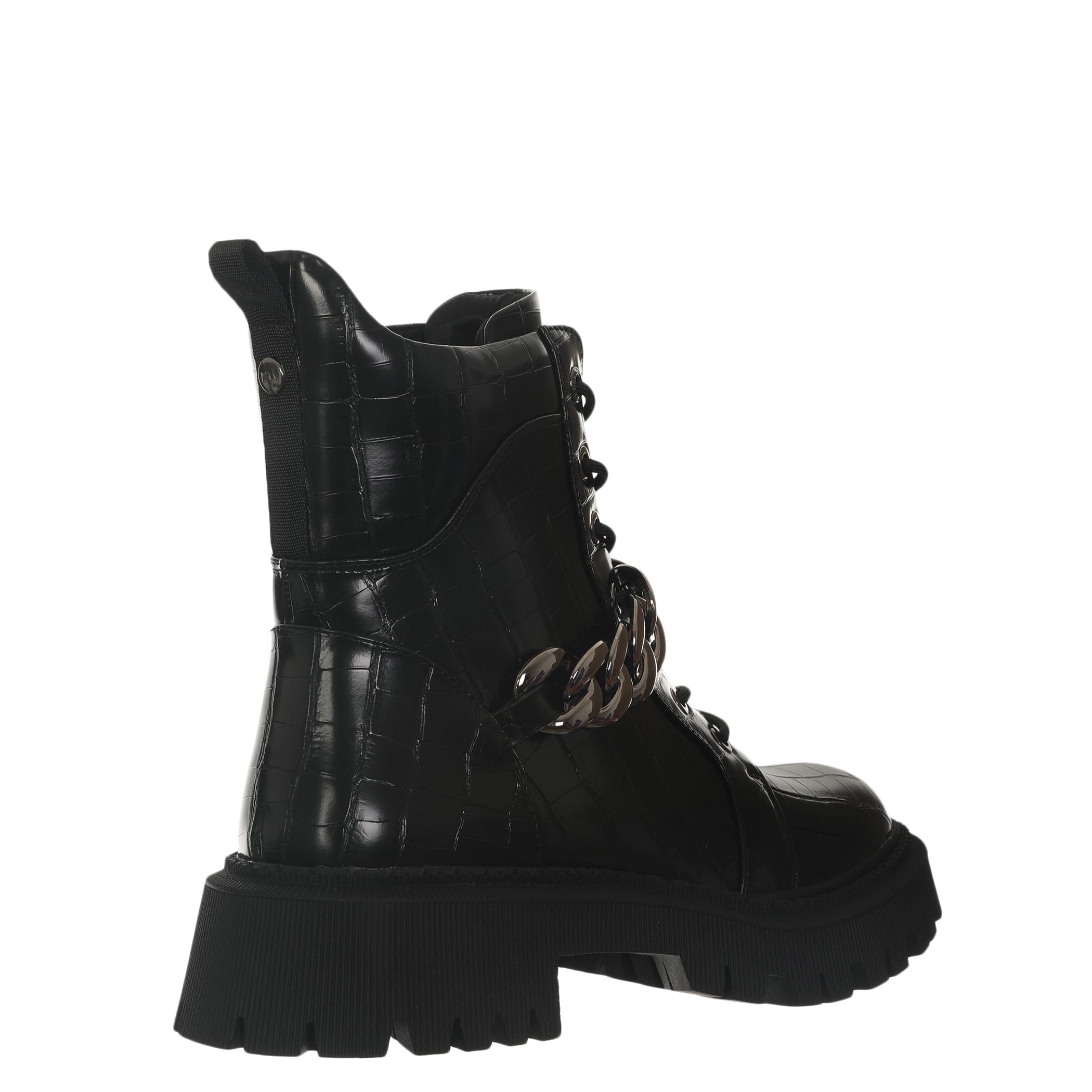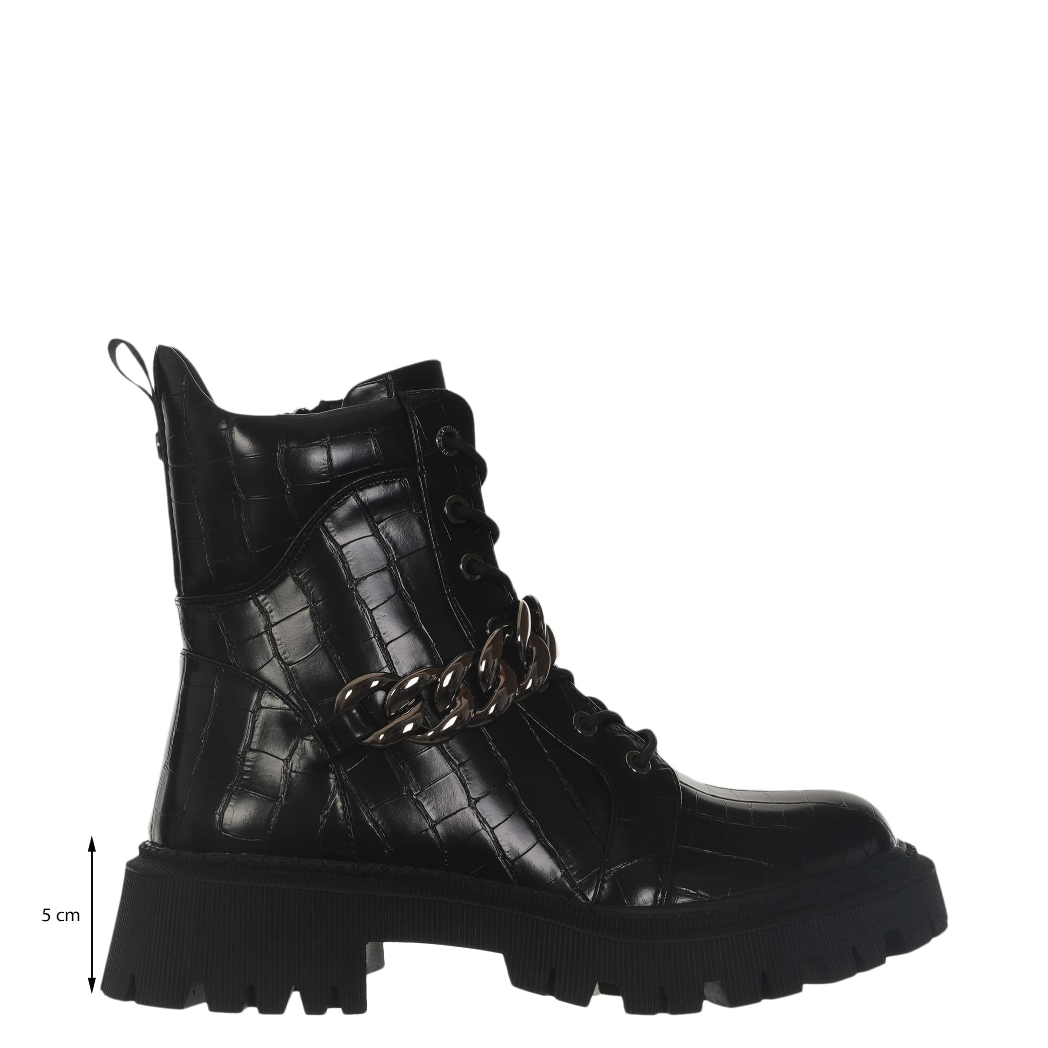 Bota con tacón Nine West para mujer elaborado en material sintético con aplicación de cadena, estampado animal print, fijación de agujeta, punta redonda, textura de cocodrilo y altura de tacón 5 cm