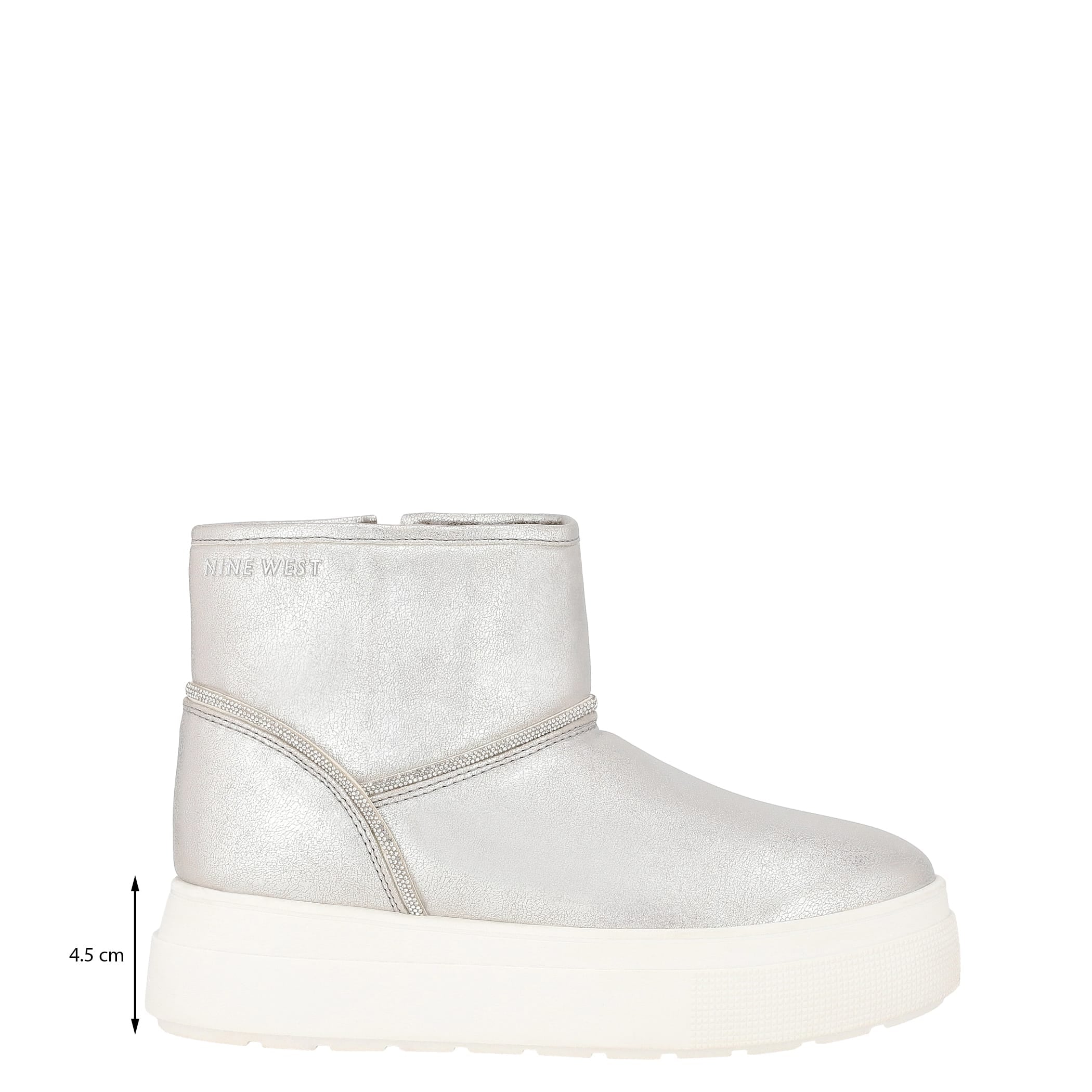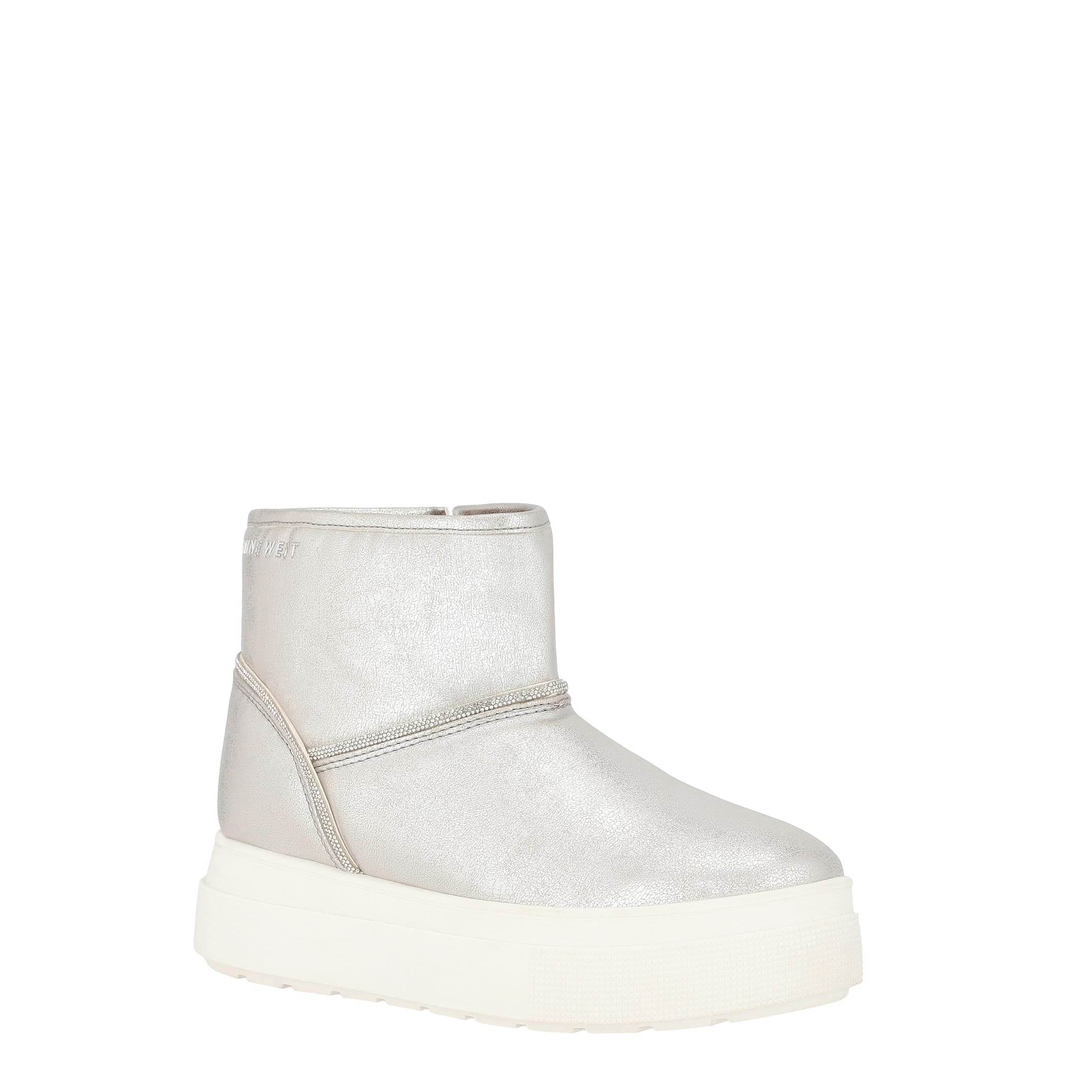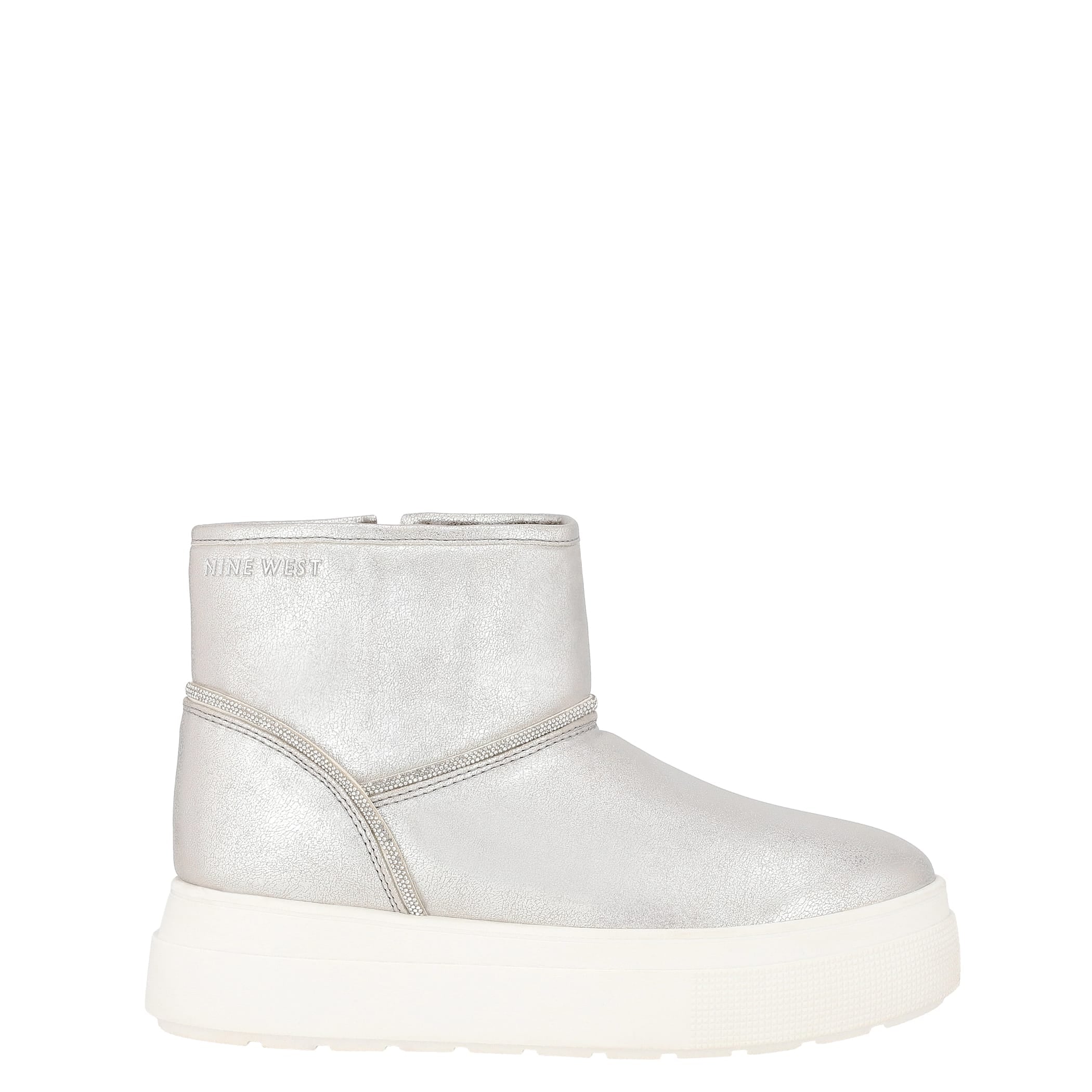 Botín Nine West para niñas elaborado en material sintético con estampado liso, fijación abierta, punta redonda, textura lisa, cuña flat, suela de inyección y forro textil.