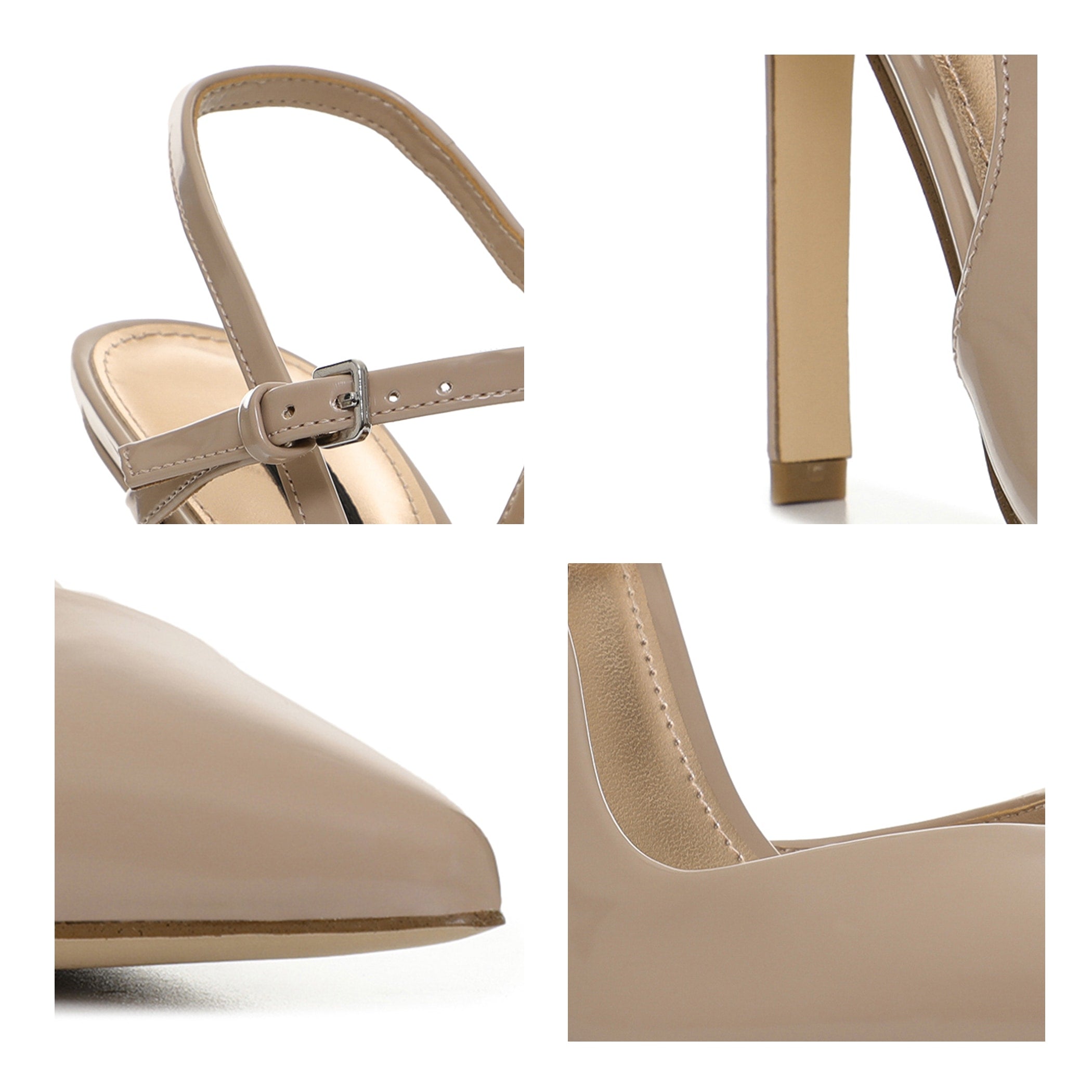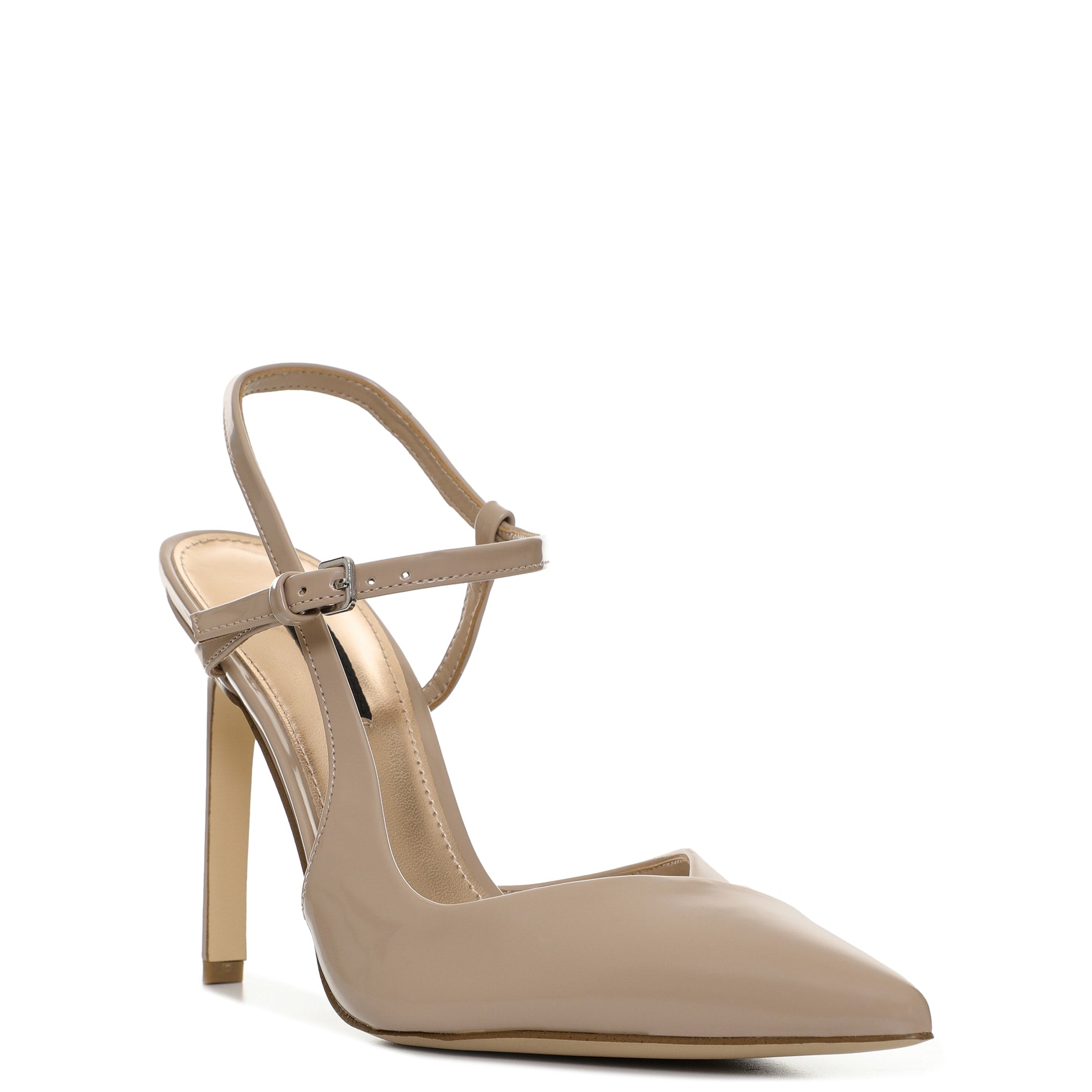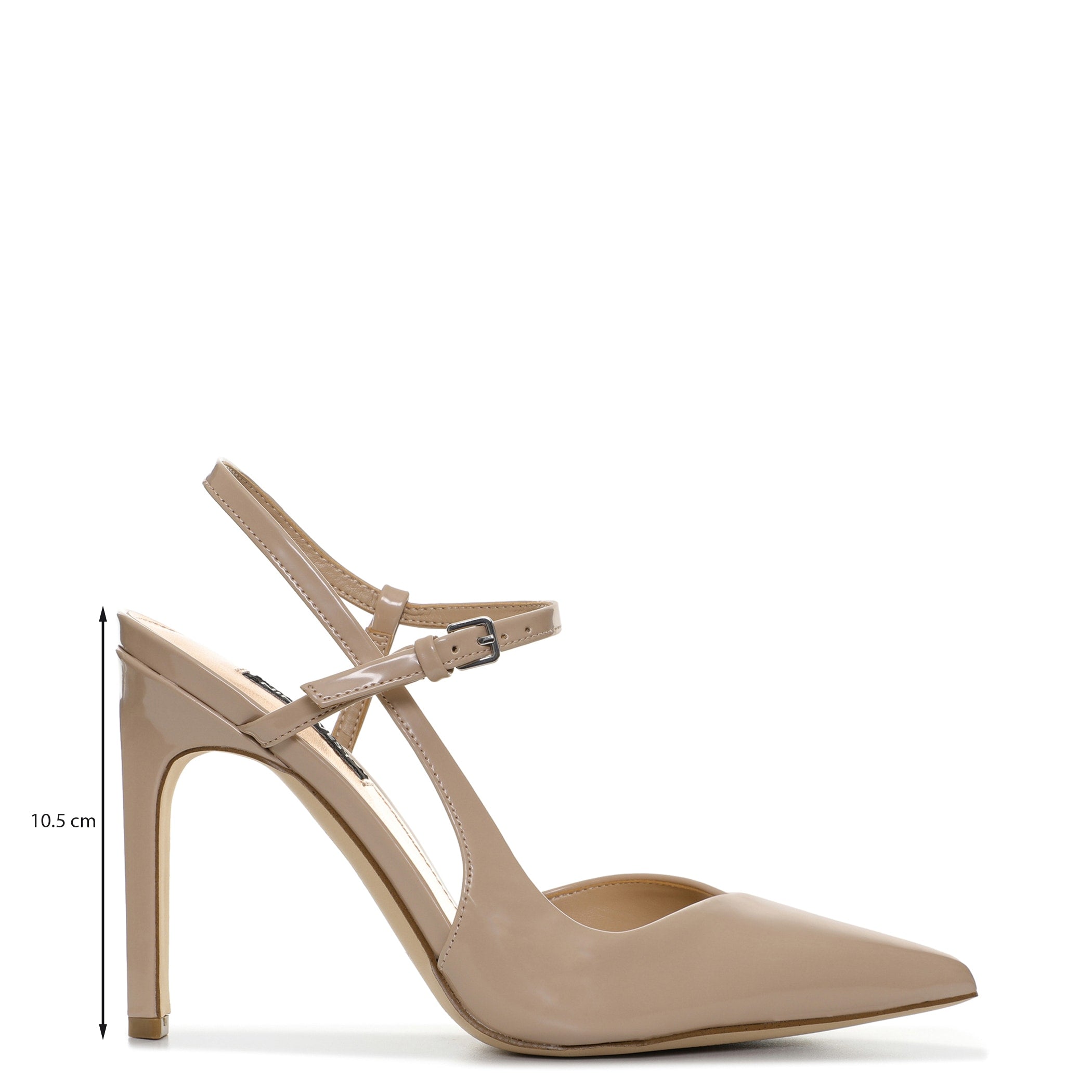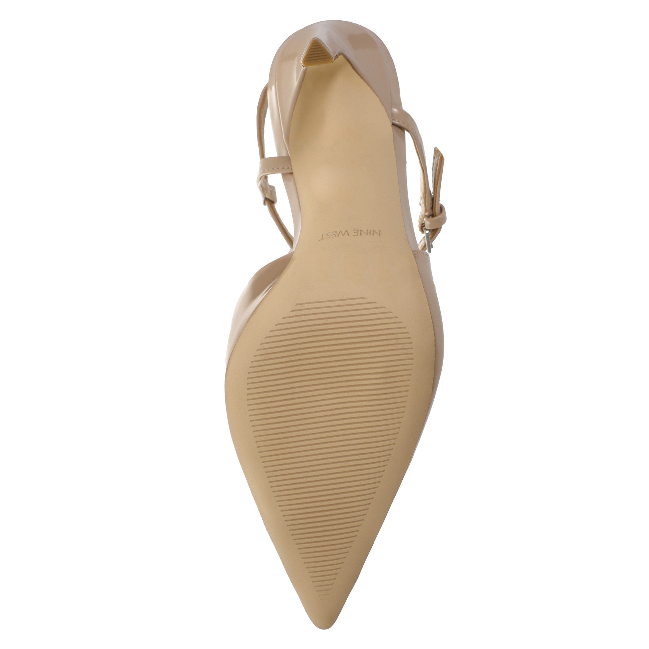 Zapatilla Nine West para mujer elaborada en material charol con estampado liso, fijación de hebilla, punta puntal y textura lisa.