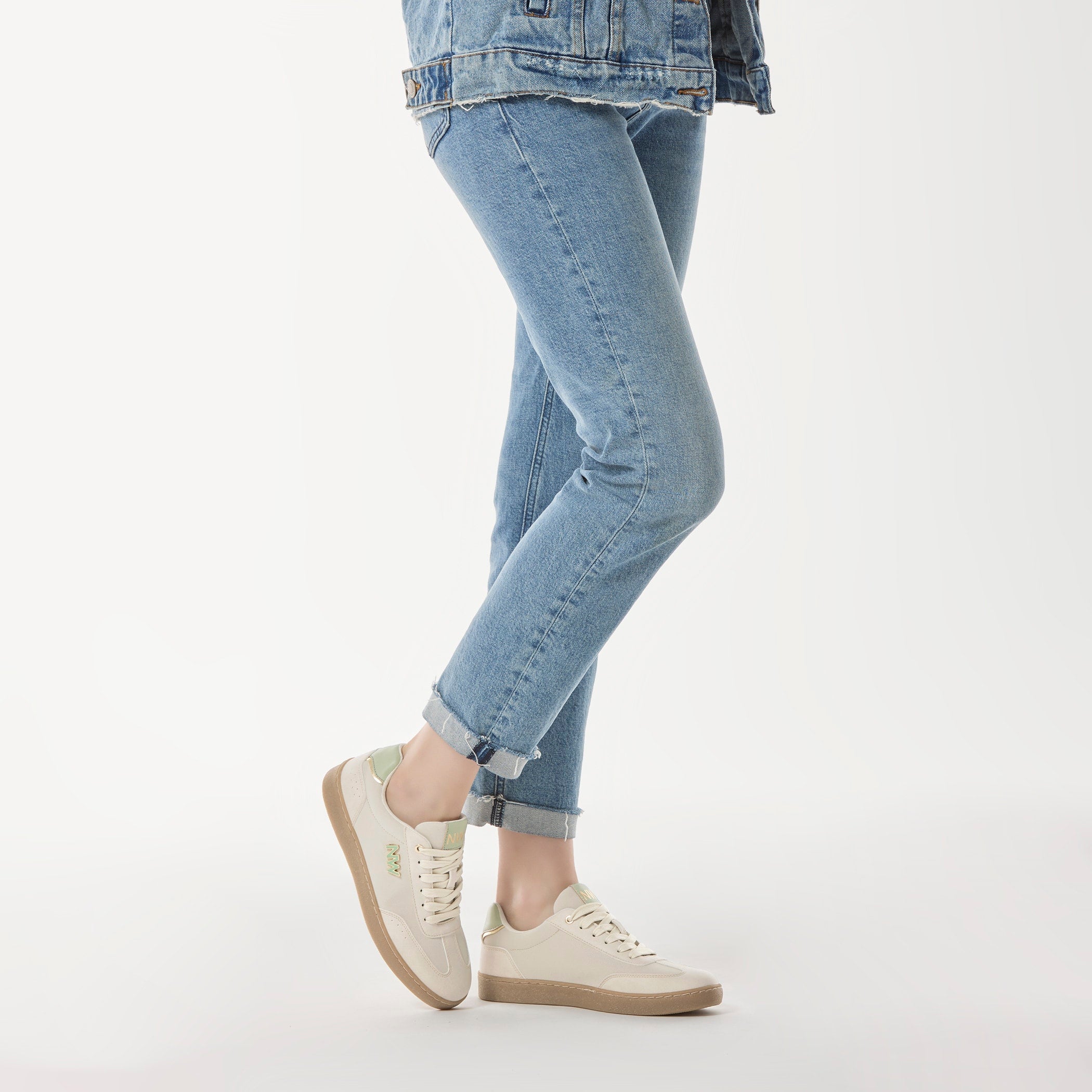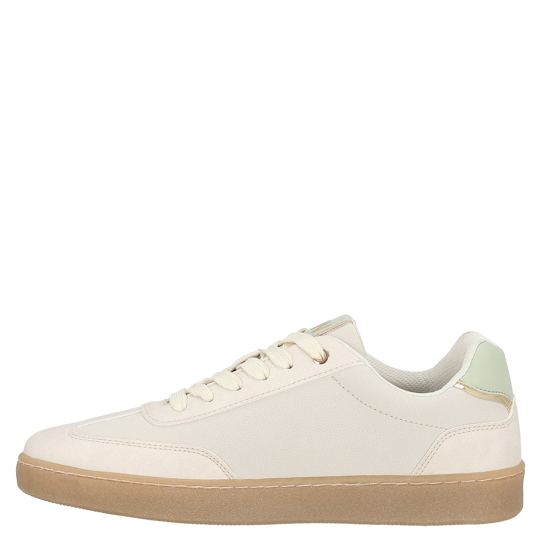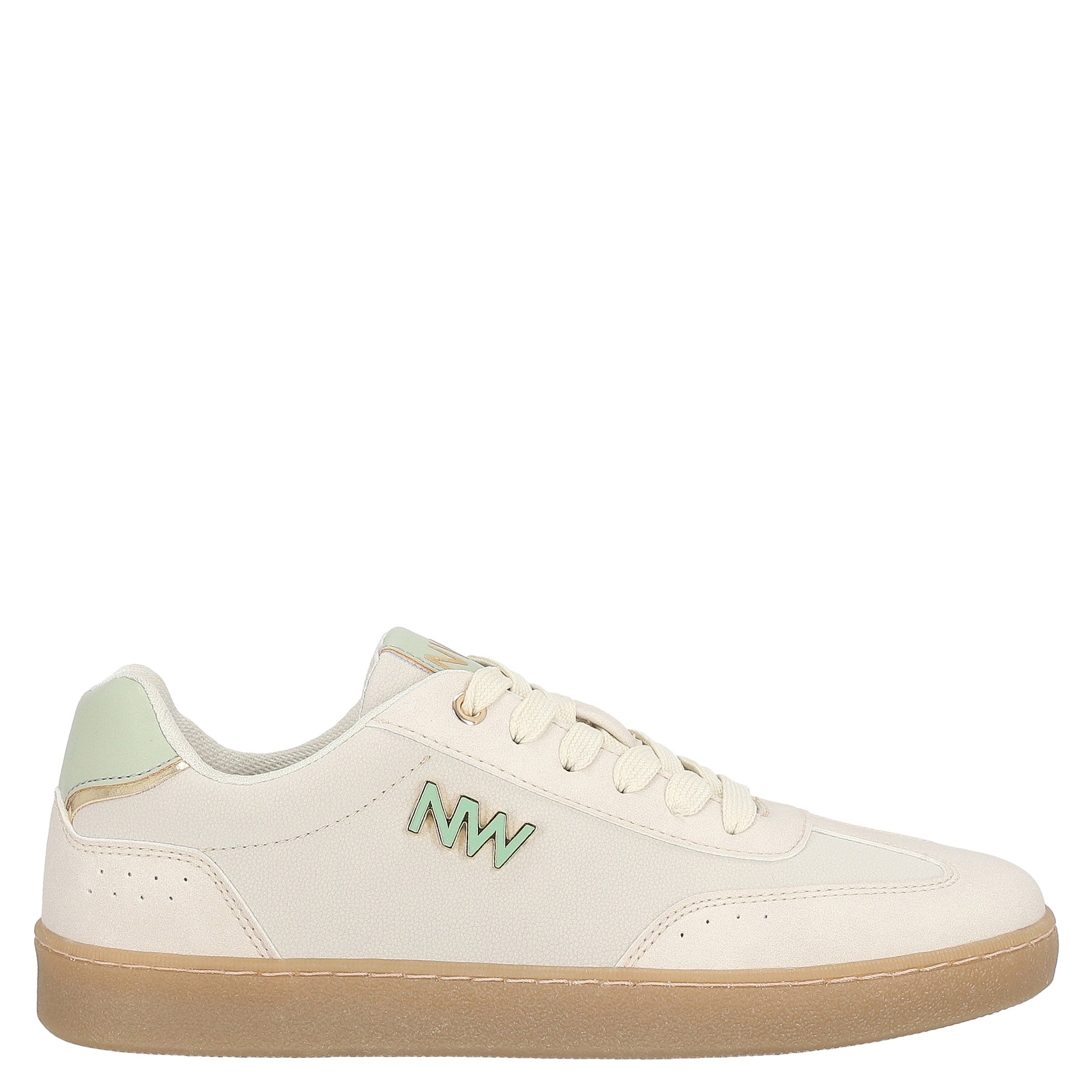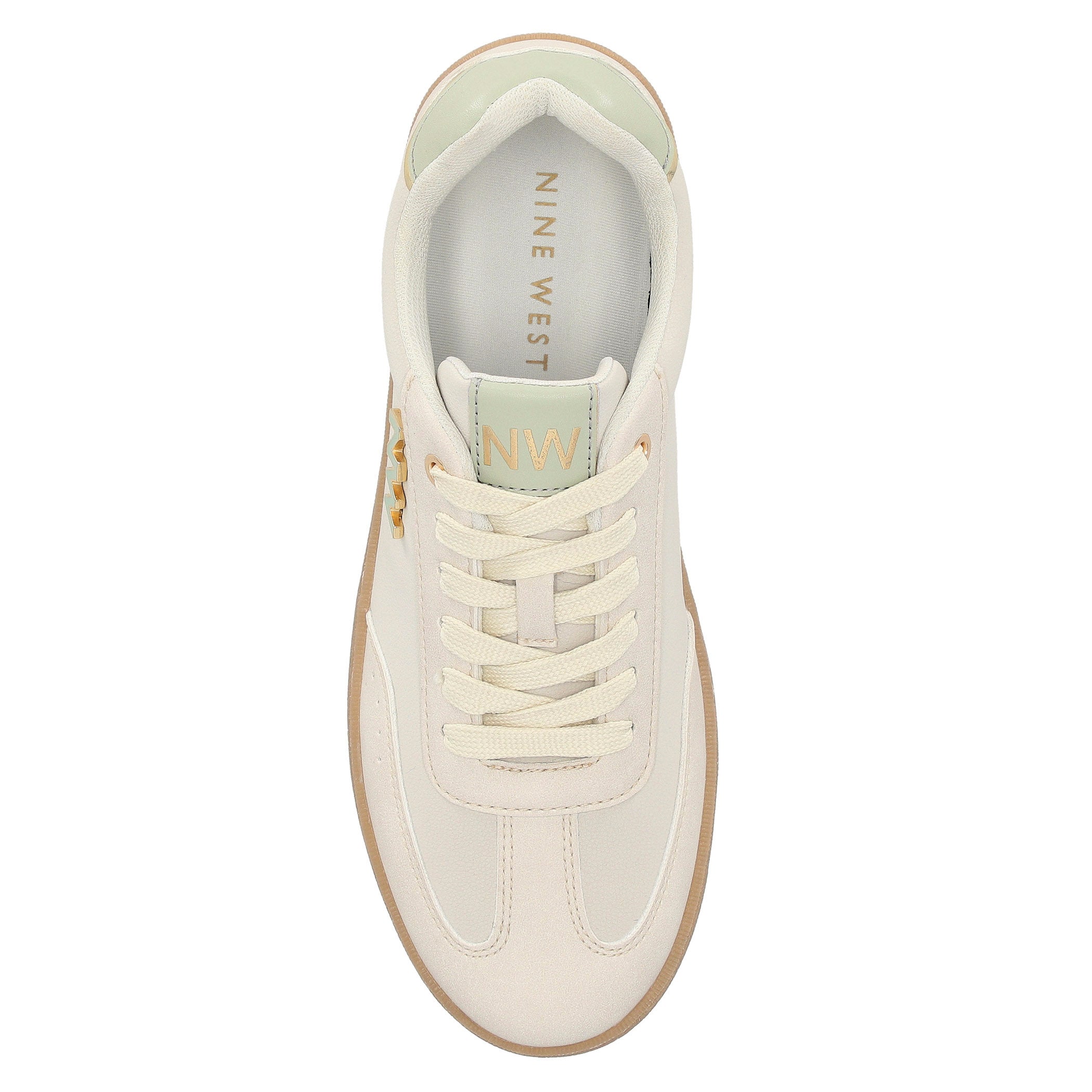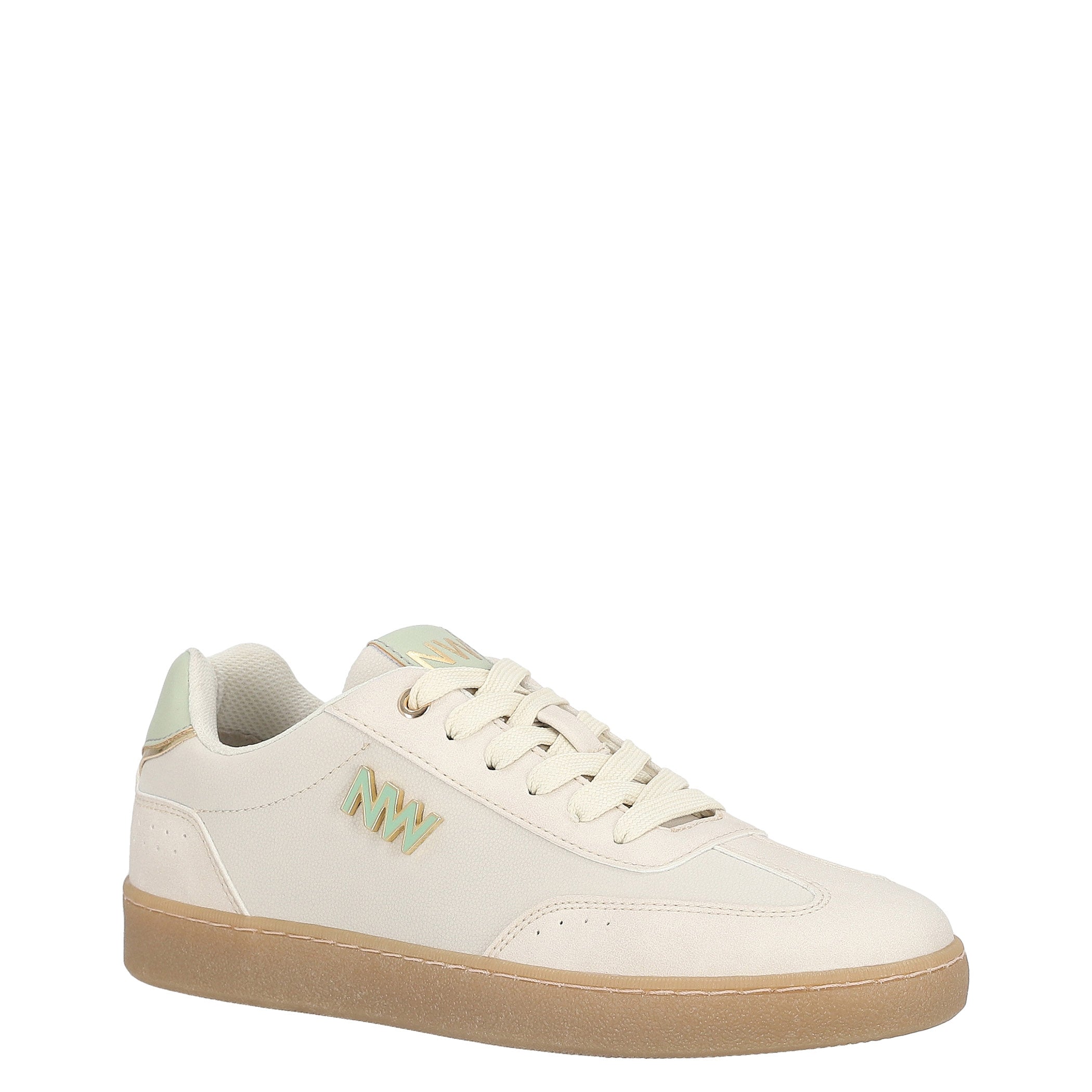 Tenis Nine West para mujer elaborado en material sintético con aplicación de herraje, estampado liso, fijación de agujeta, punta redonda, cuña flat y textura lisa.