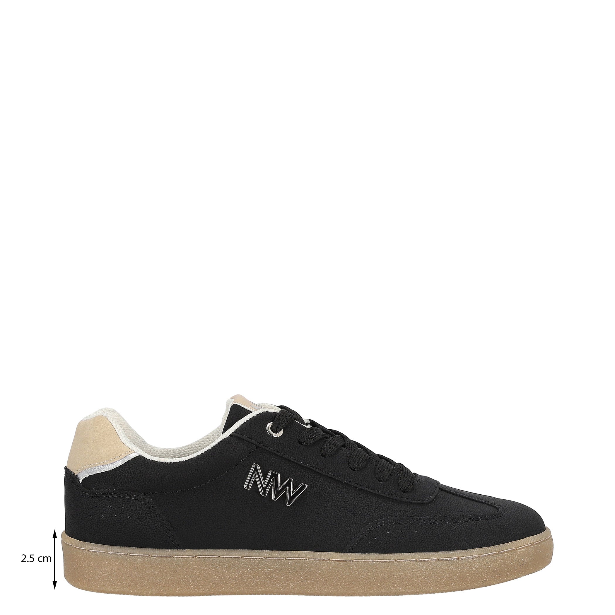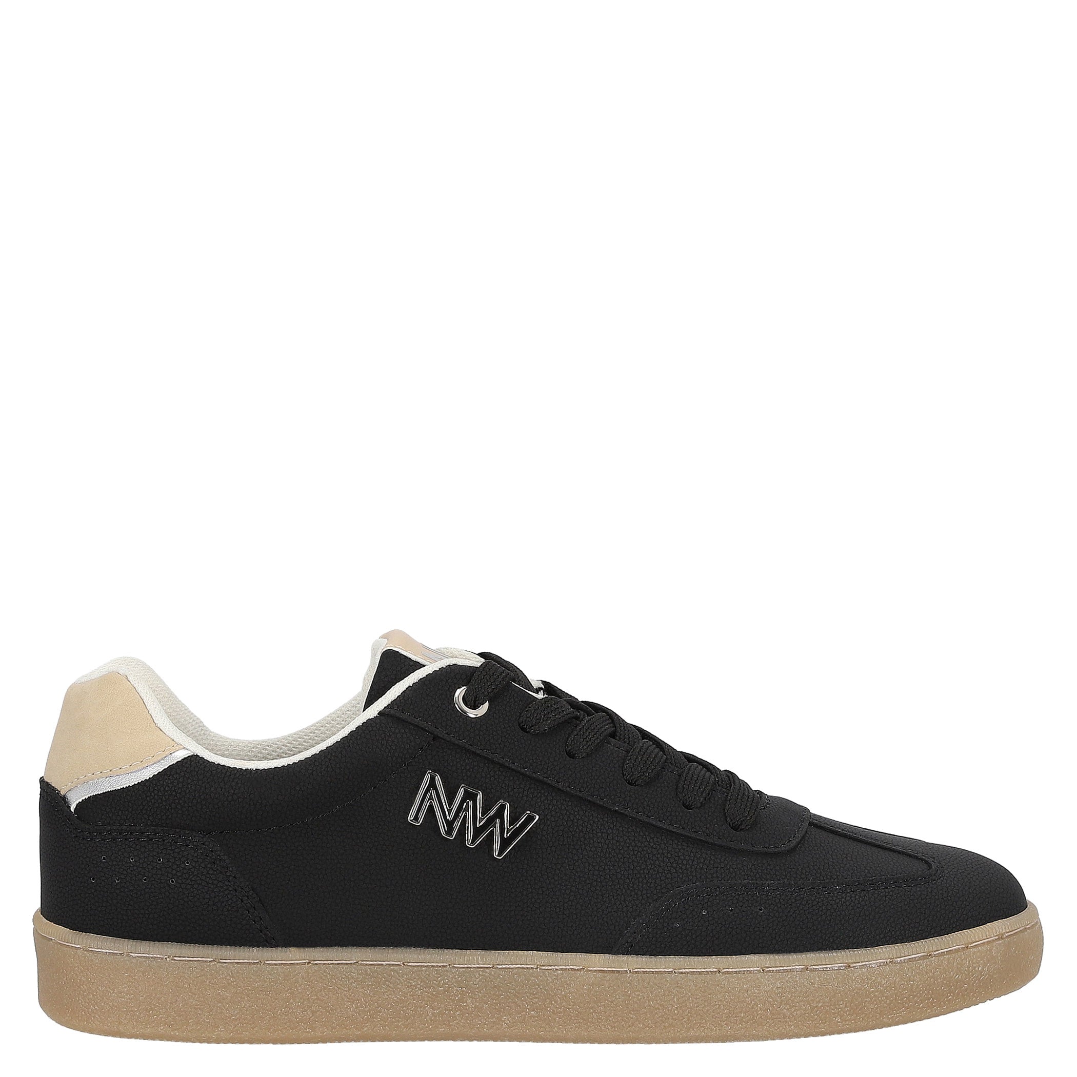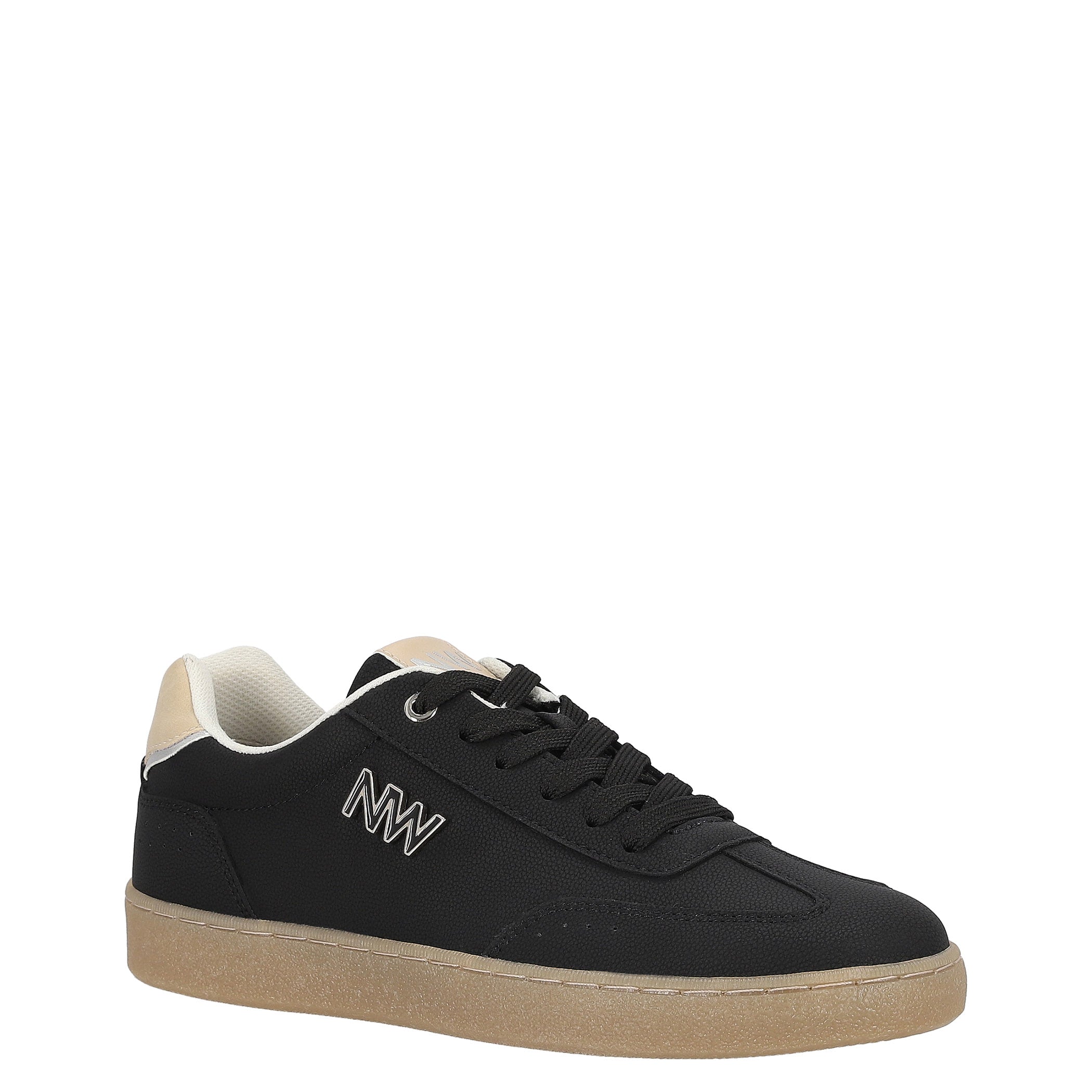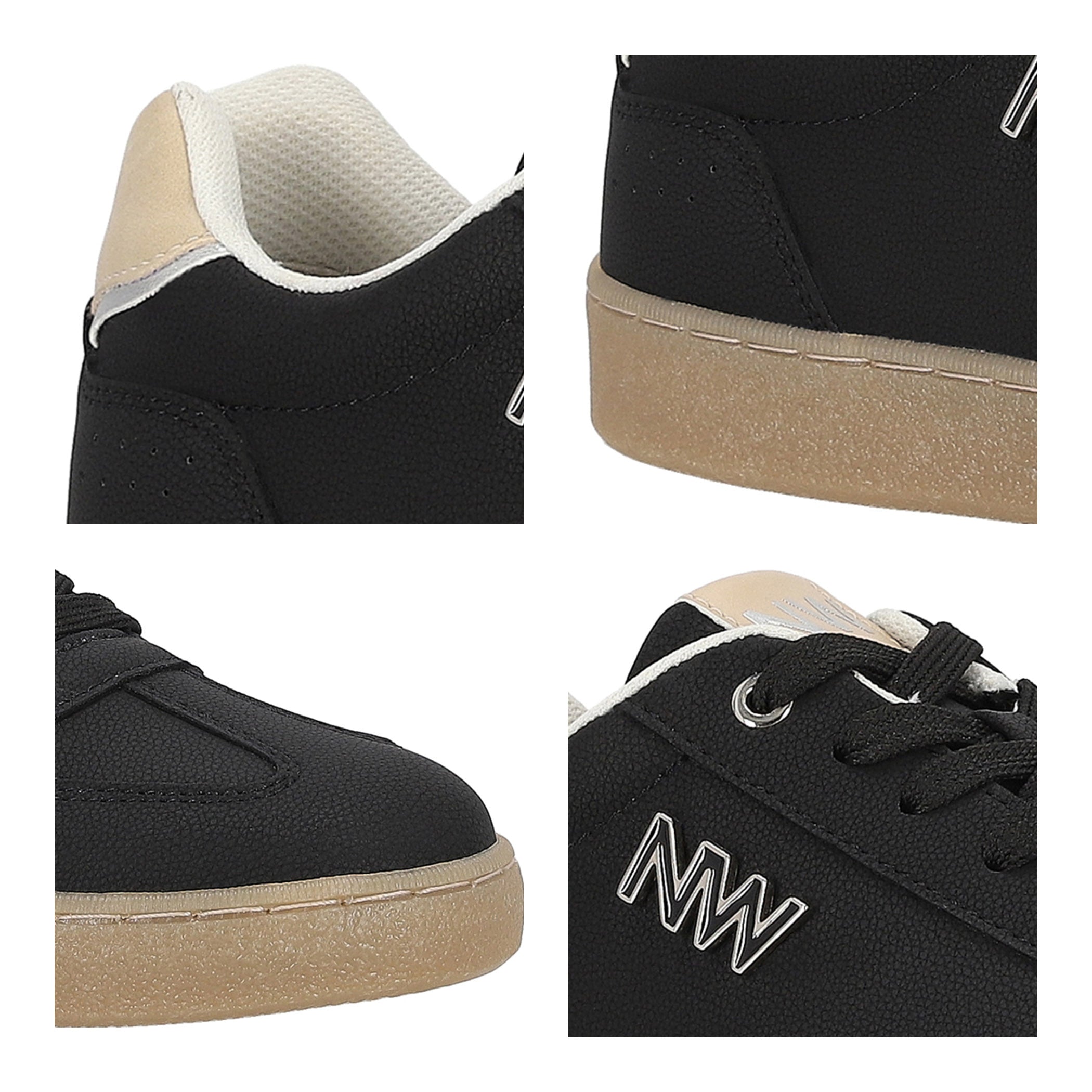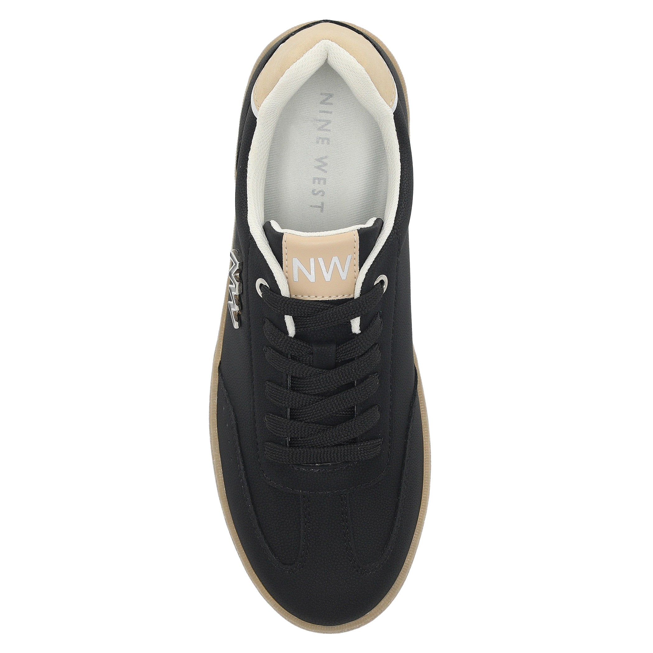 Tenis Nine West para mujer elaborado en material sintético con aplicación de herraje, estampado liso, fijación de agujeta, punta redonda, cuña flat y textura lisa.