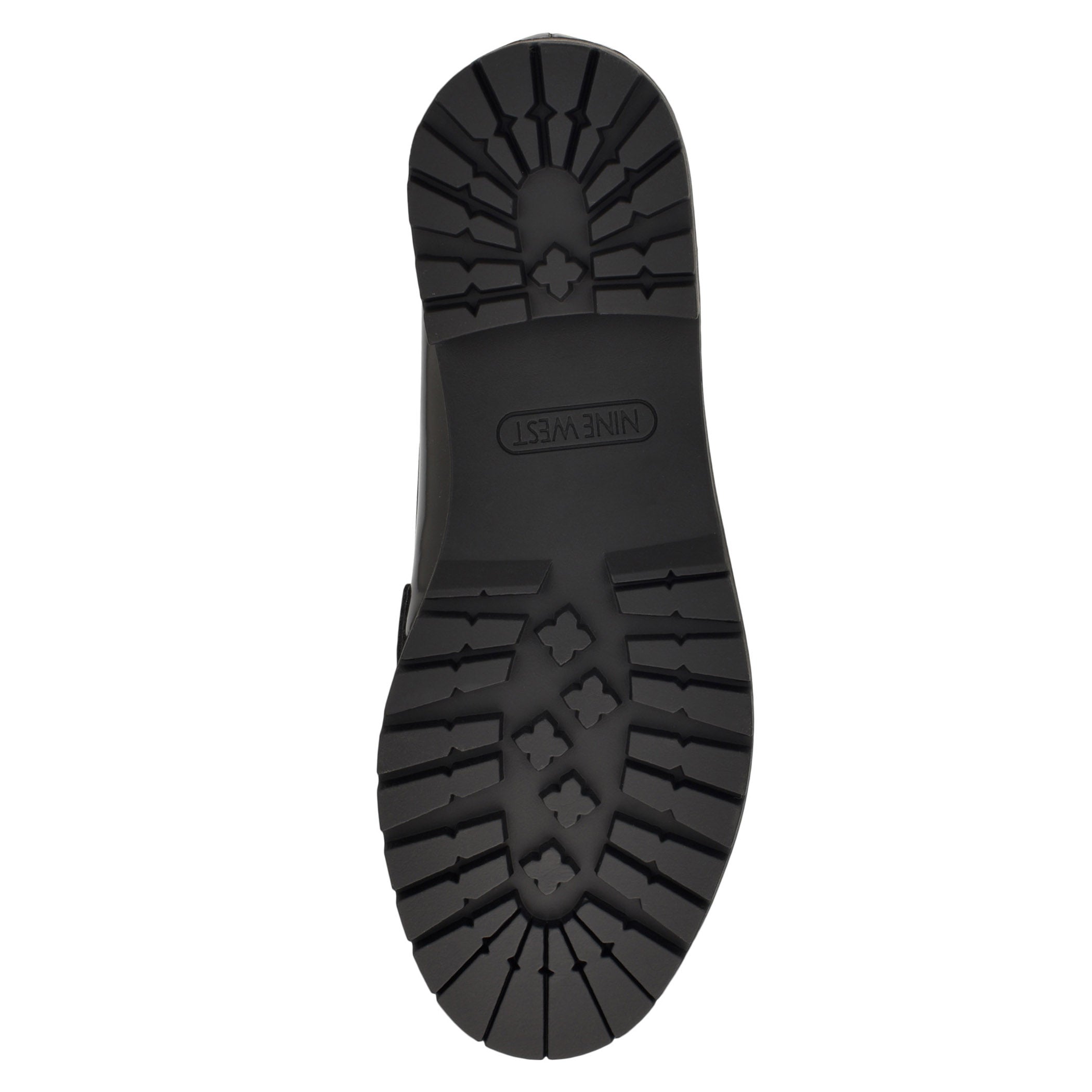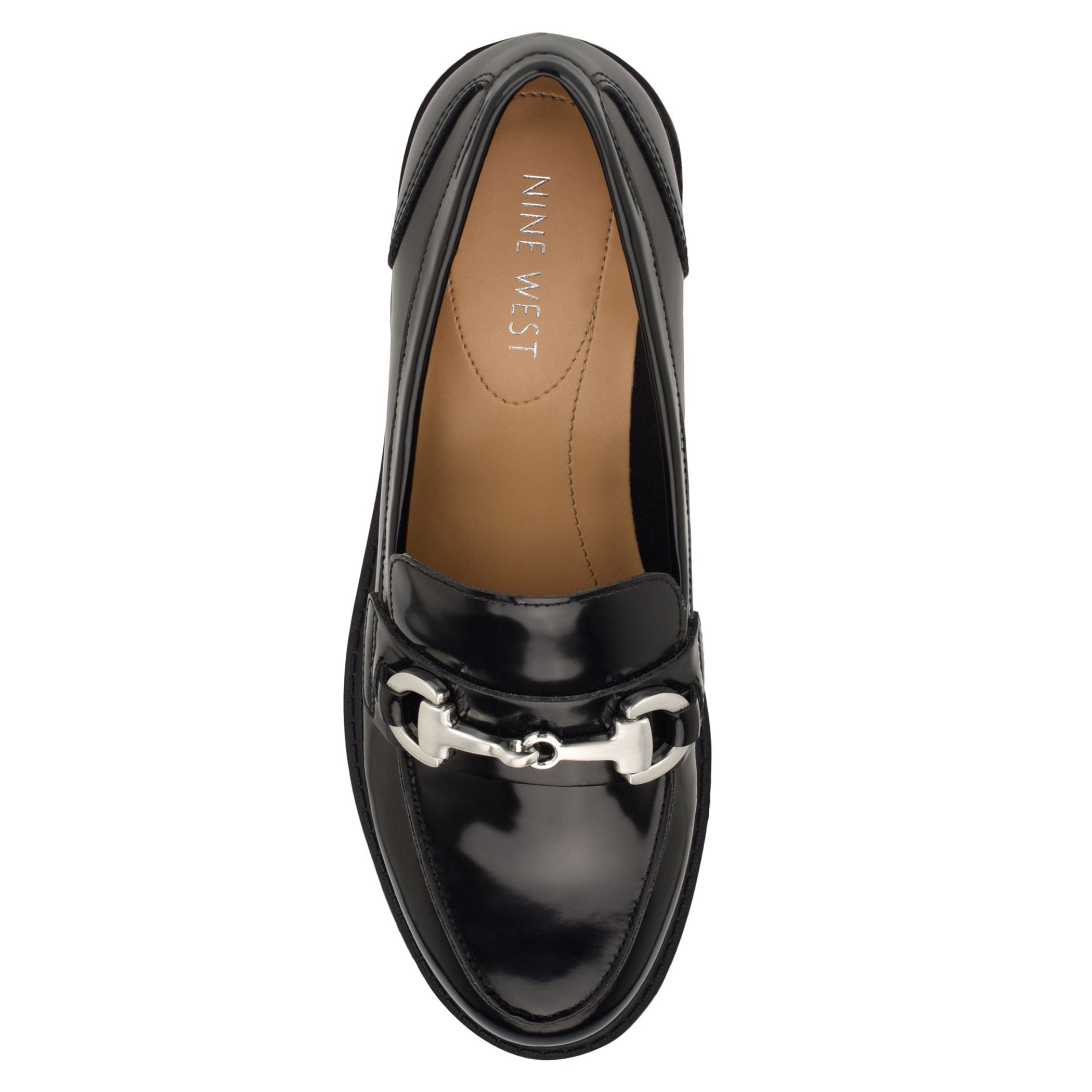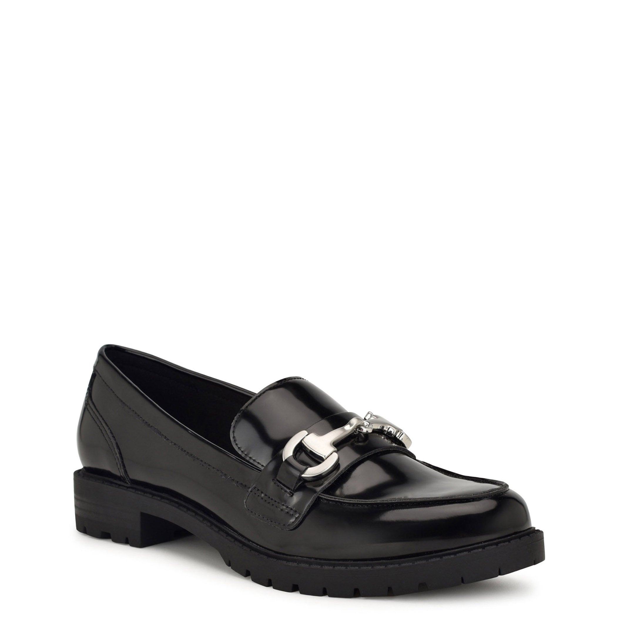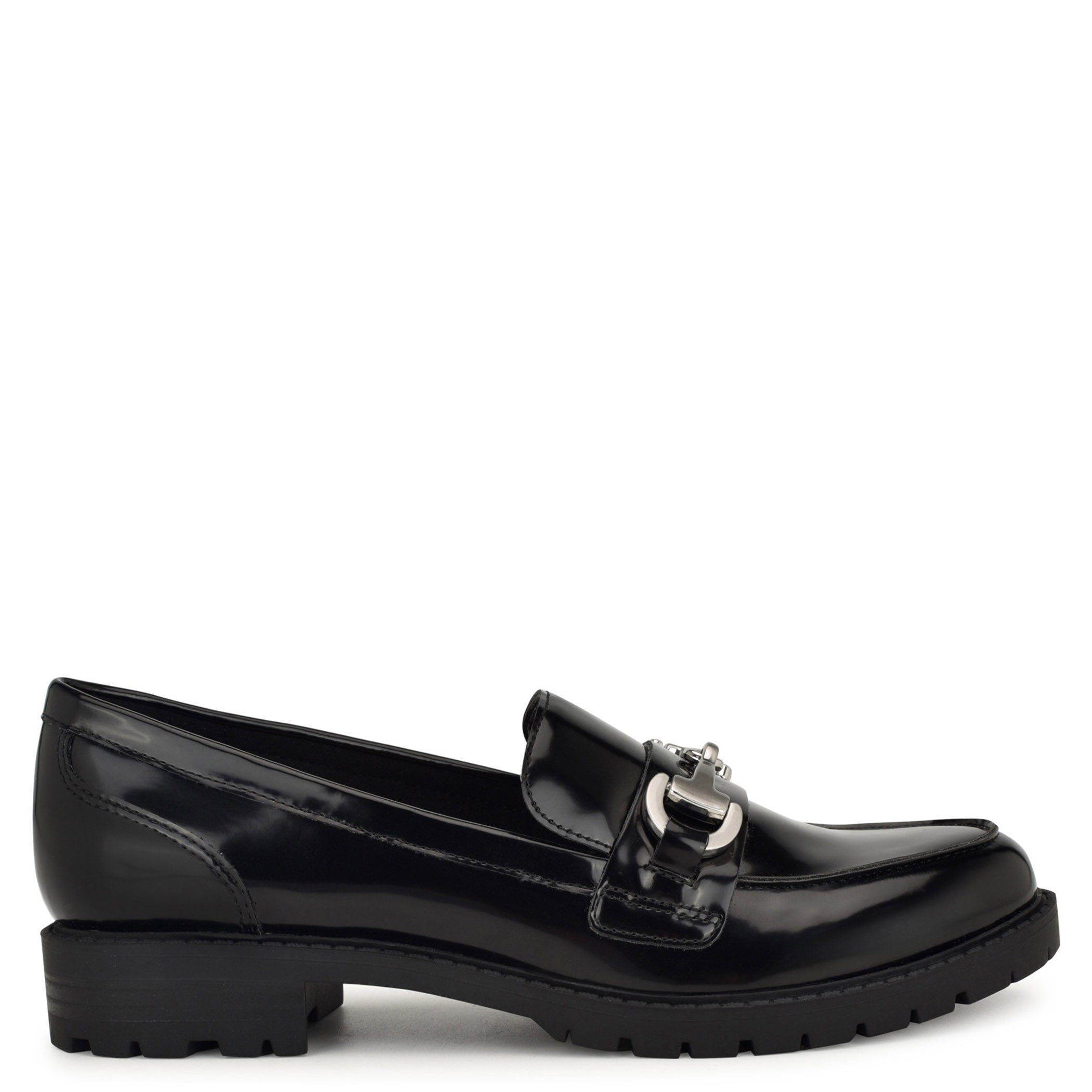 Zapato tipo mocasín Nine West para mujer elaborado en material de charol con aplicación de herraje, estampado liso, fijación abierta, punta redonda y textura lisa.