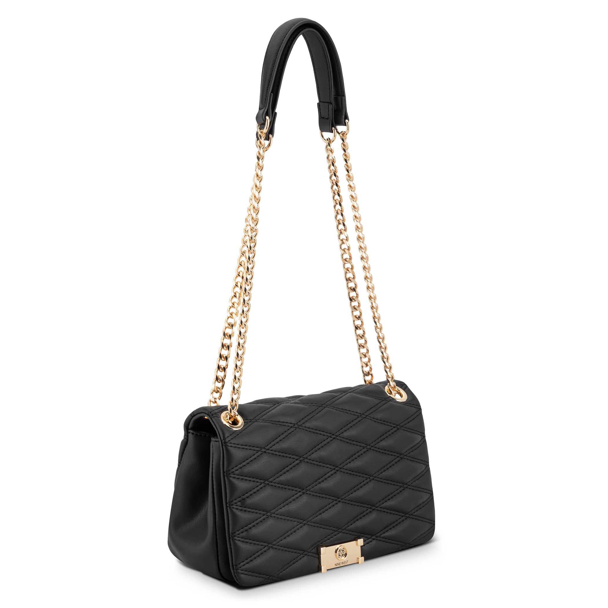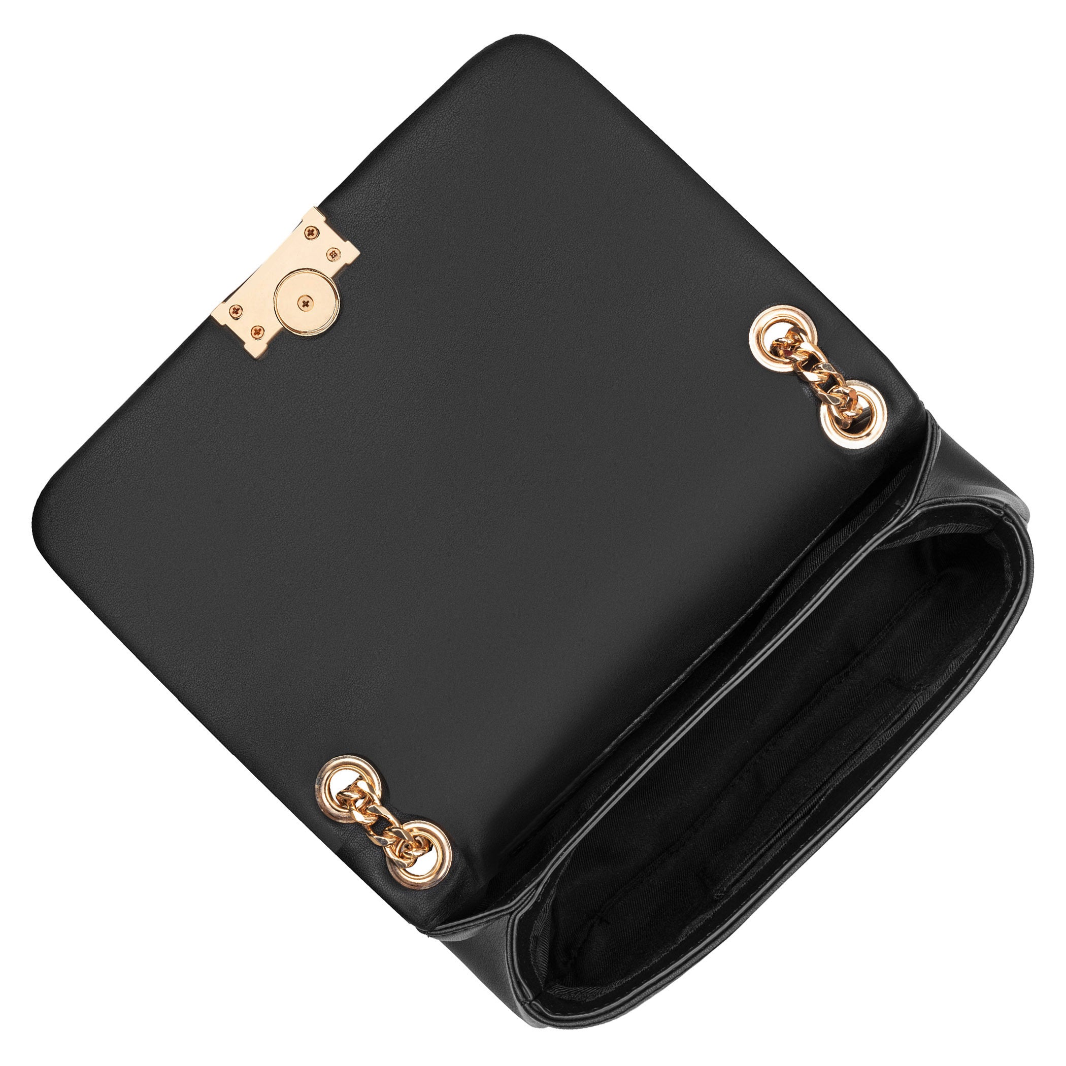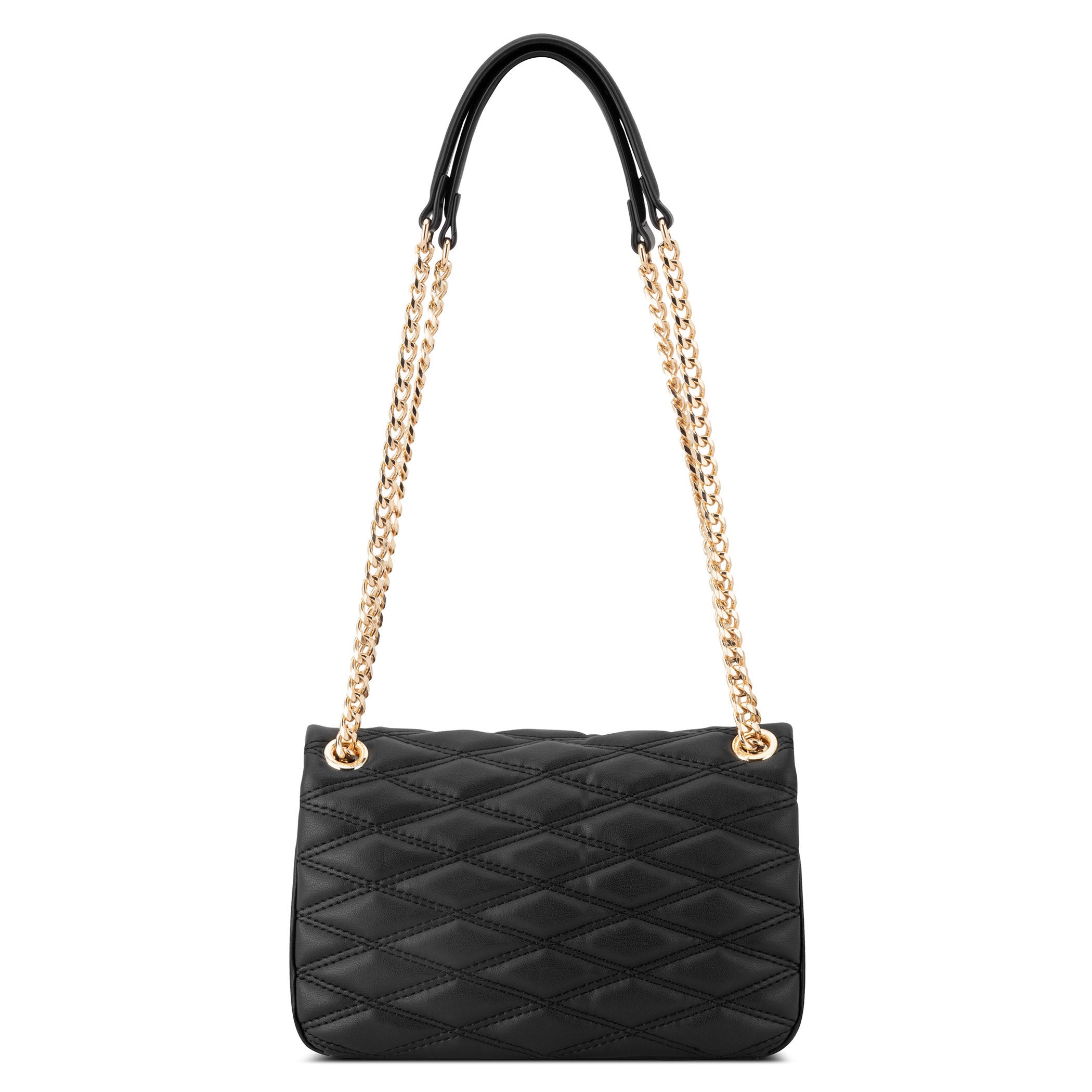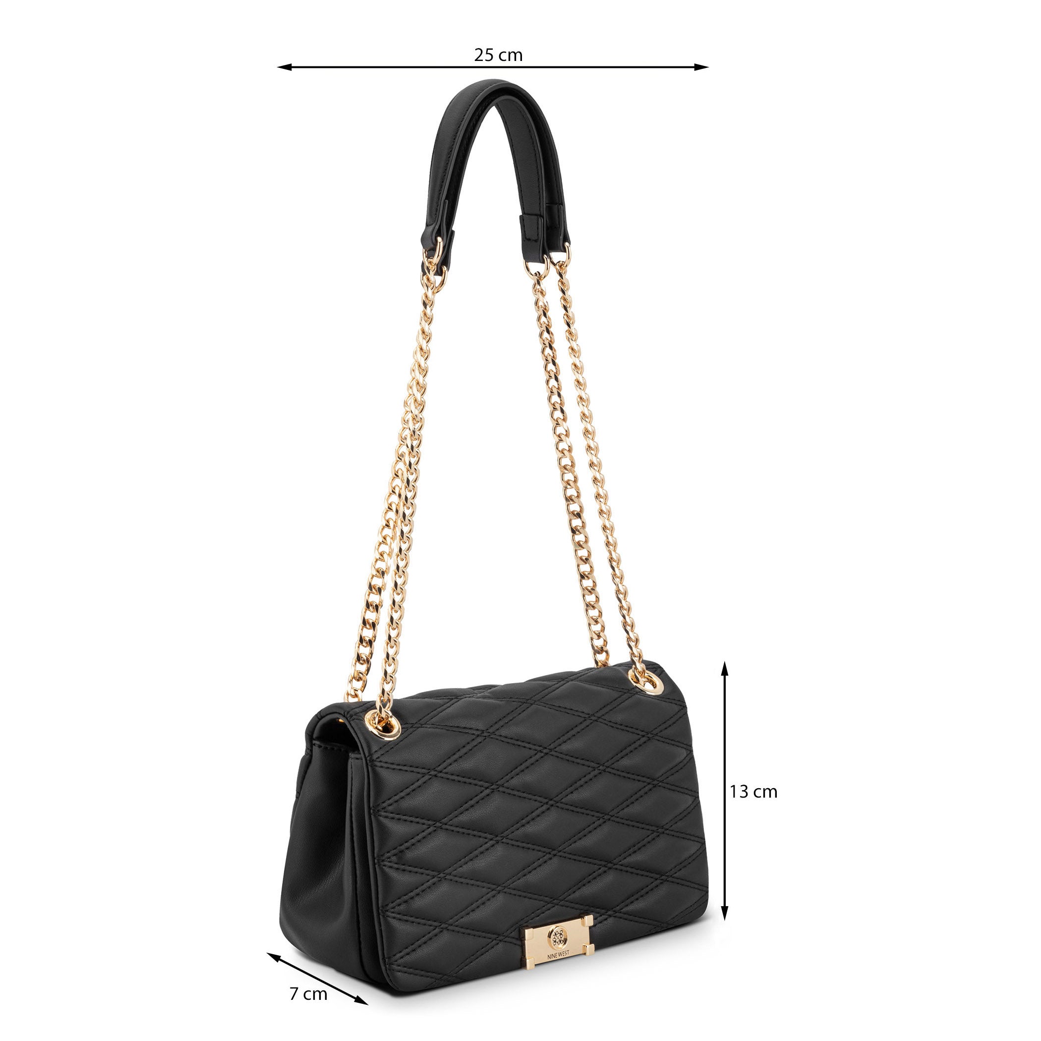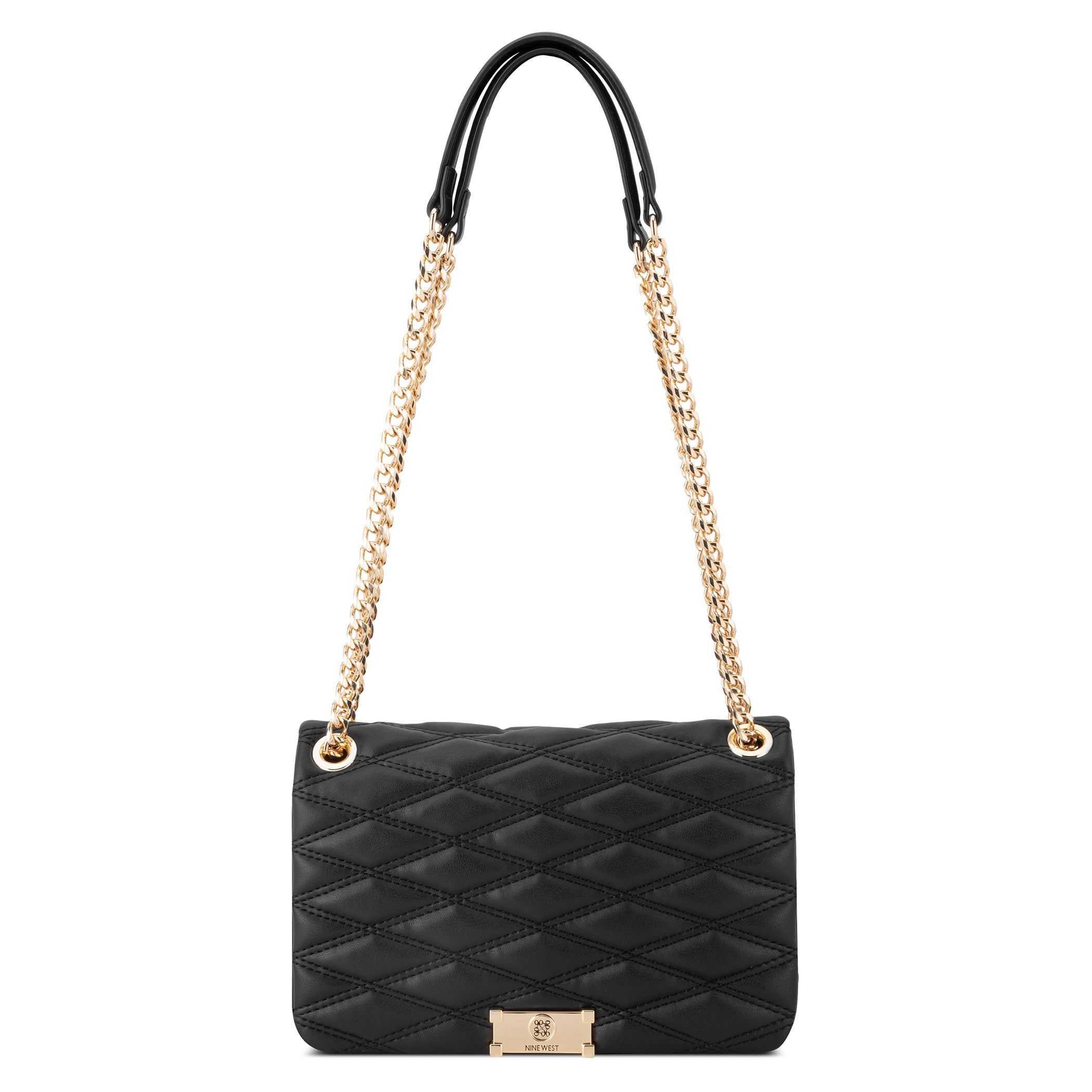 Elaborada en material sintético con textura capitonada, esta bolsa crossbody destaca por su acabado acolchado y herrajes dorados que realzan su estilo sofisticado. El logo metálico de Nine West al frente aporta un toque distintivo. Cuenta con cierre imantado y múltiples compartimentos internos que facilitan la organización. Su cadena con detalle de piel permite llevarla cómodamente al hombro o cruzada, ideal para elevar cualquier look.