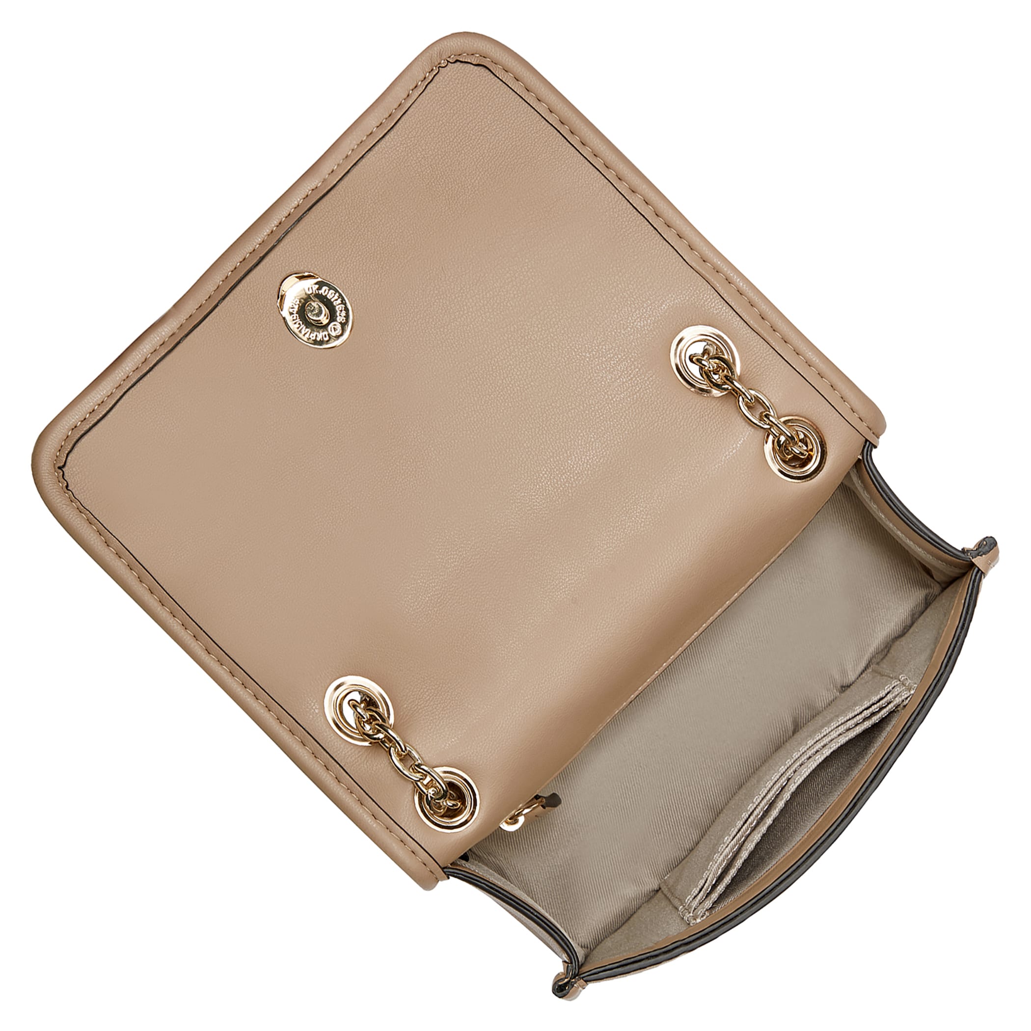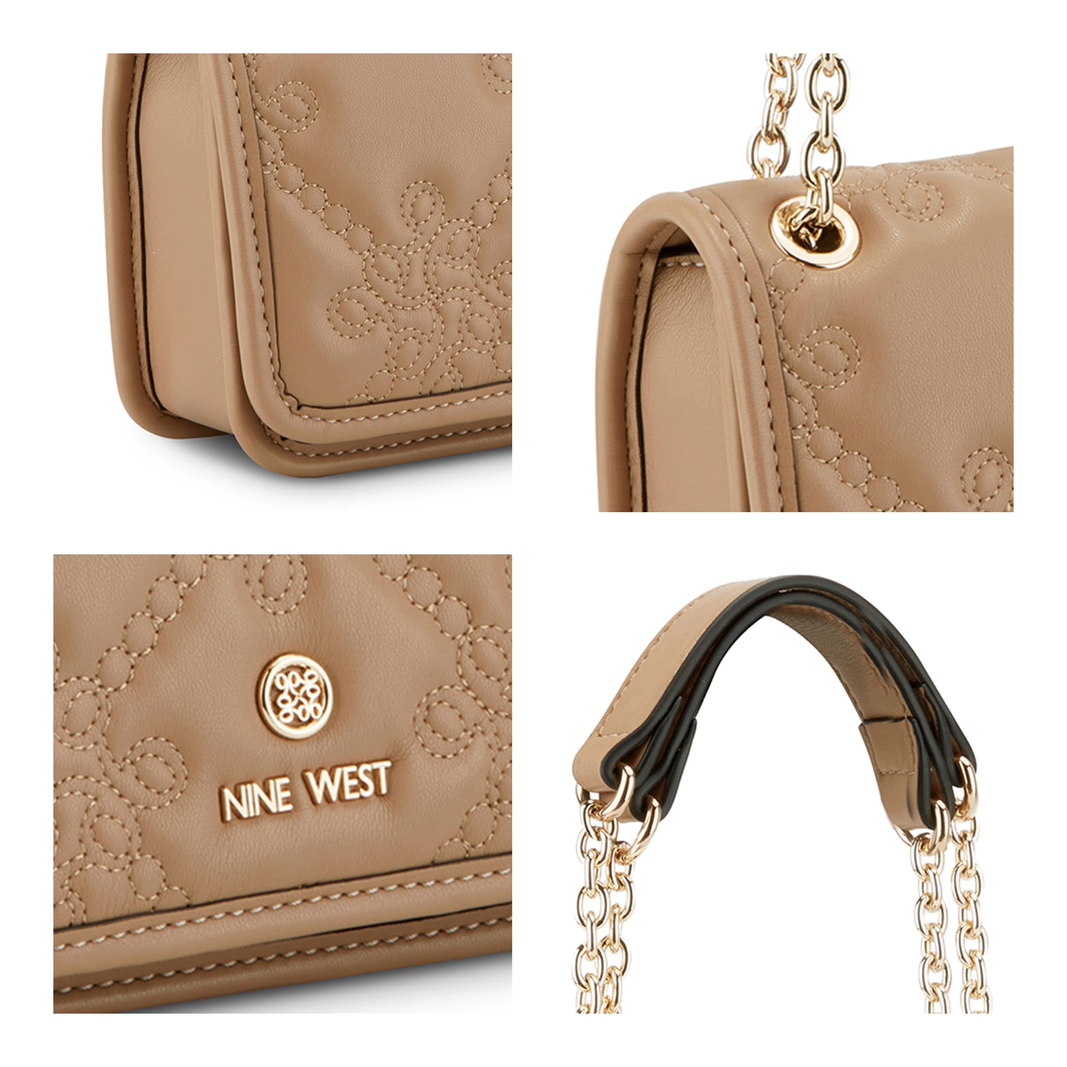Bolsa crossbody Nine West para mujer elaborado en material sintético con aplicación de accesorio dorado, forro textil, fijación de cierre y textura lisa.