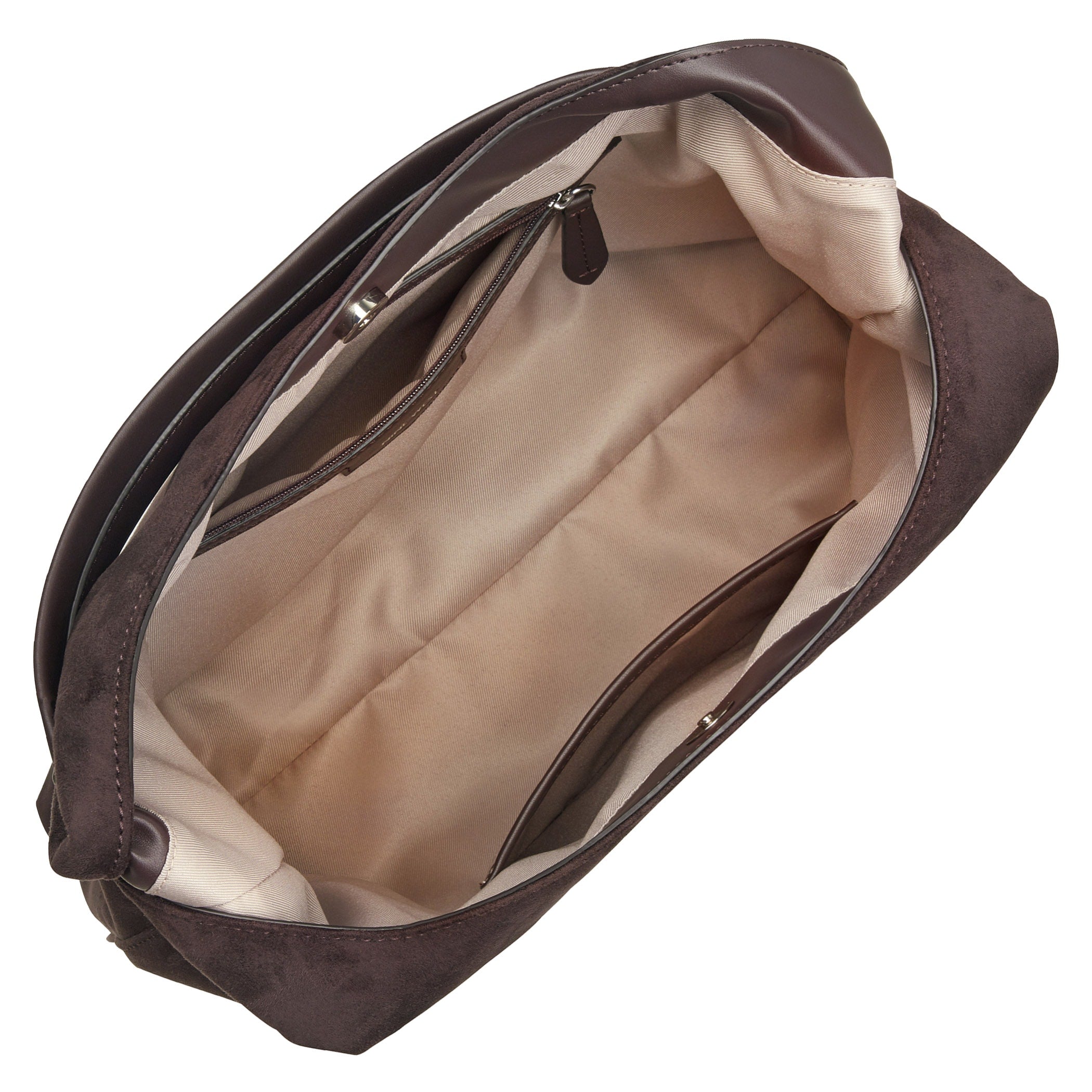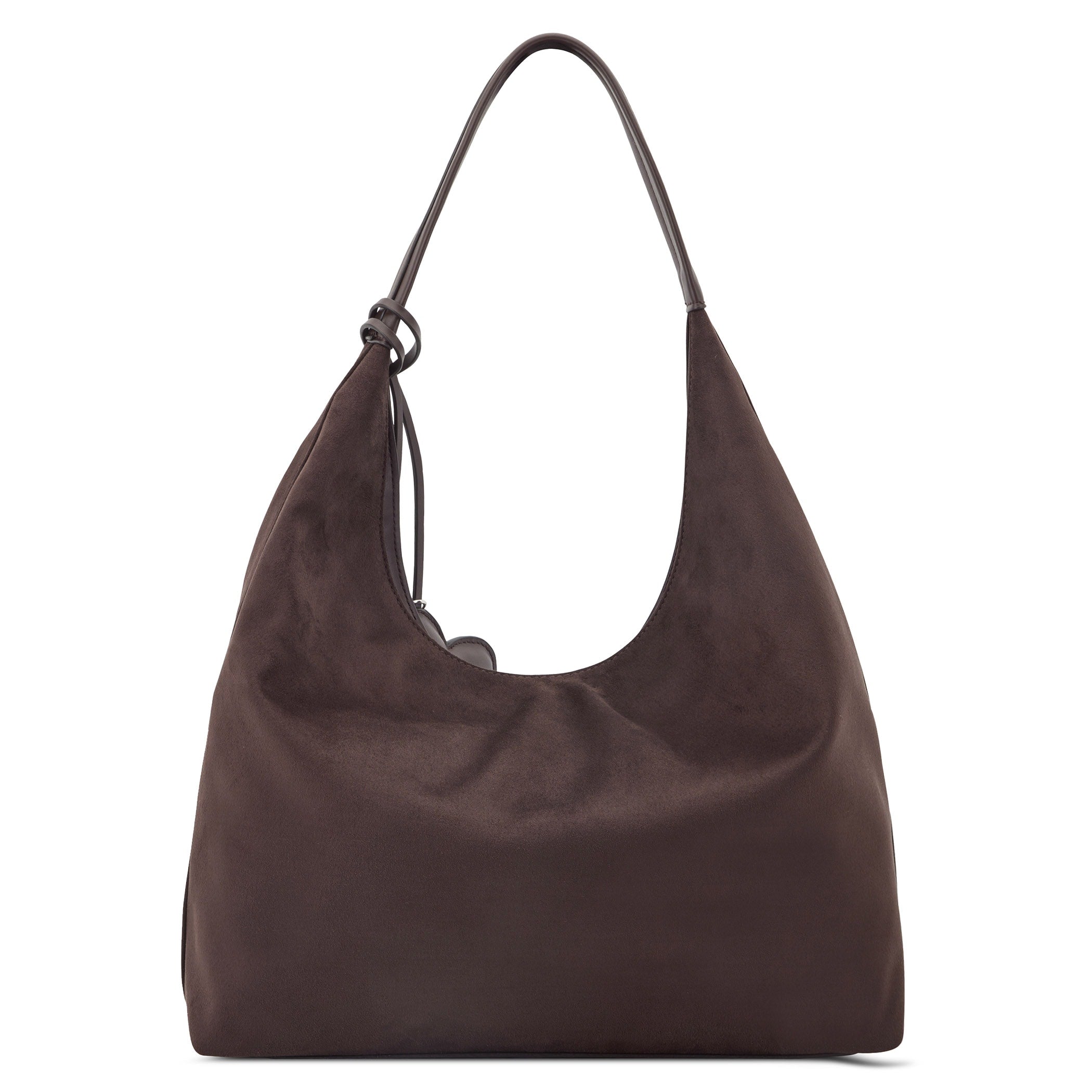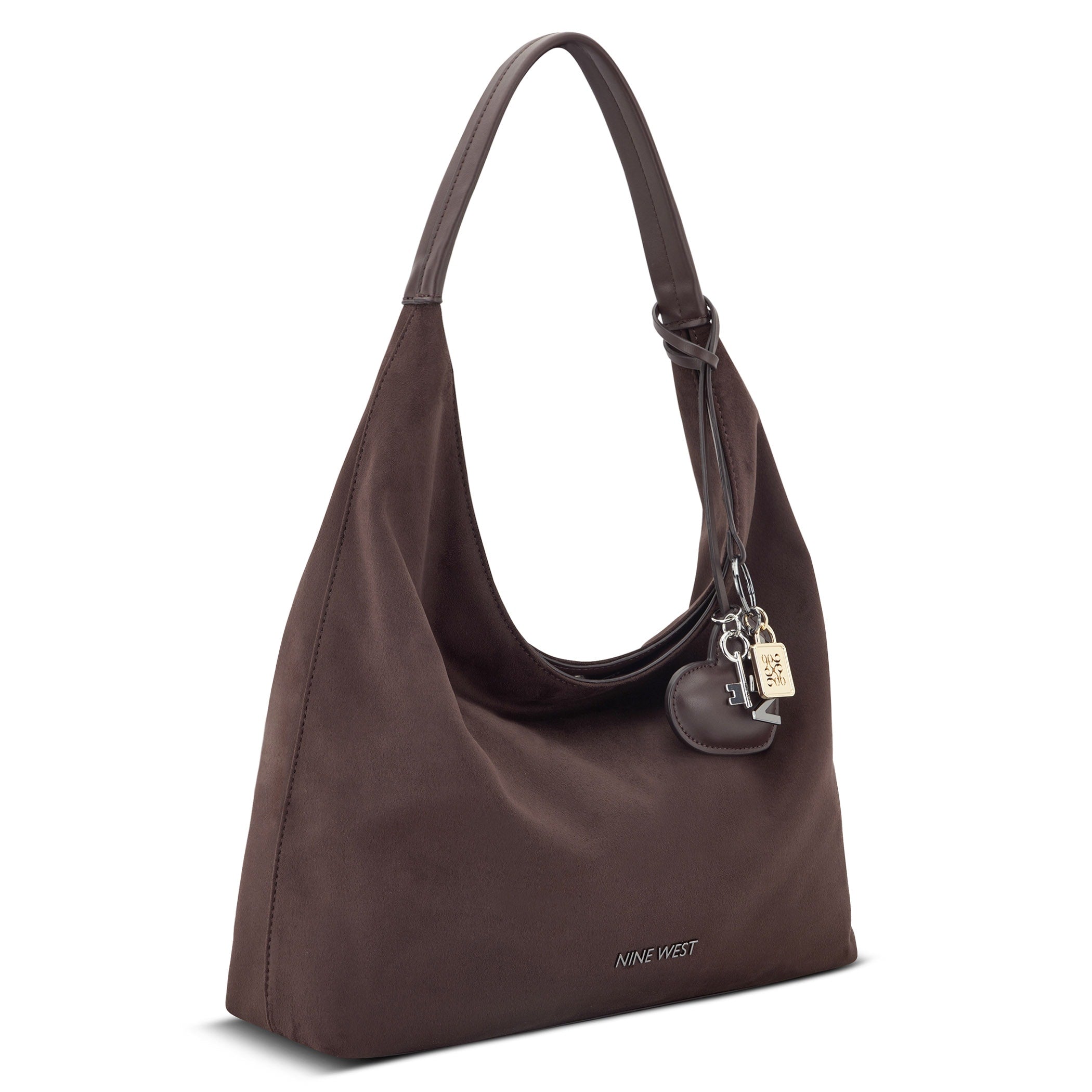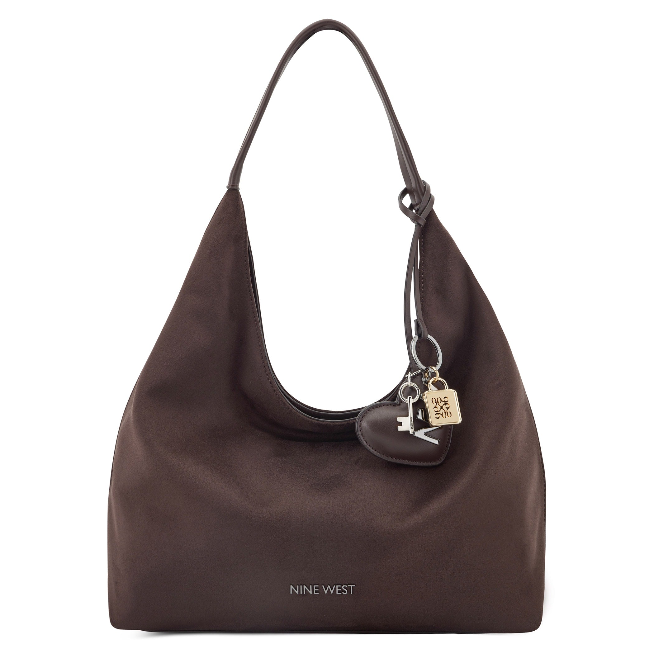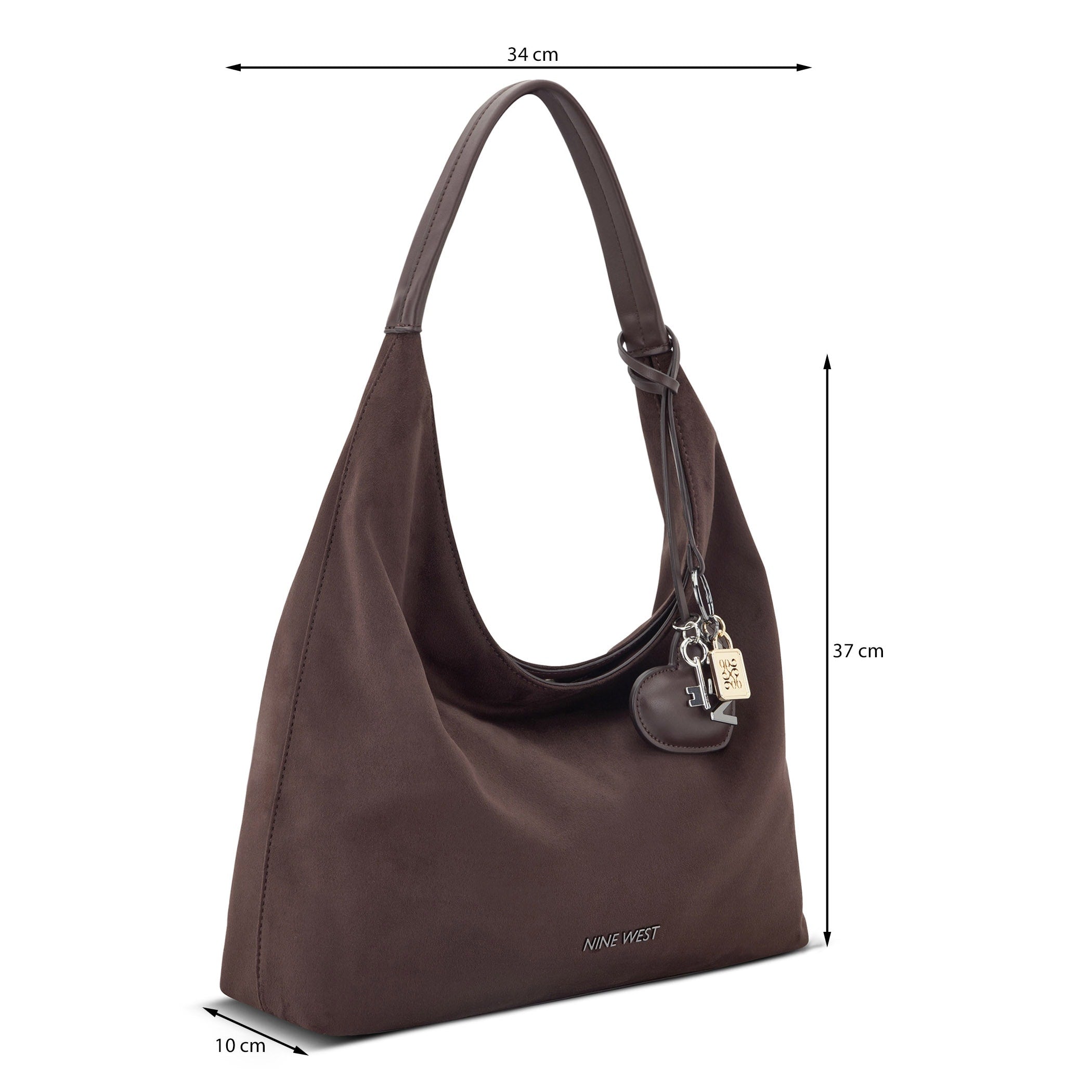 Bolsa hobo Nine West para mujer elaborada en material gamuza con aplicación de accesorio dorado, estampado liso, fijación de imán y textura lisa.