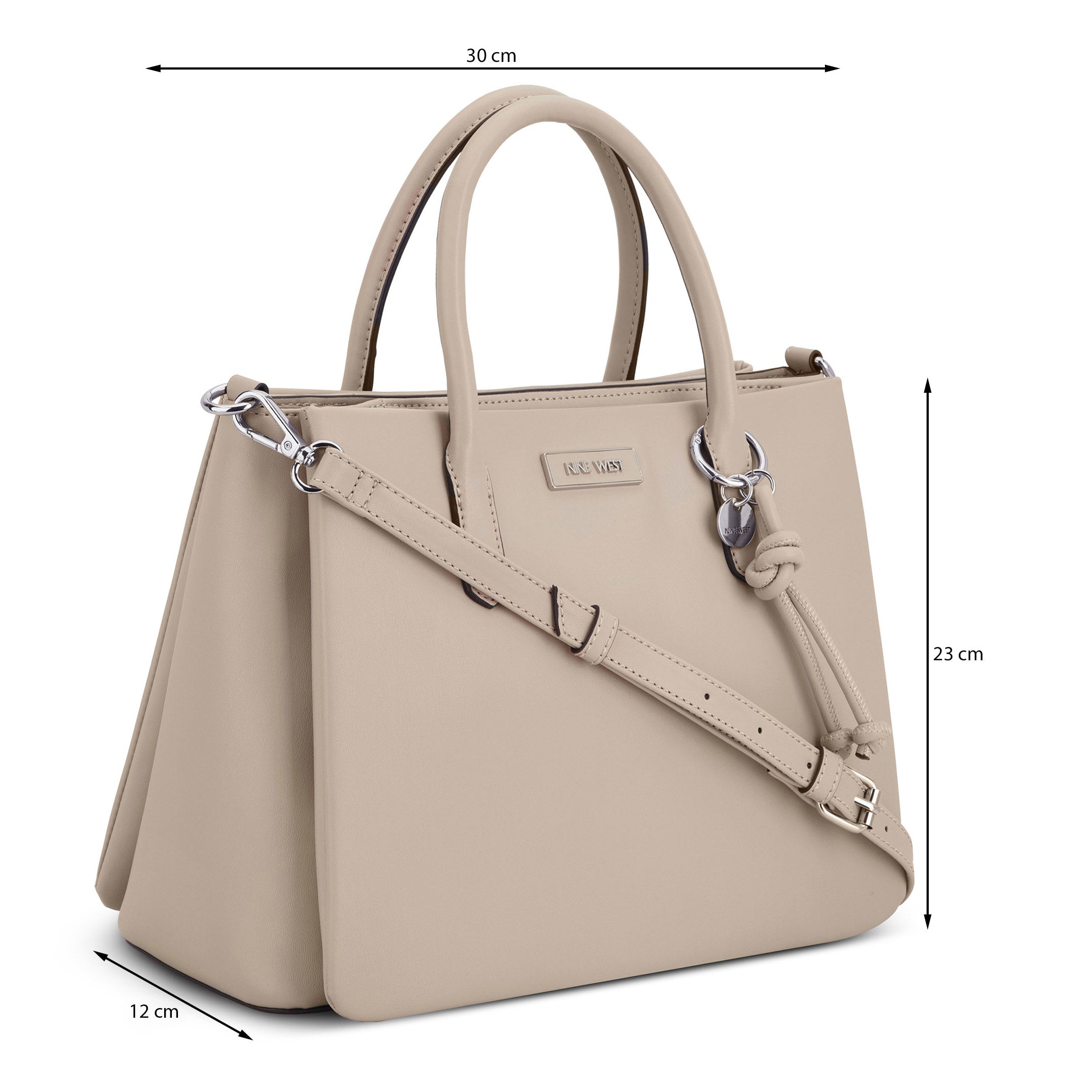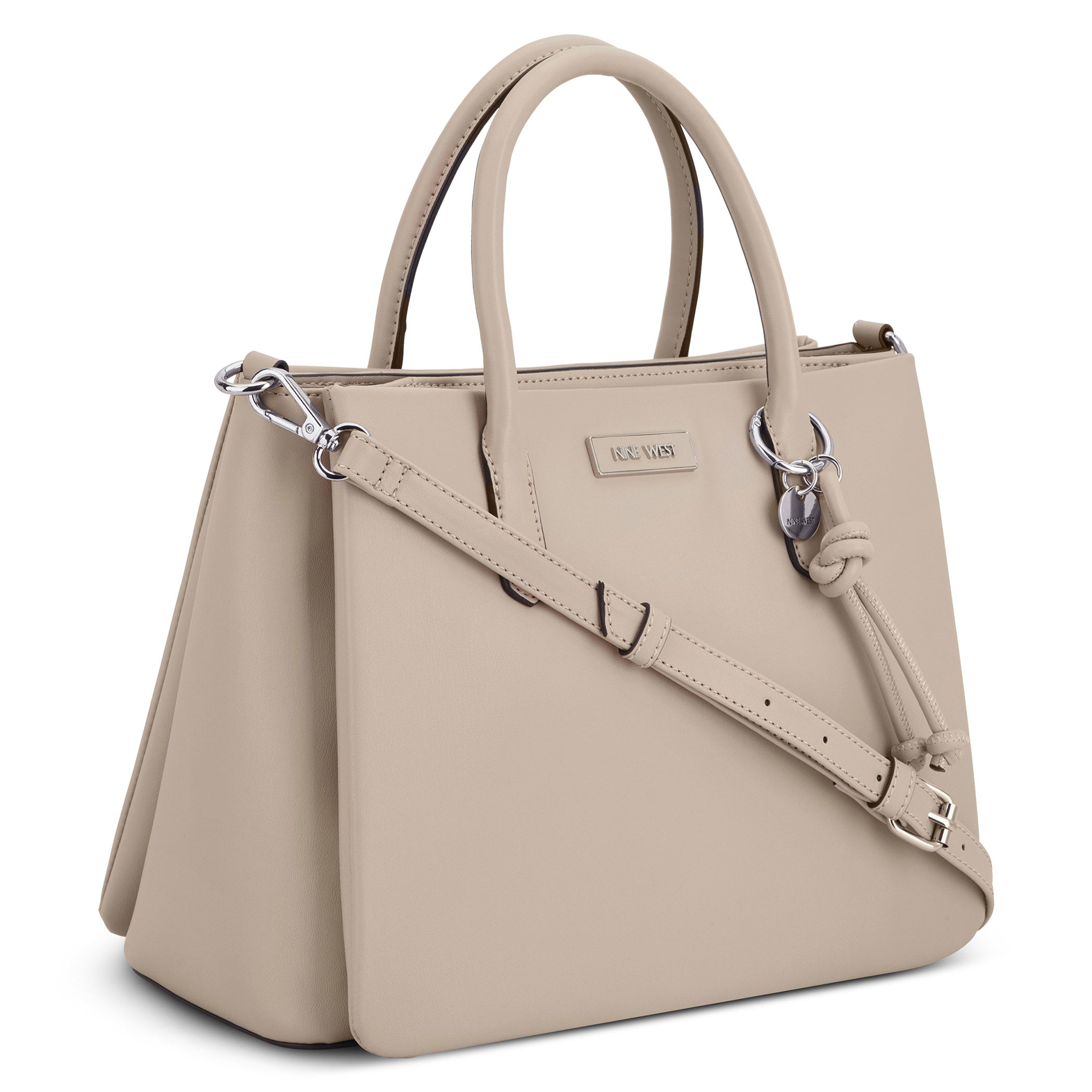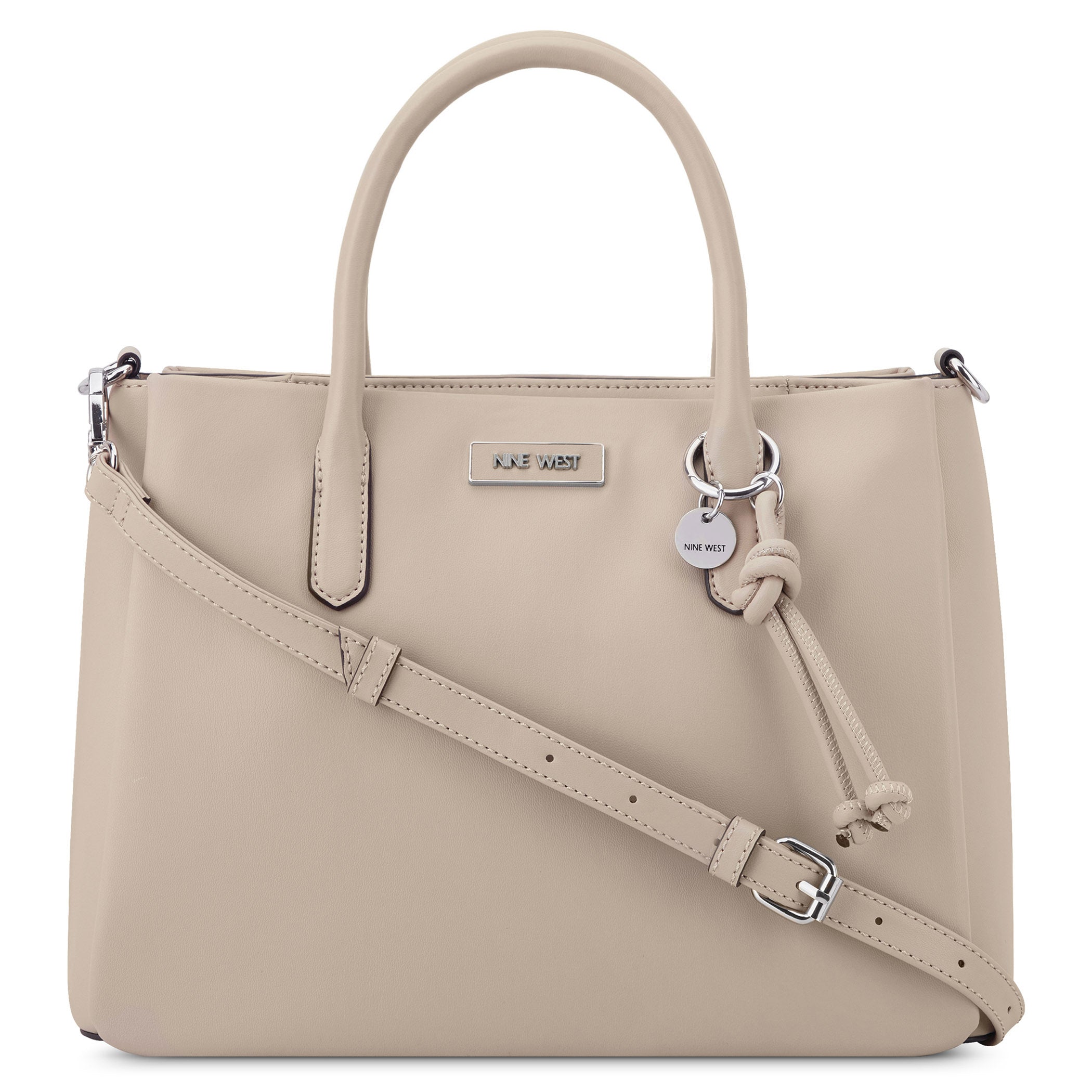 Bolsa de mano Nine West para mujer elaborada en material sintético con aplicación de accesorio plateado, estampado liso, fijación de cierre y textura lisa.