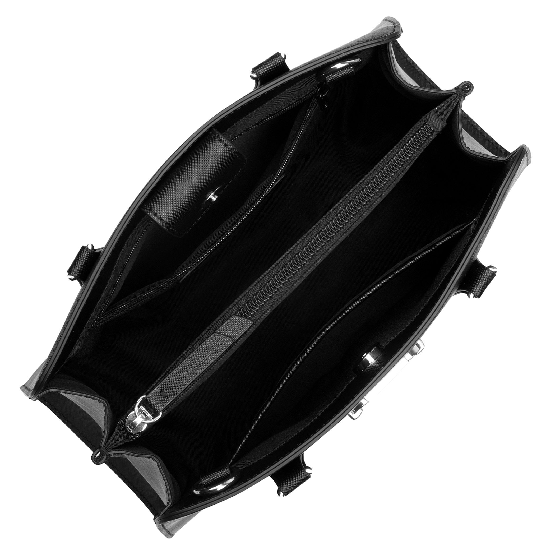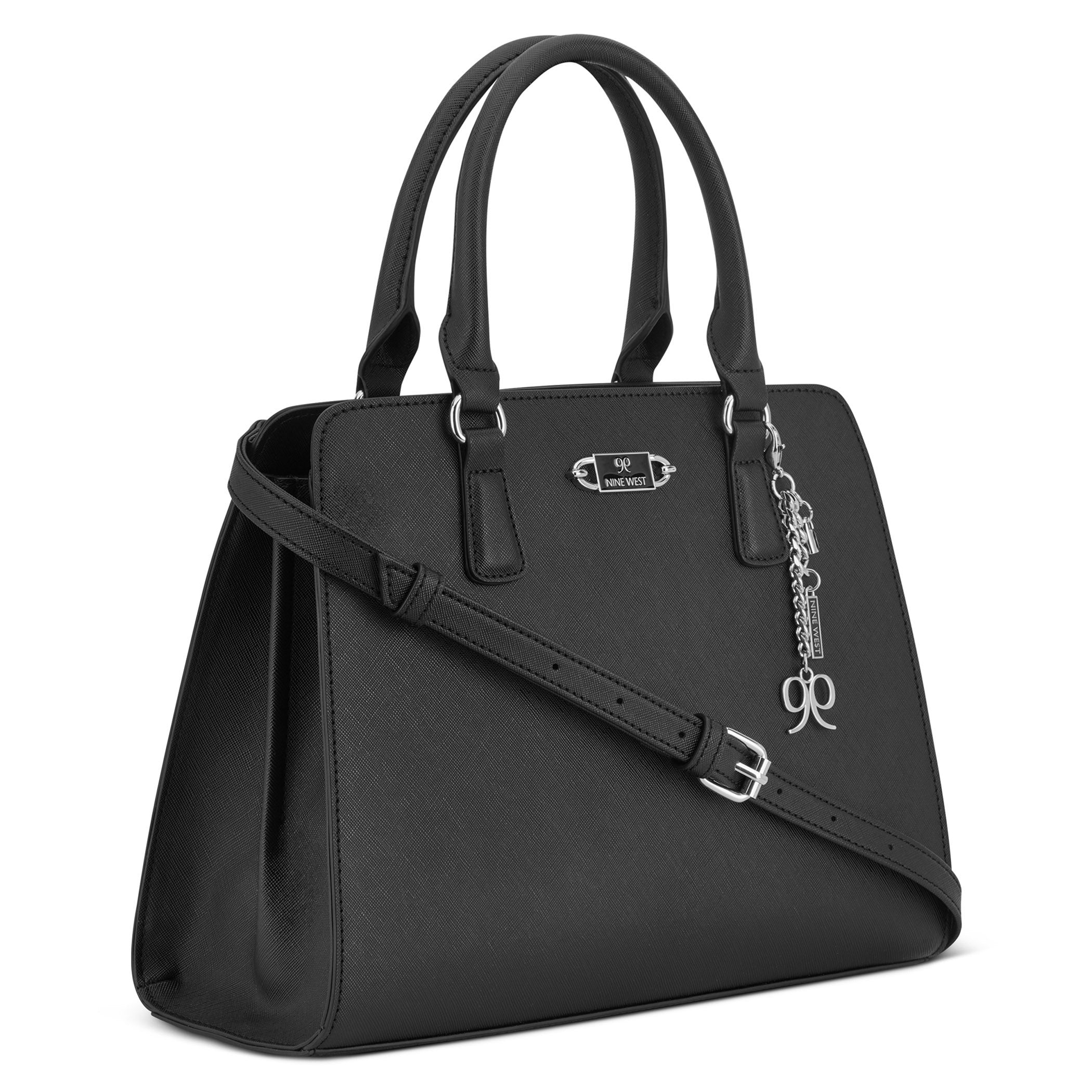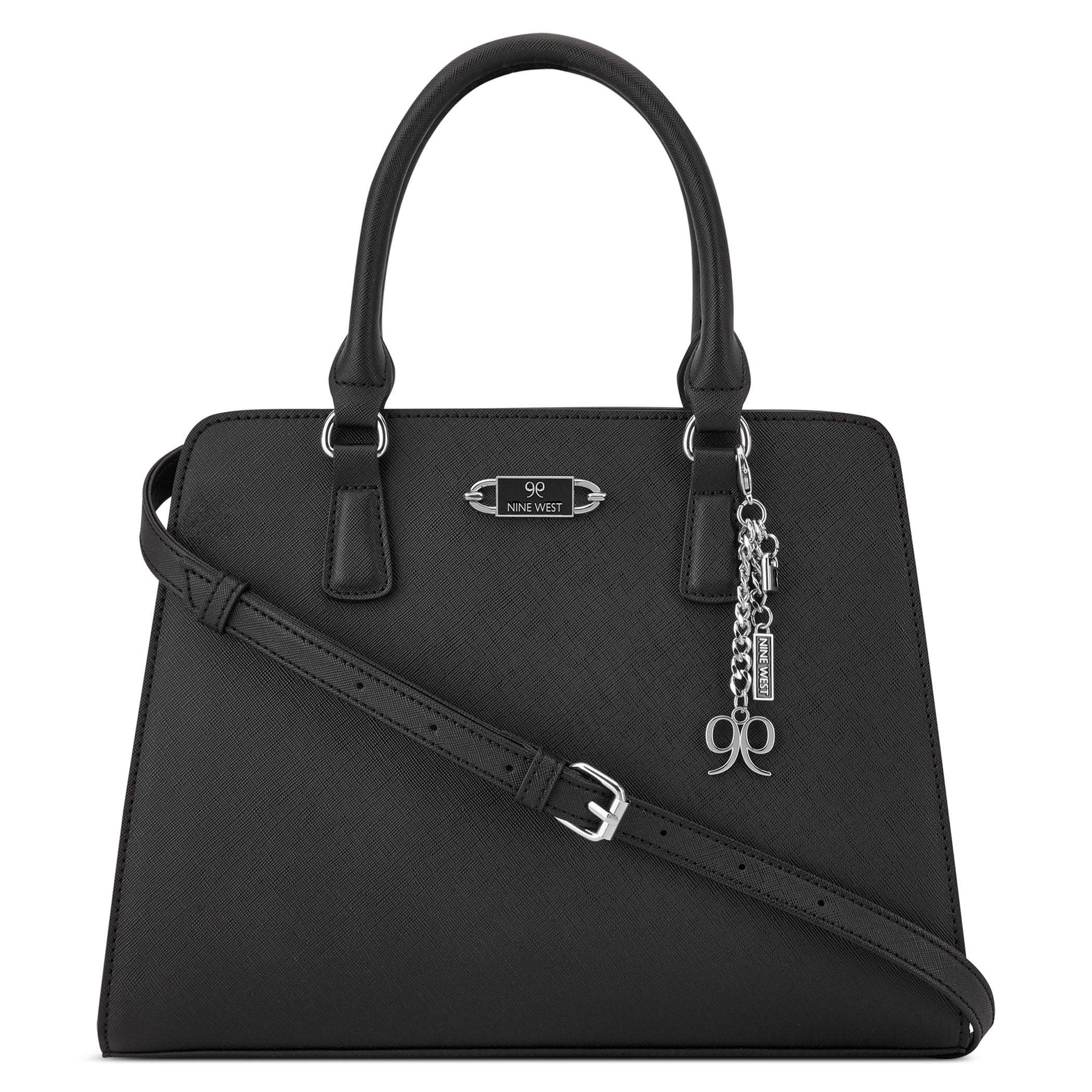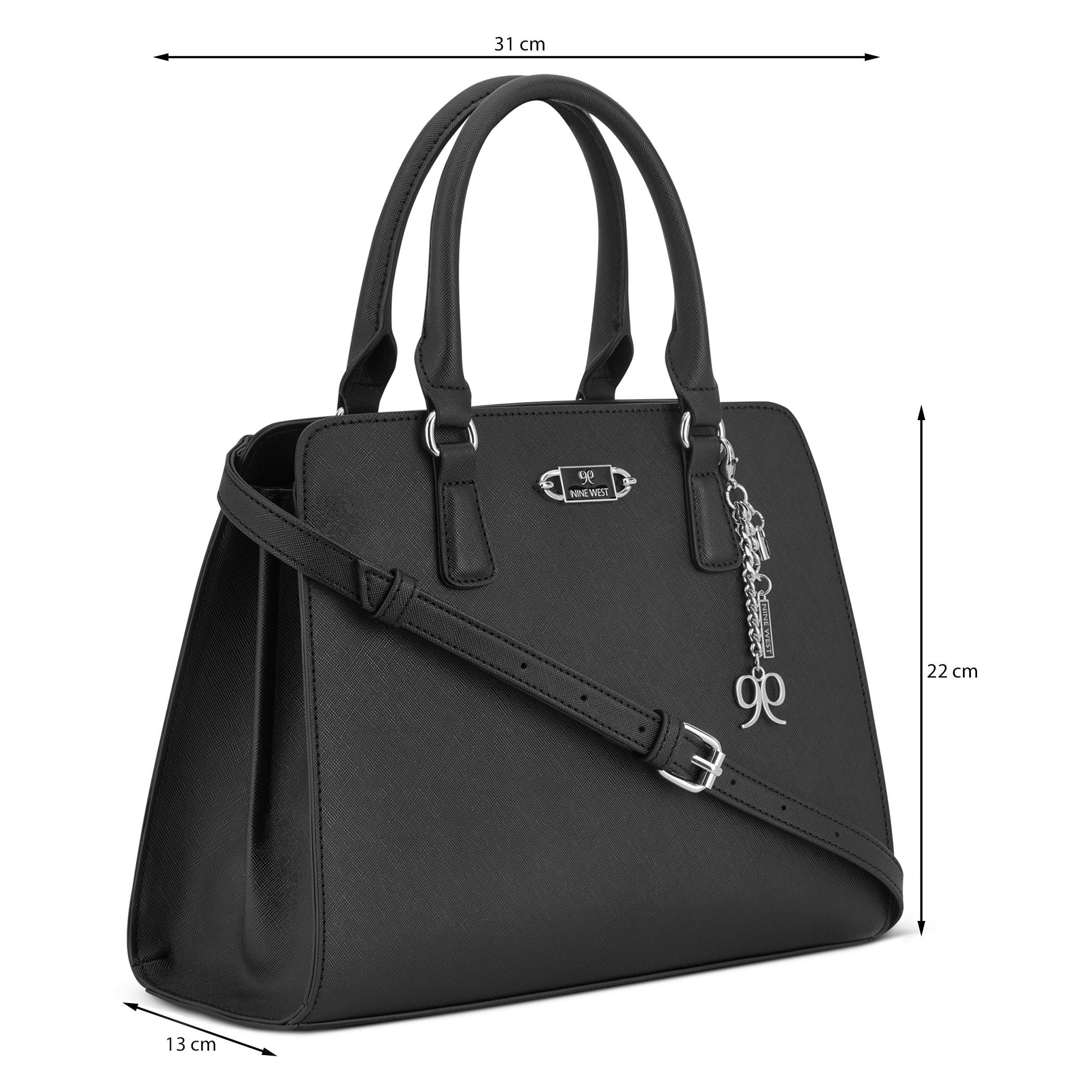 Bolsa de mano Nine West para mujer elaborada en material sintético con aplicación de accesorio plateado, estampado liso, fijación de cierre y textura lisa.