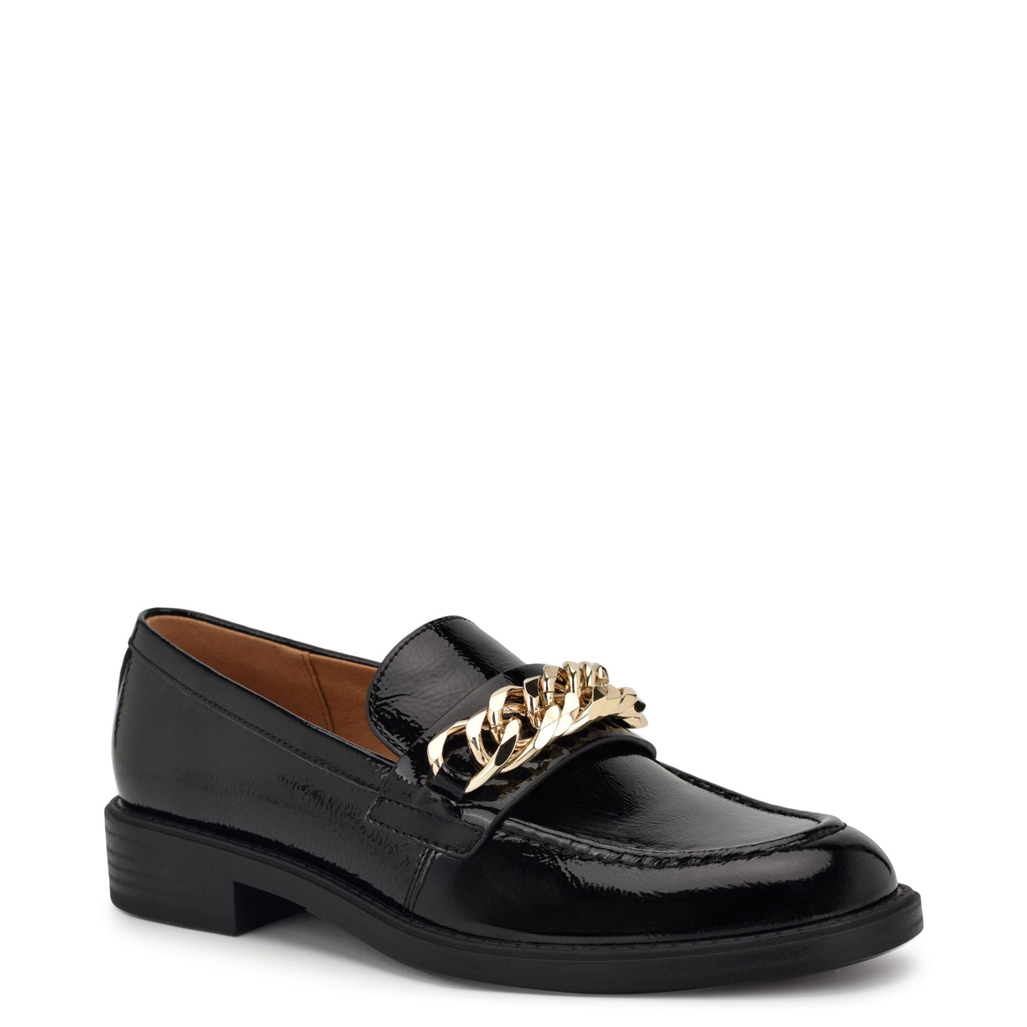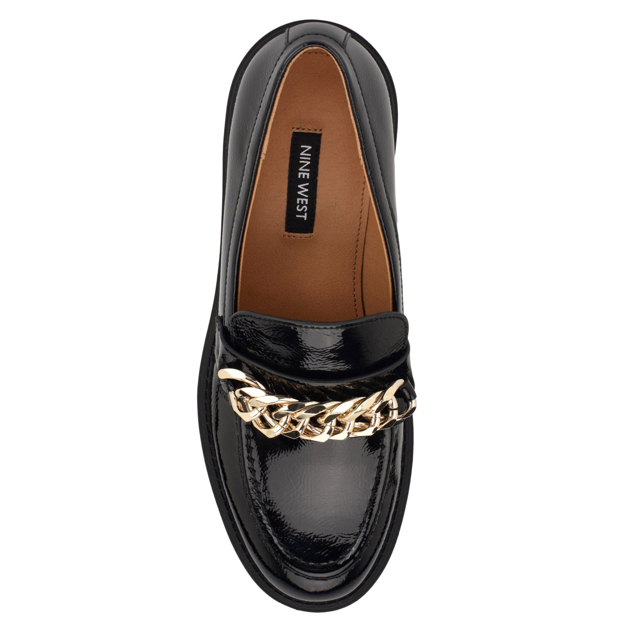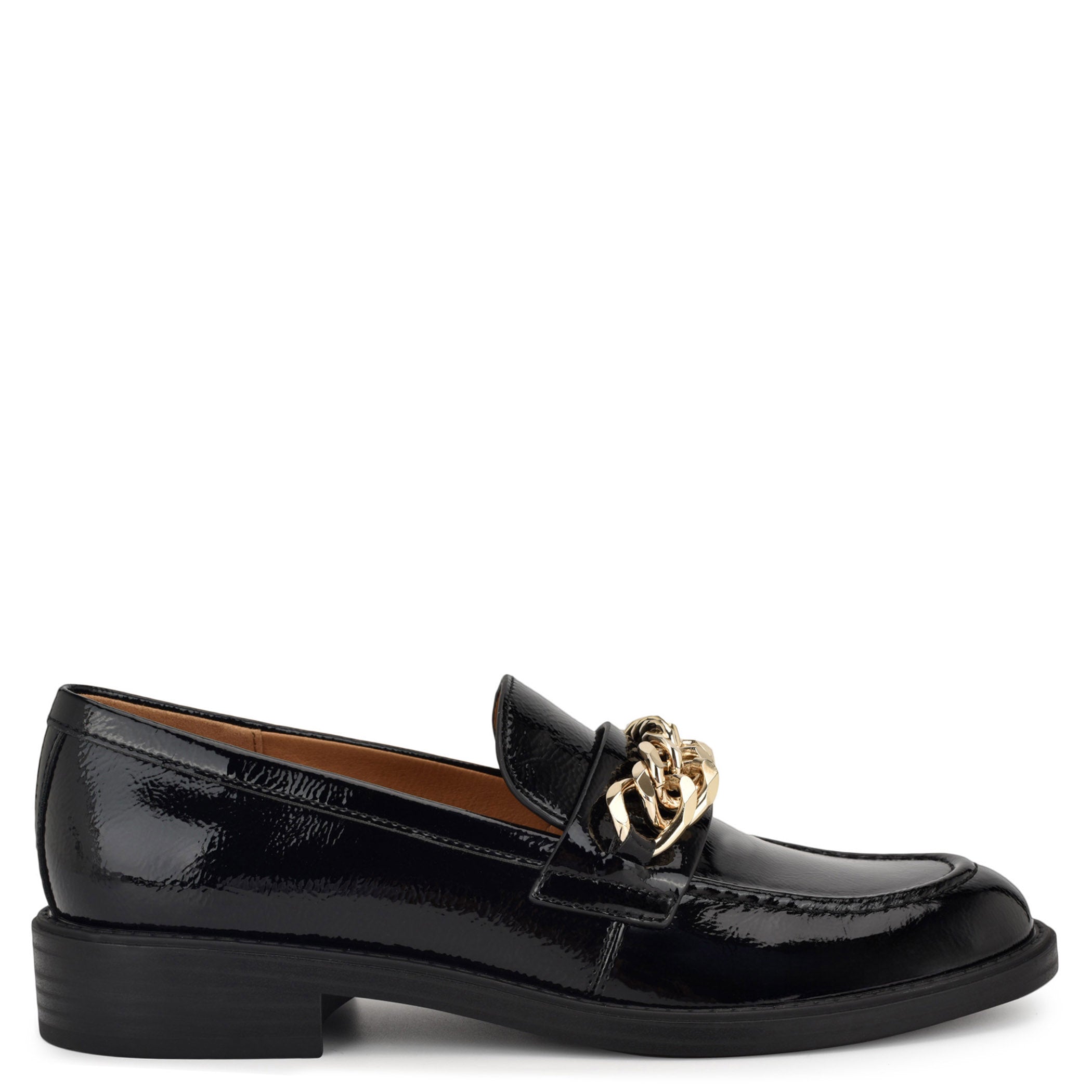 Zapato tipo mocasín Nine West para mujer elaborado en material charol sintético con aplicación de cadena, estampado liso, fijación abierta, punta redonda, cuña flat y textura lisa.