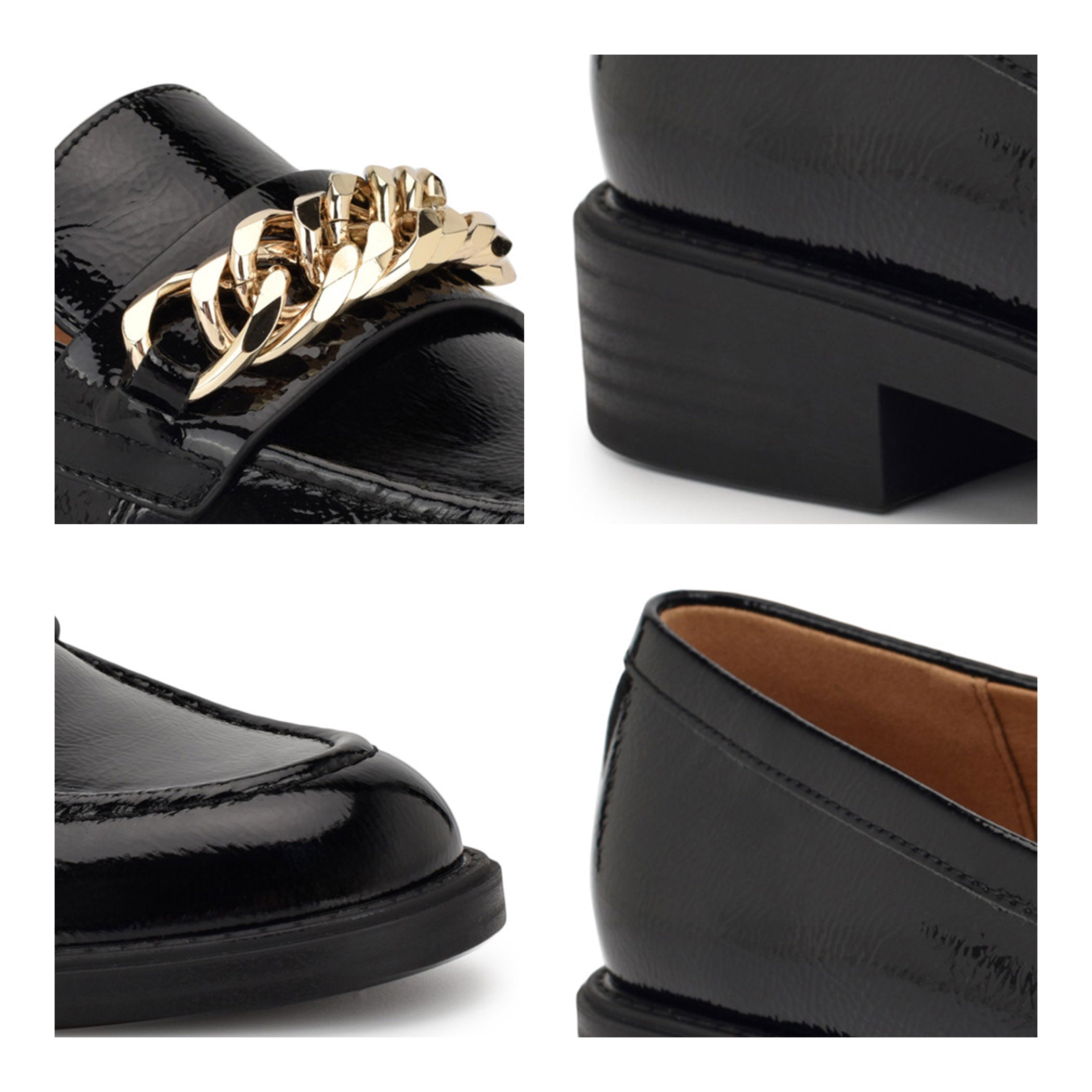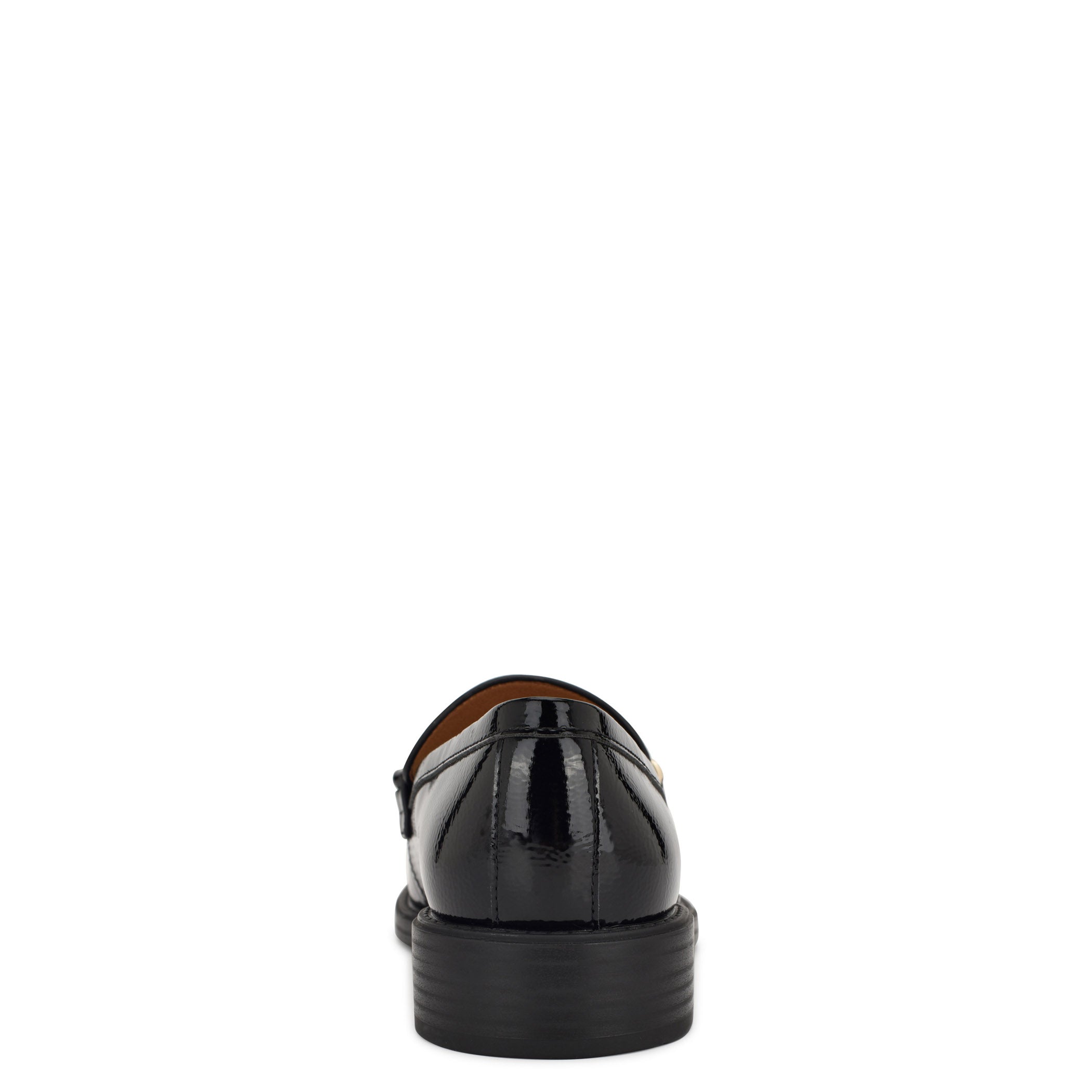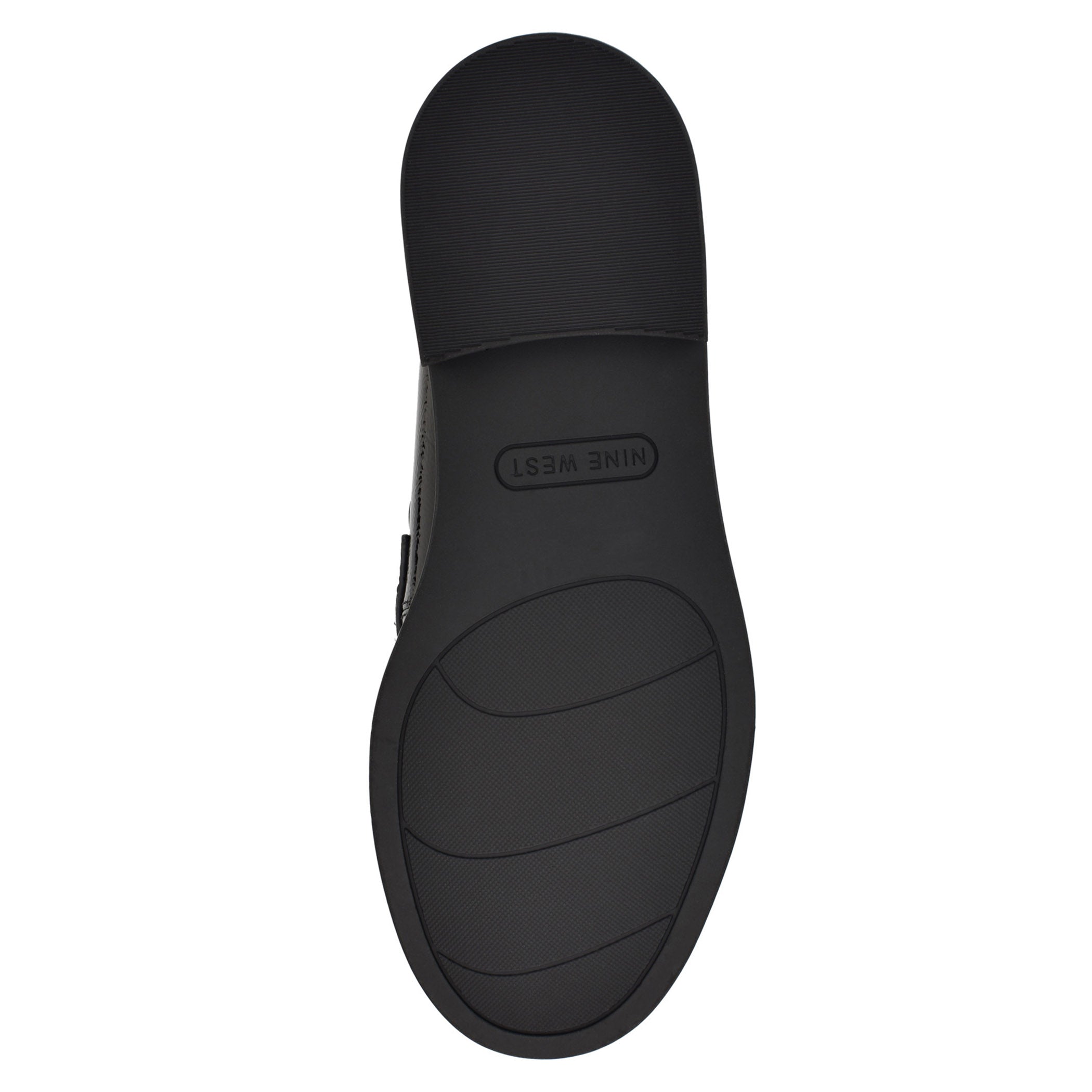 Zapato tipo mocasín Nine West para mujer elaborado en material charol sintético con aplicación de cadena, estampado liso, fijación abierta, punta redonda, cuña flat y textura lisa.