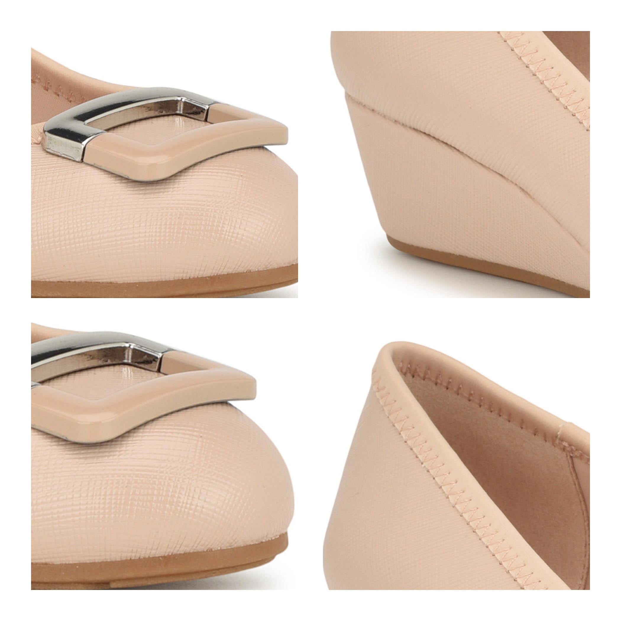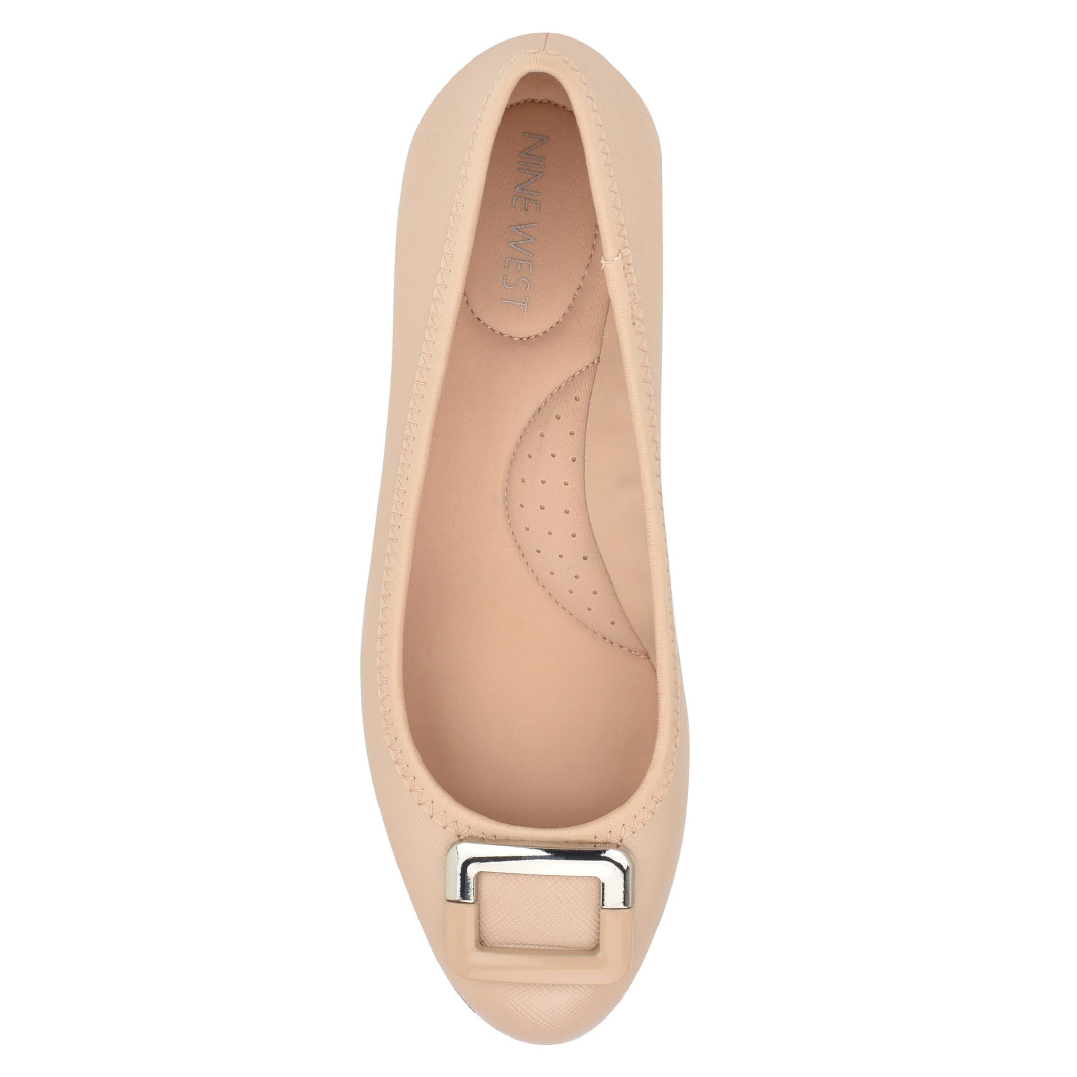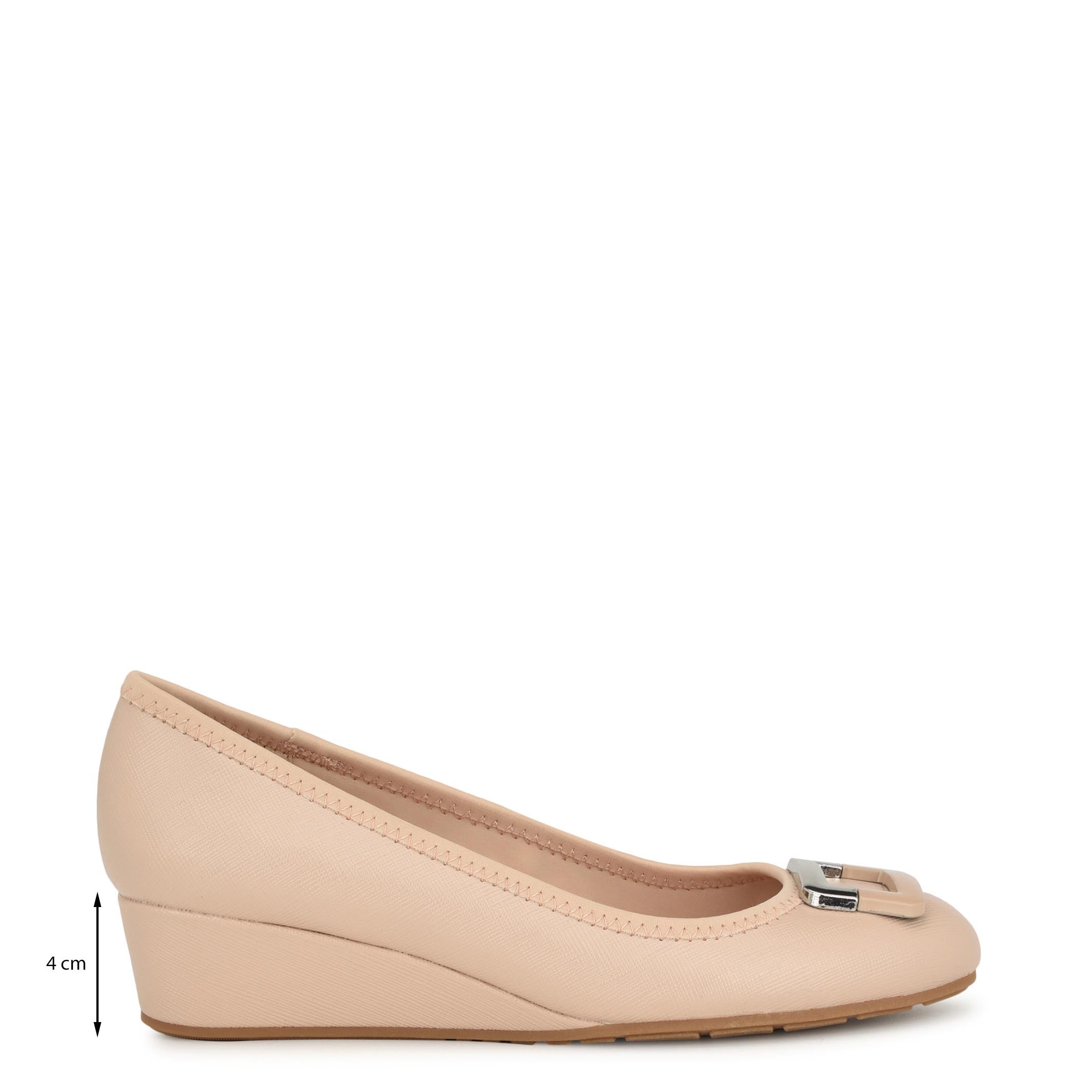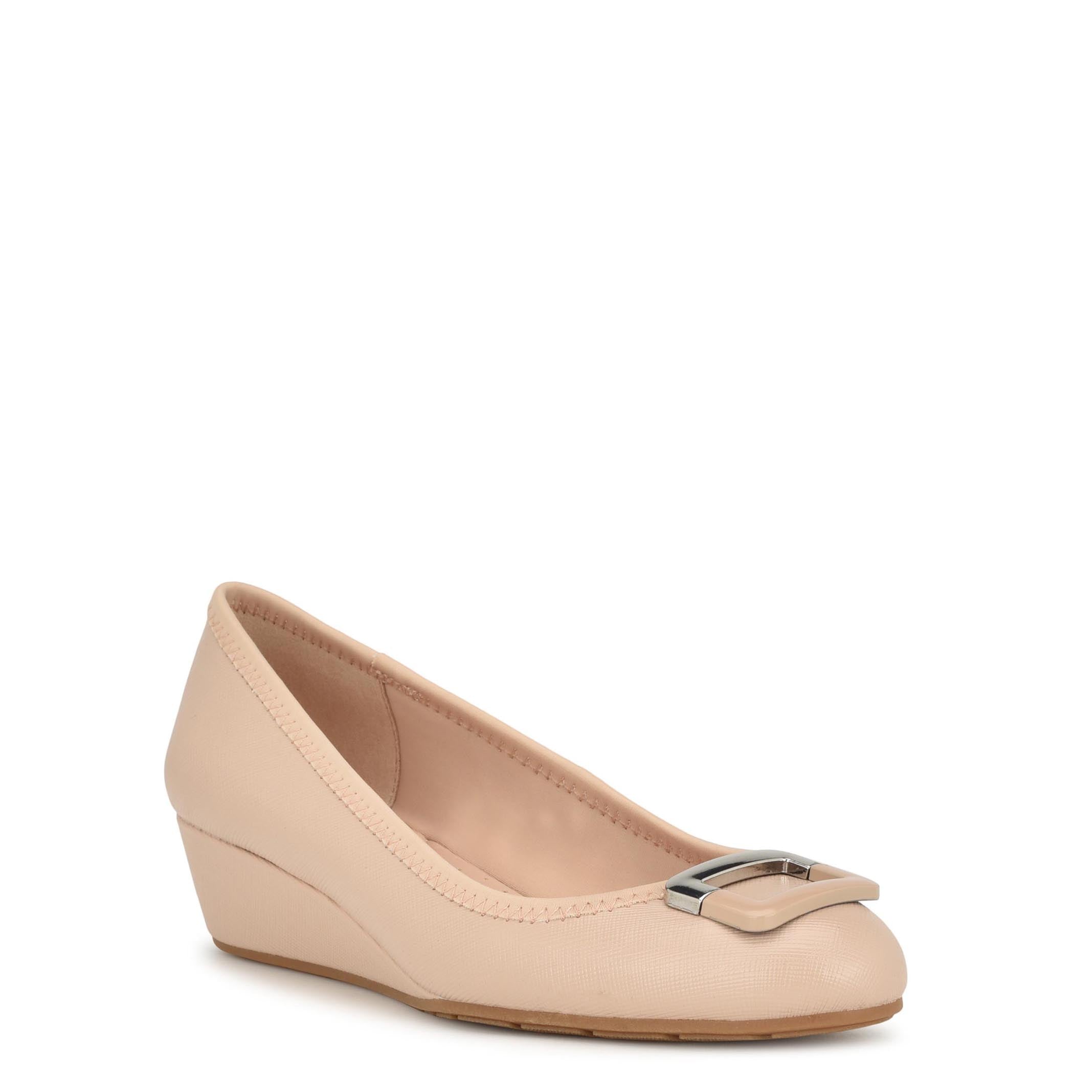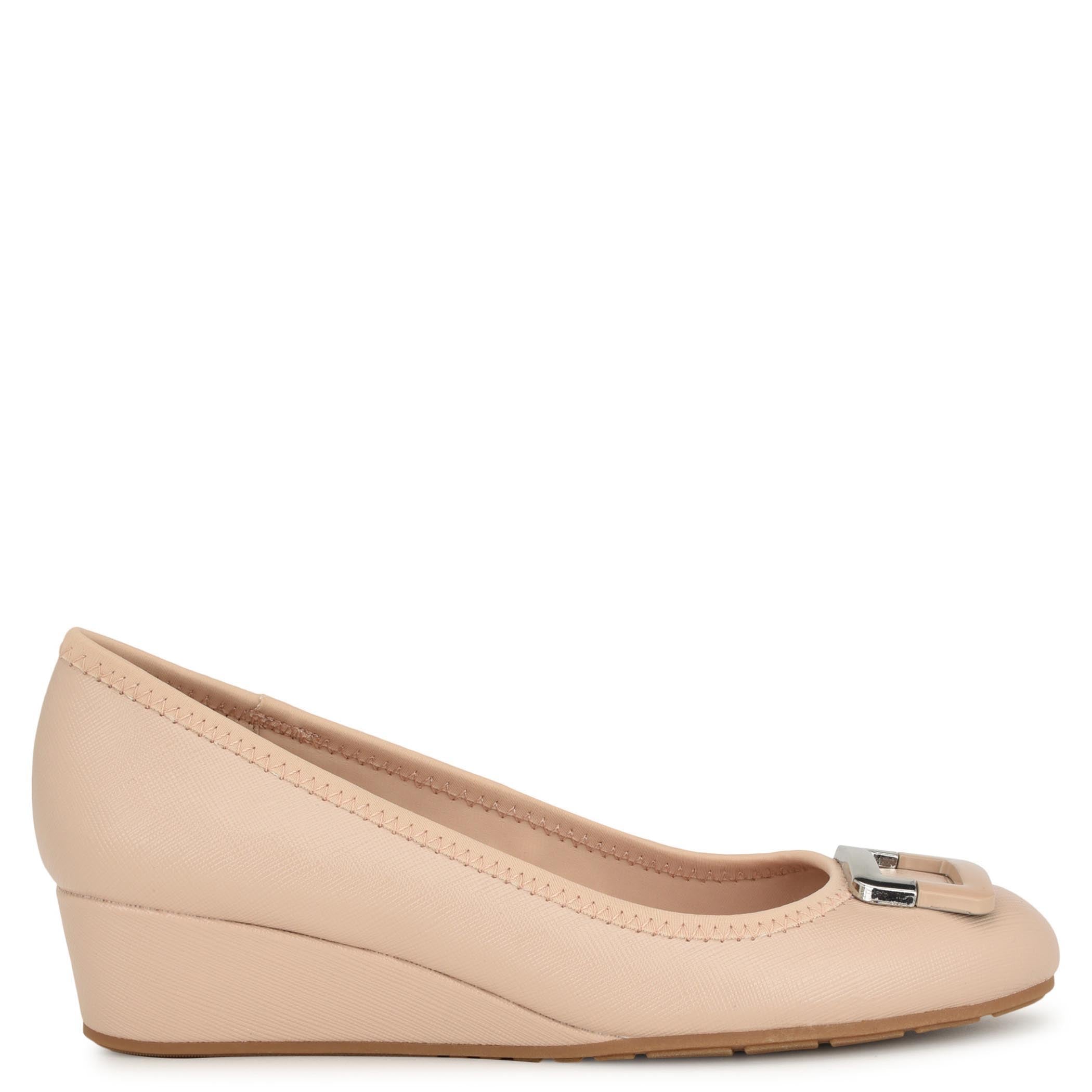 Sandalia de tacón corrido Nine West para mujer elaborado en material sintético con aplicación de herraje, fijación de 1 tiempo, cuña baja con punta redonda, forro sintético, suela sintética, y textura lisa.