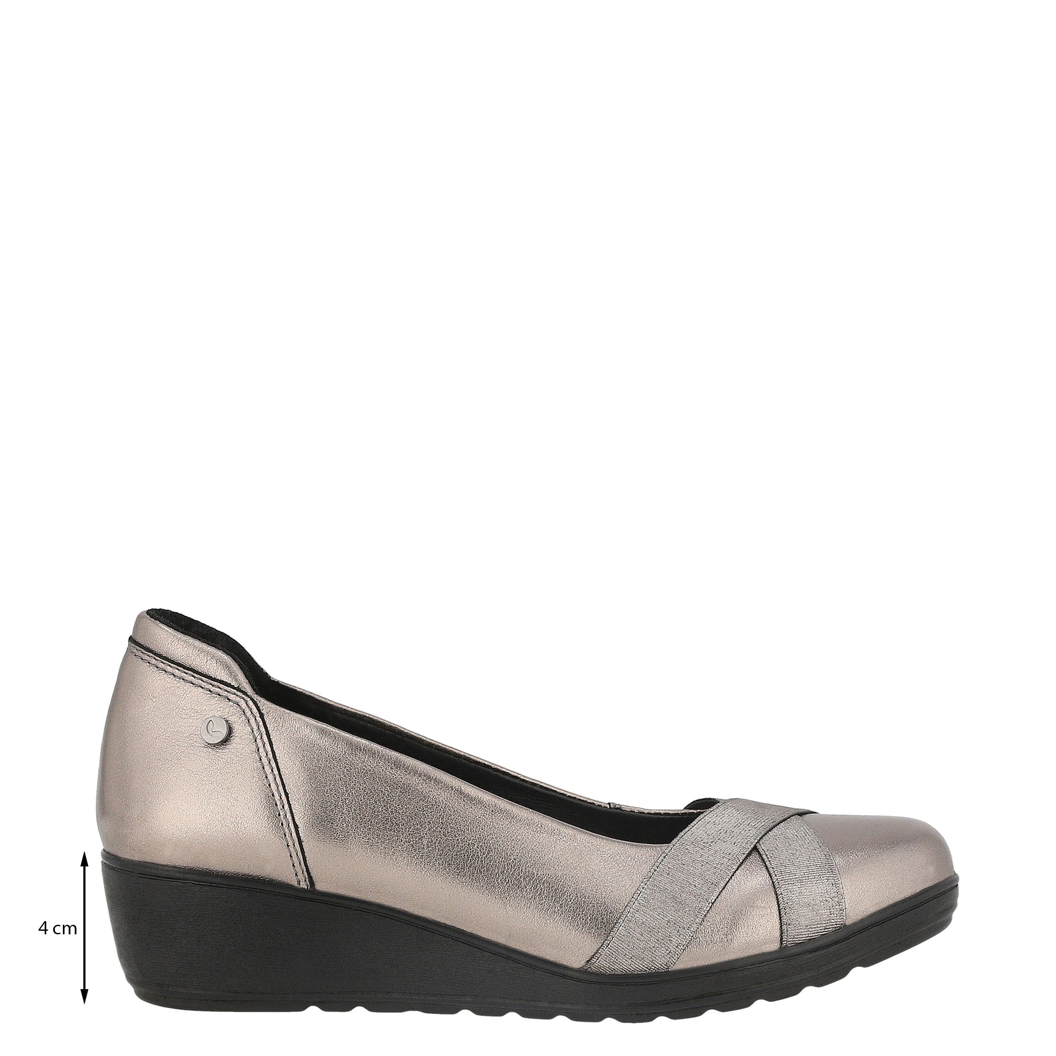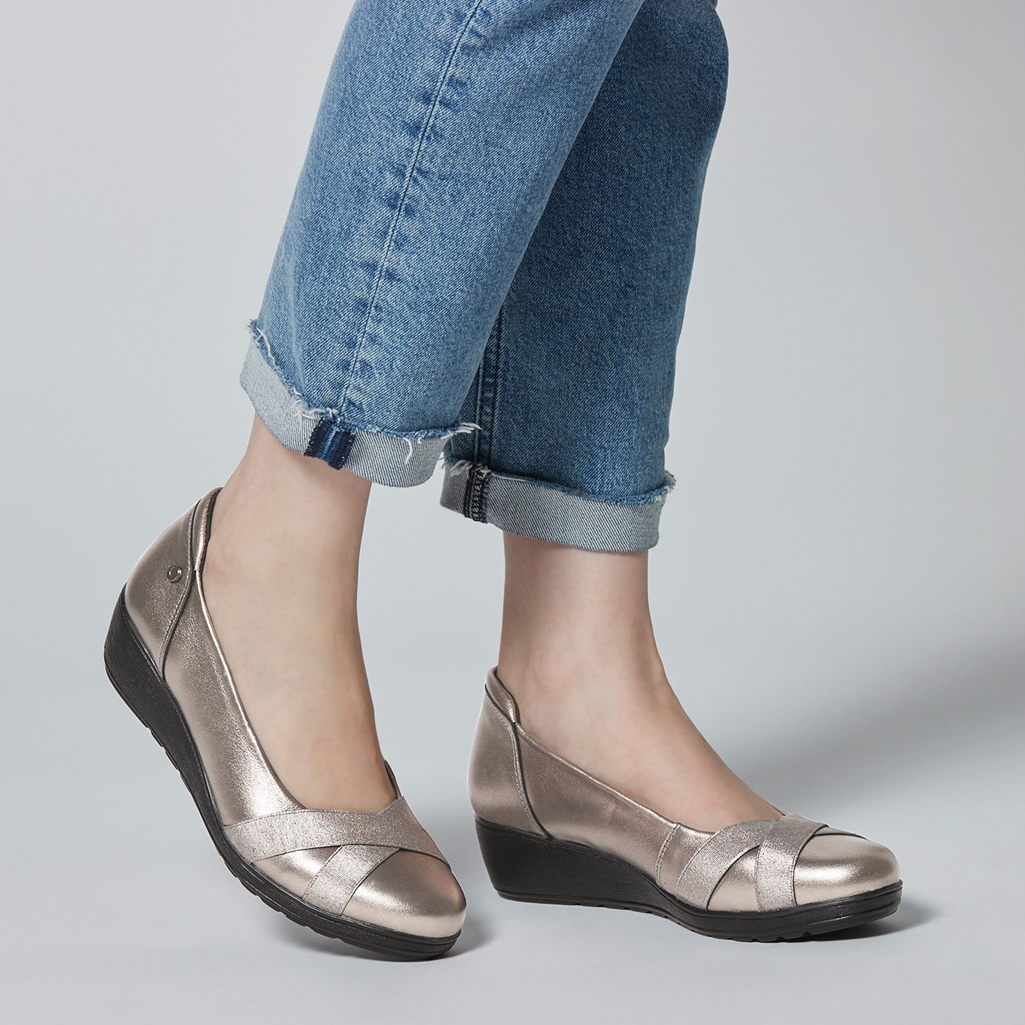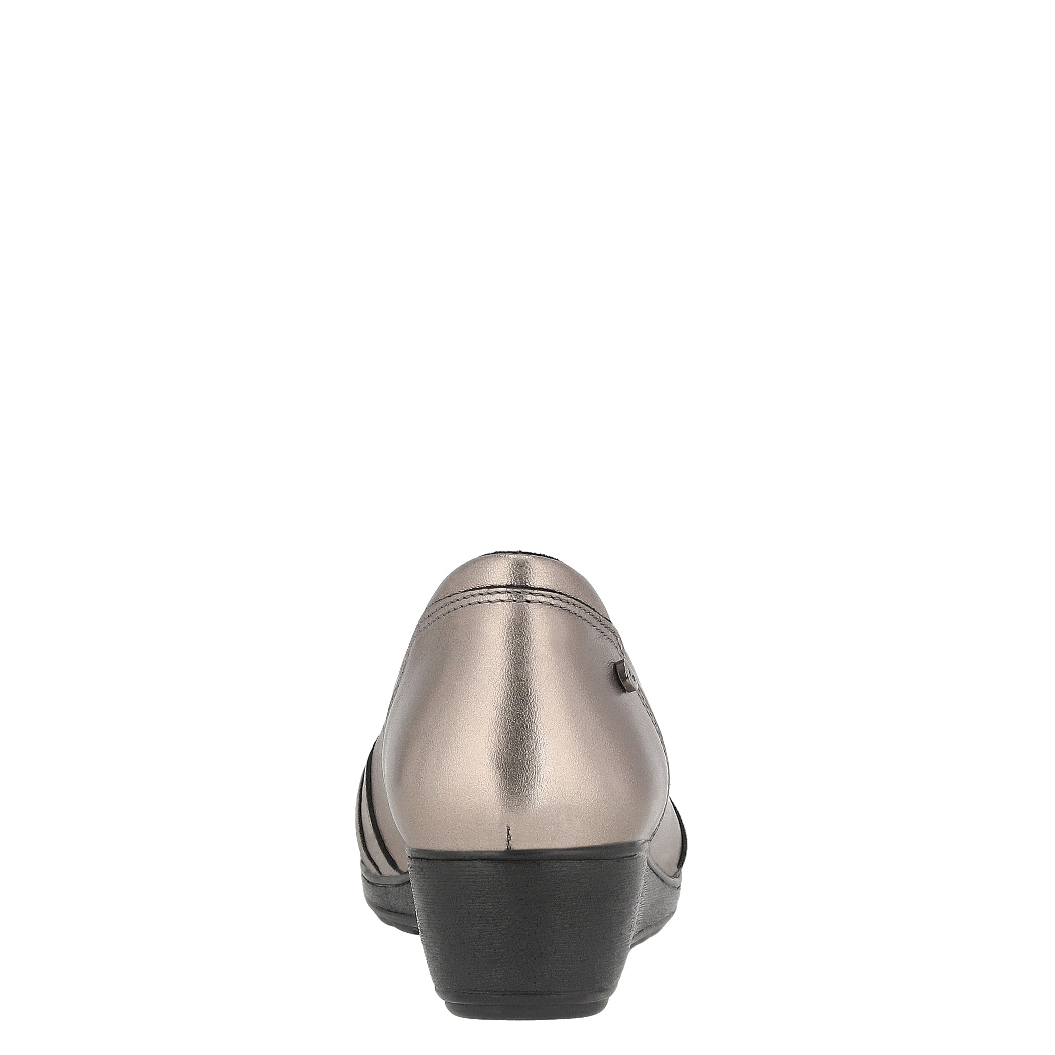 Disfruta de la comodidad y estilo con estos zapatos de corte piel en tono metalizado. La suela flexible y la cuña baja de 4 cm proporcionan un soporte ideal para tus pies, mientras que la plantilla acolchonada ofrece una sensación de confort durante todo el día. Este diseño, es perfecto para tus actividades diarias, combinando elegancia y funcionalidad.
