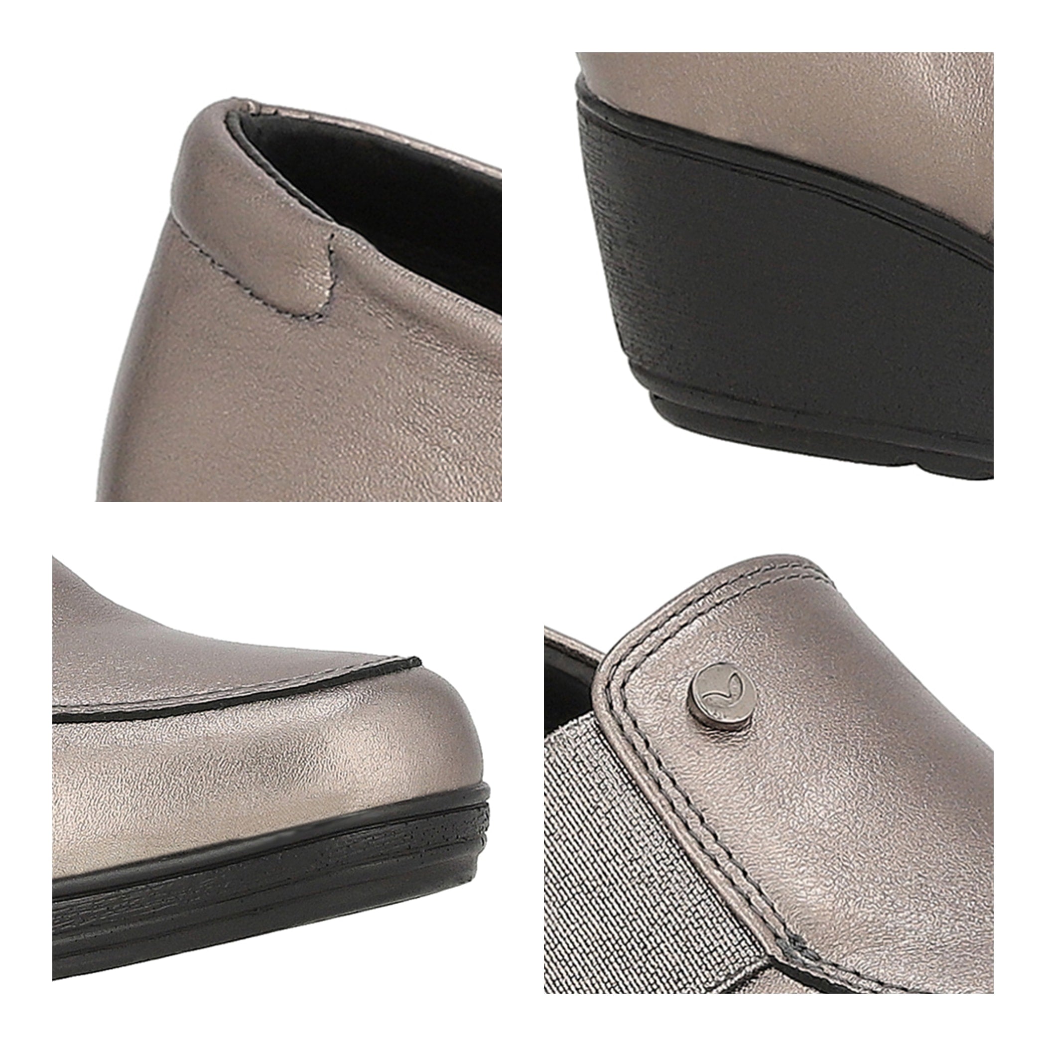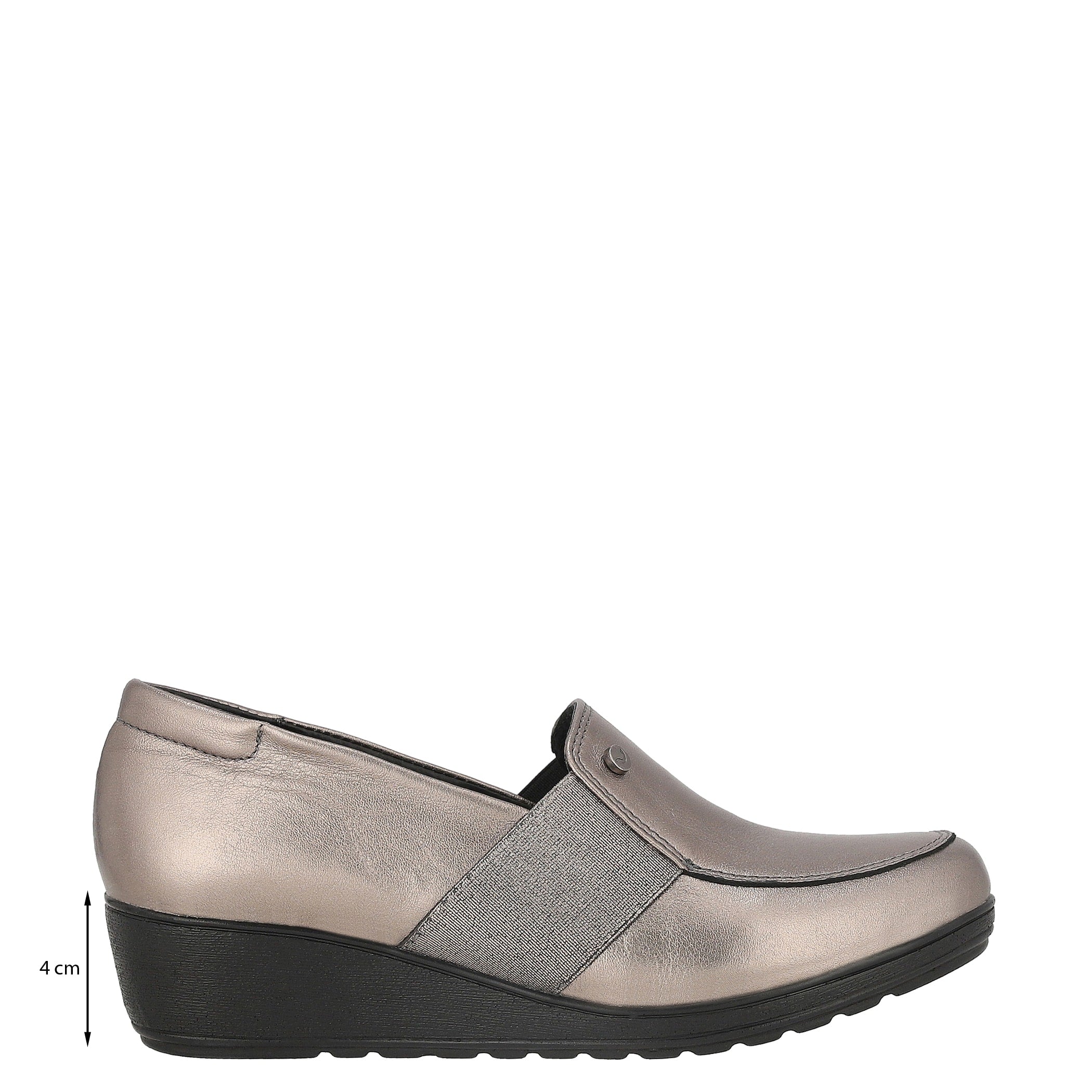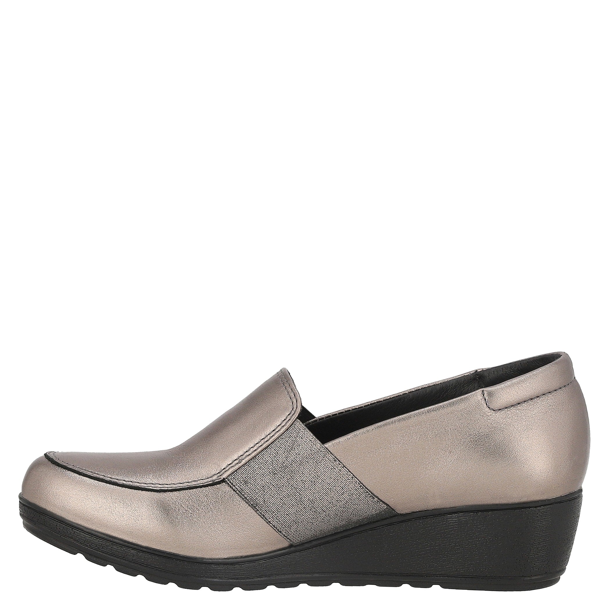 Estos zapatos de corte piel en un elegante tono metalizado son la elección perfecta para un look casual y cómodo. La suela flexible y la cuña baja proporcionan un soporte adecuado, mientras que la plantilla acolchonada asegura comodidad durante todo el día. Estos zapatos son ideales para cualquier ocasión, ofreciendo una combinación perfecta de estilo y funcionalidad.