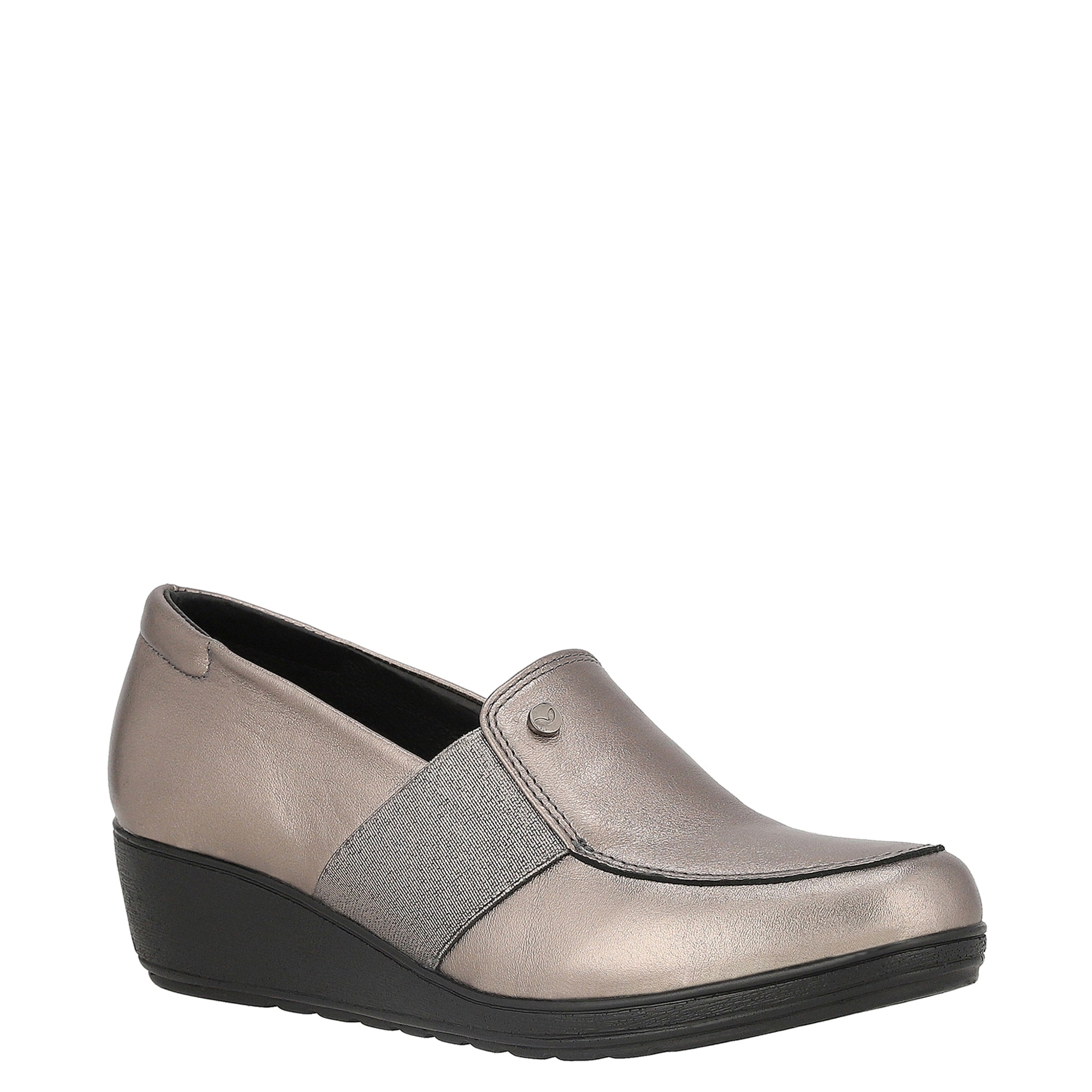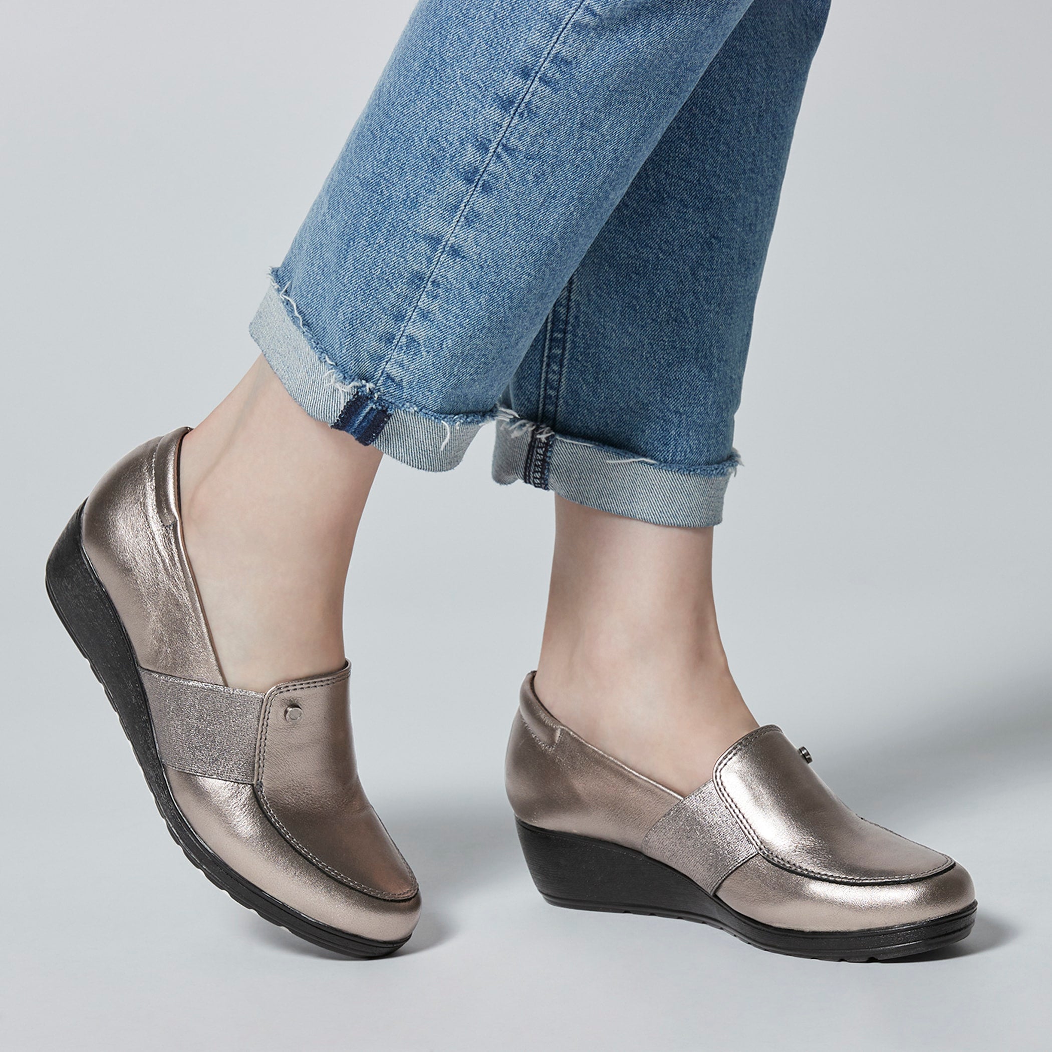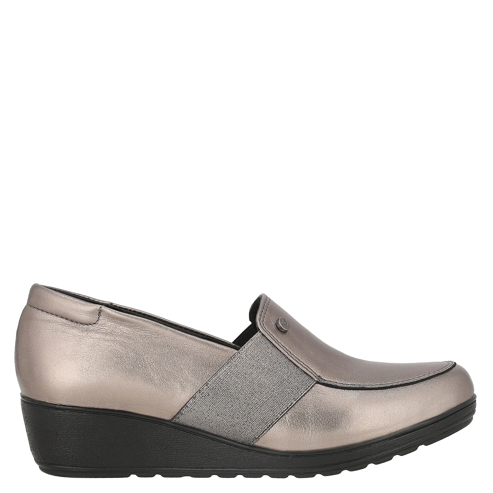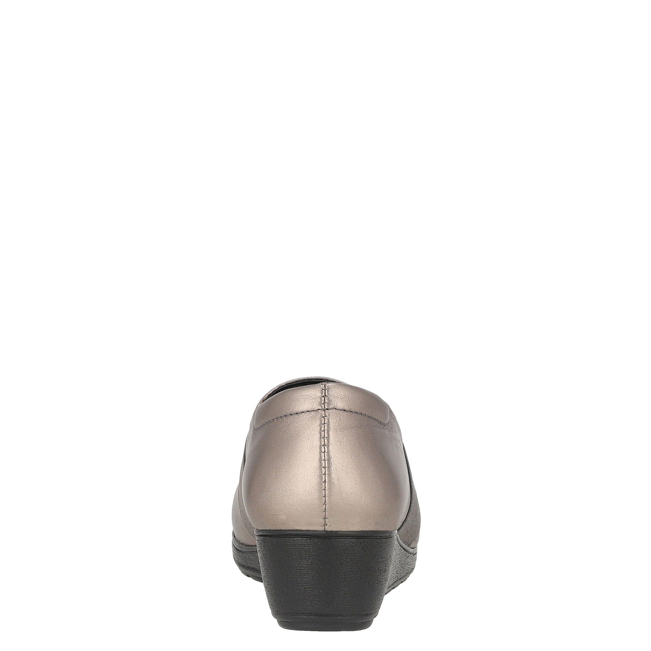 Estos zapatos de corte piel en un elegante tono metalizado son la elección perfecta para un look casual y cómodo. La suela flexible y la cuña baja proporcionan un soporte adecuado, mientras que la plantilla acolchonada asegura comodidad durante todo el día. Estos zapatos son ideales para cualquier ocasión, ofreciendo una combinación perfecta de estilo y funcionalidad.