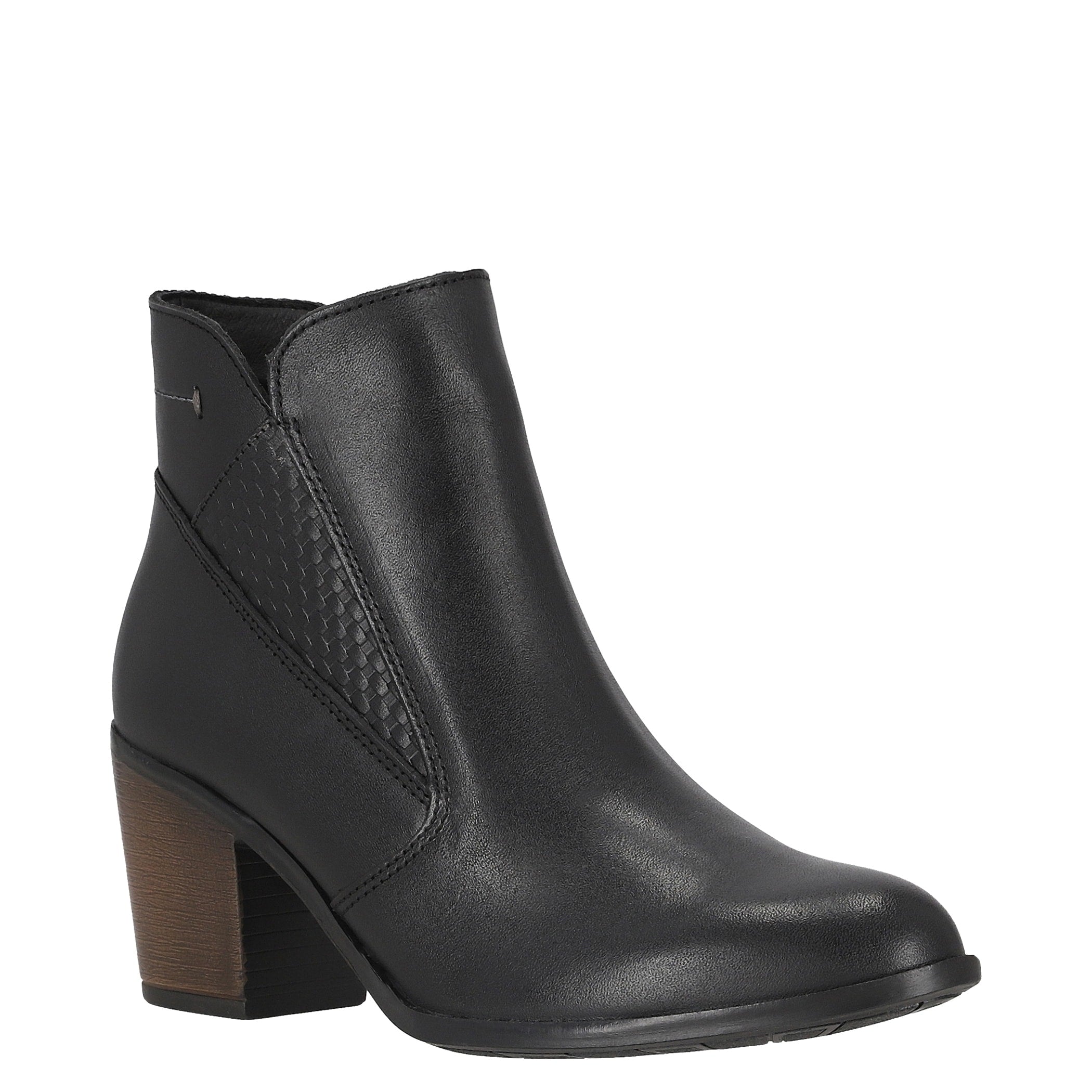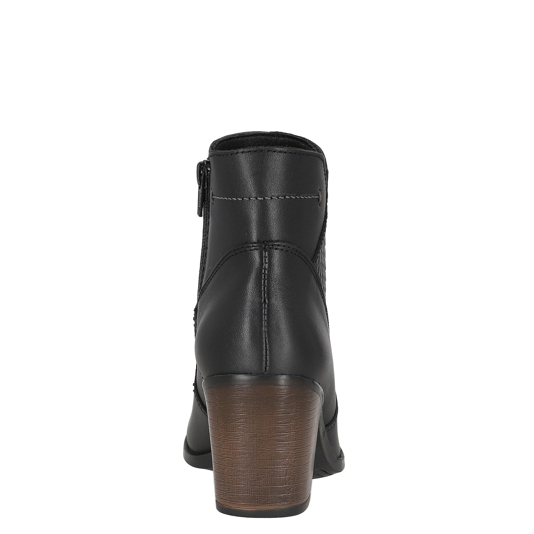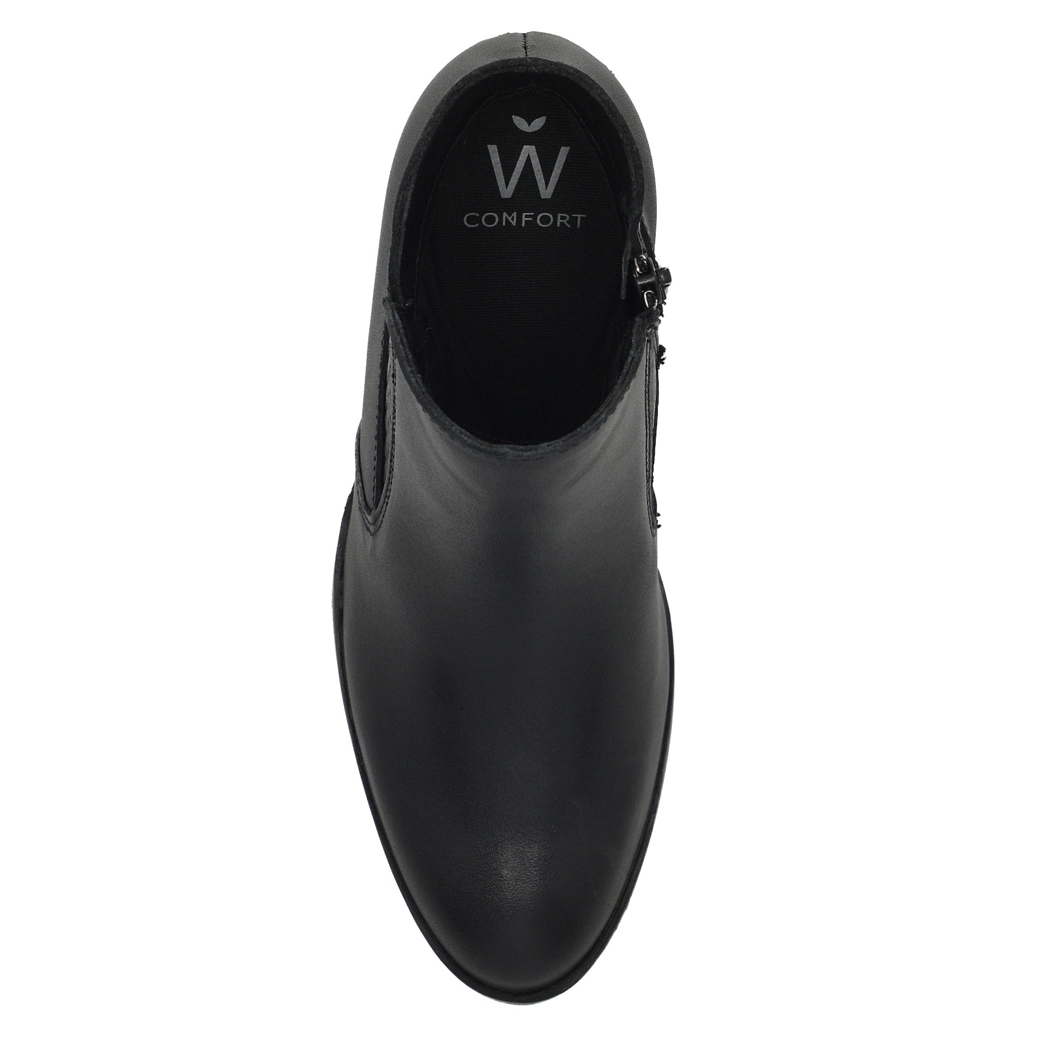 Botín con tacón W Confort para mujer elaborado en material piel con aplicación de herraje, estampado liso, fijación de cierre, punta redonda, cuña baja y textura lisa.
