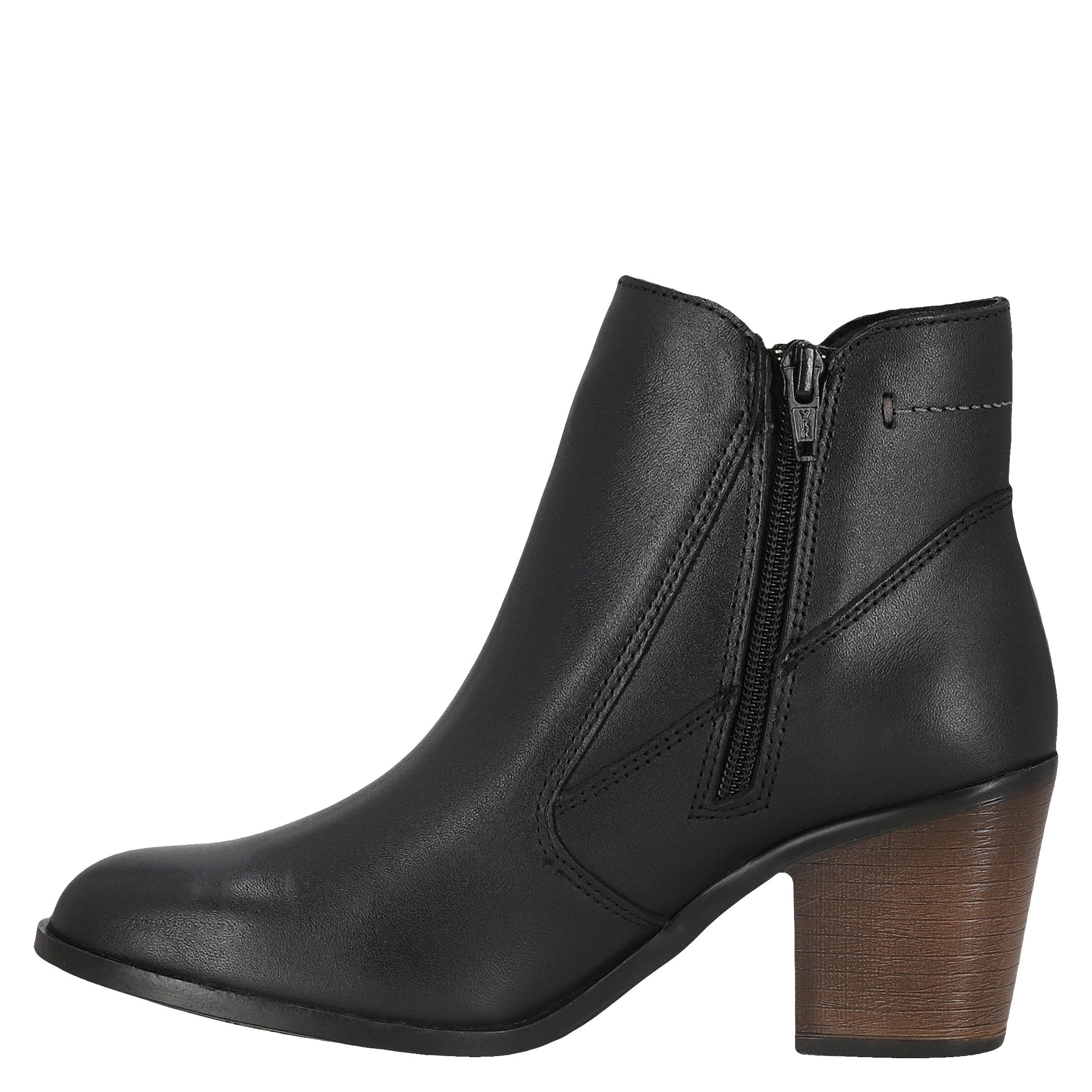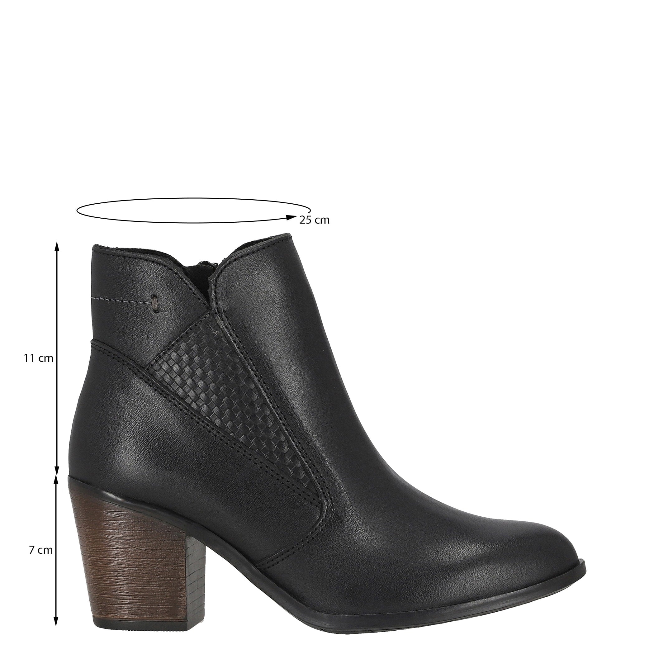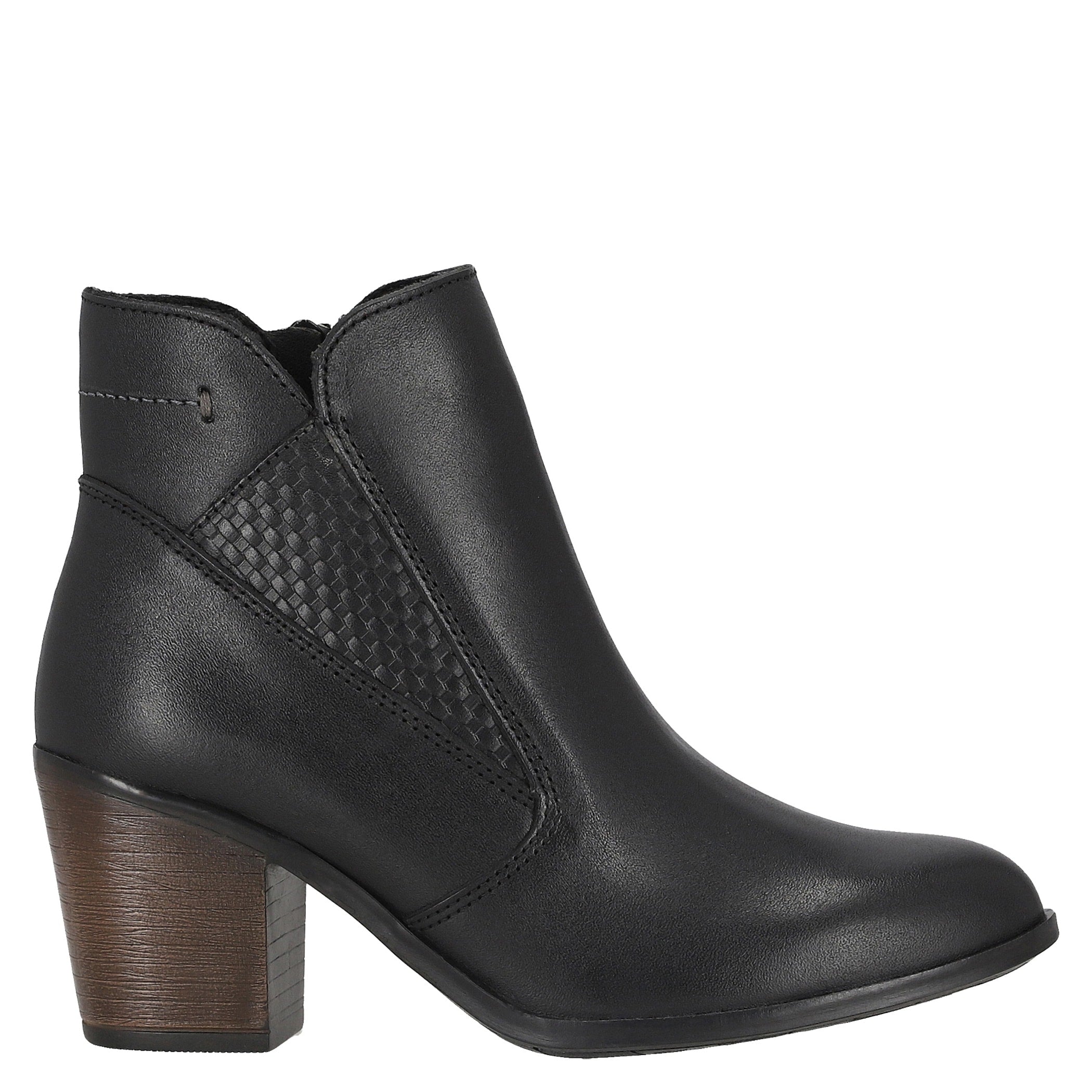 Botín con tacón W Confort para mujer elaborado en material piel con aplicación de herraje, estampado liso, fijación de cierre, punta redonda, cuña baja y textura lisa.