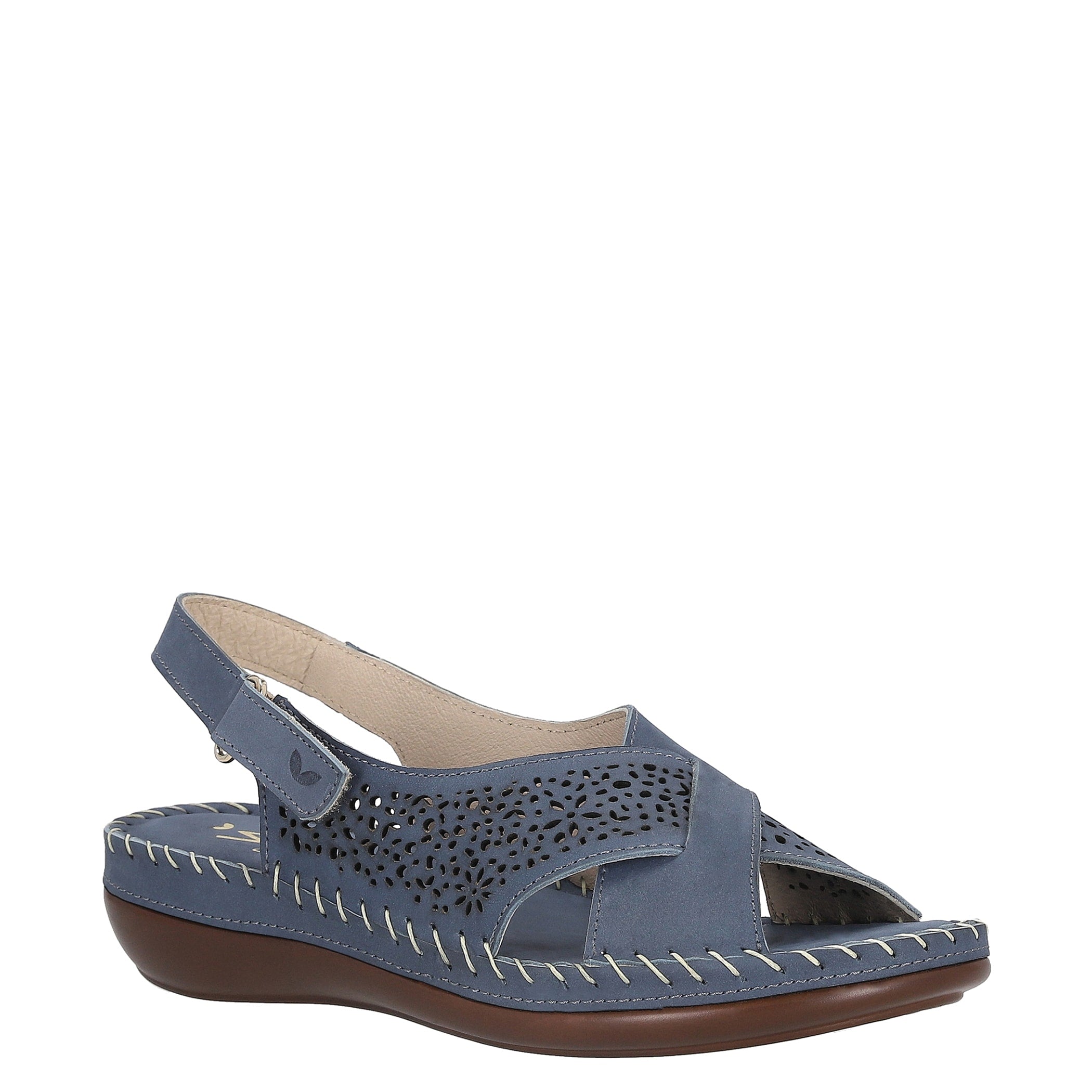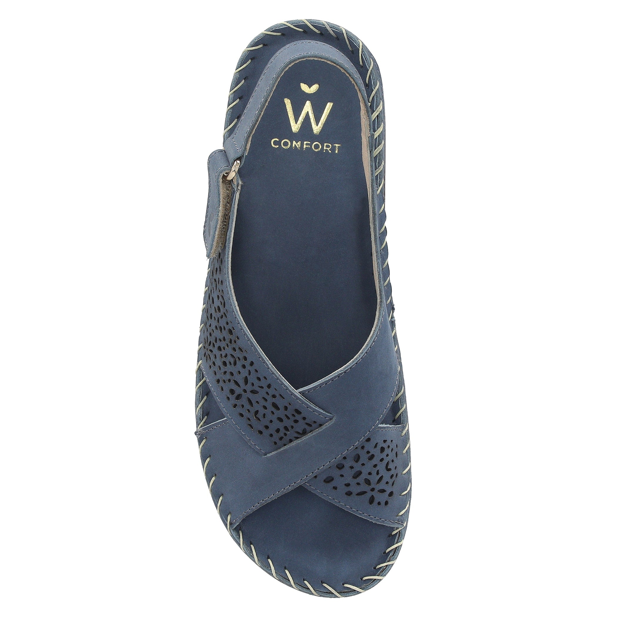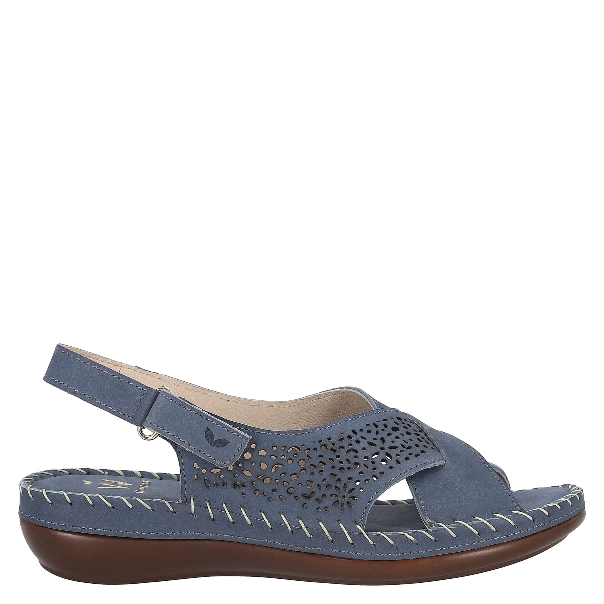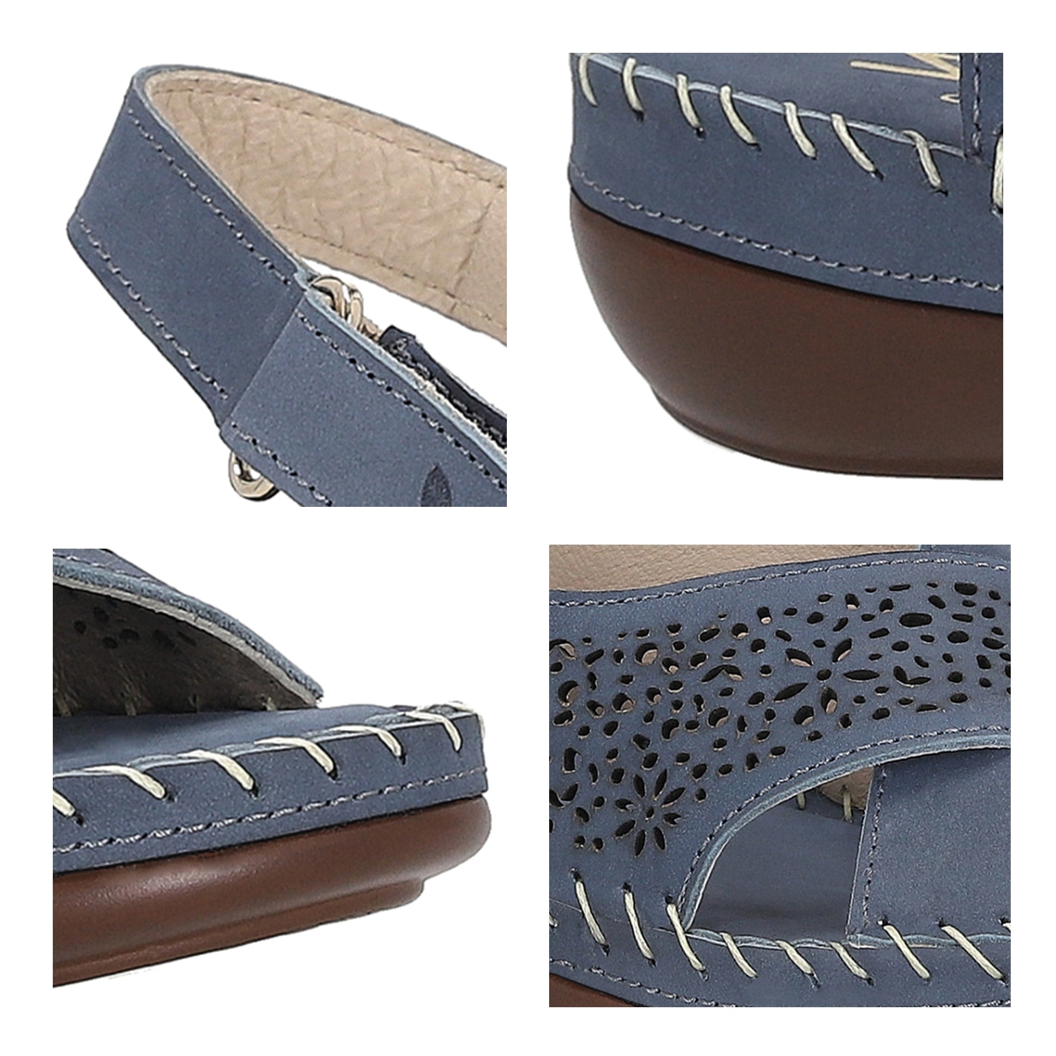 Sandalia W Confort para mujer elaborada en material piel con aplicación de corte láser, estampado liso, fijación de velcro, punta redonda, cuña flat y textura lisa.