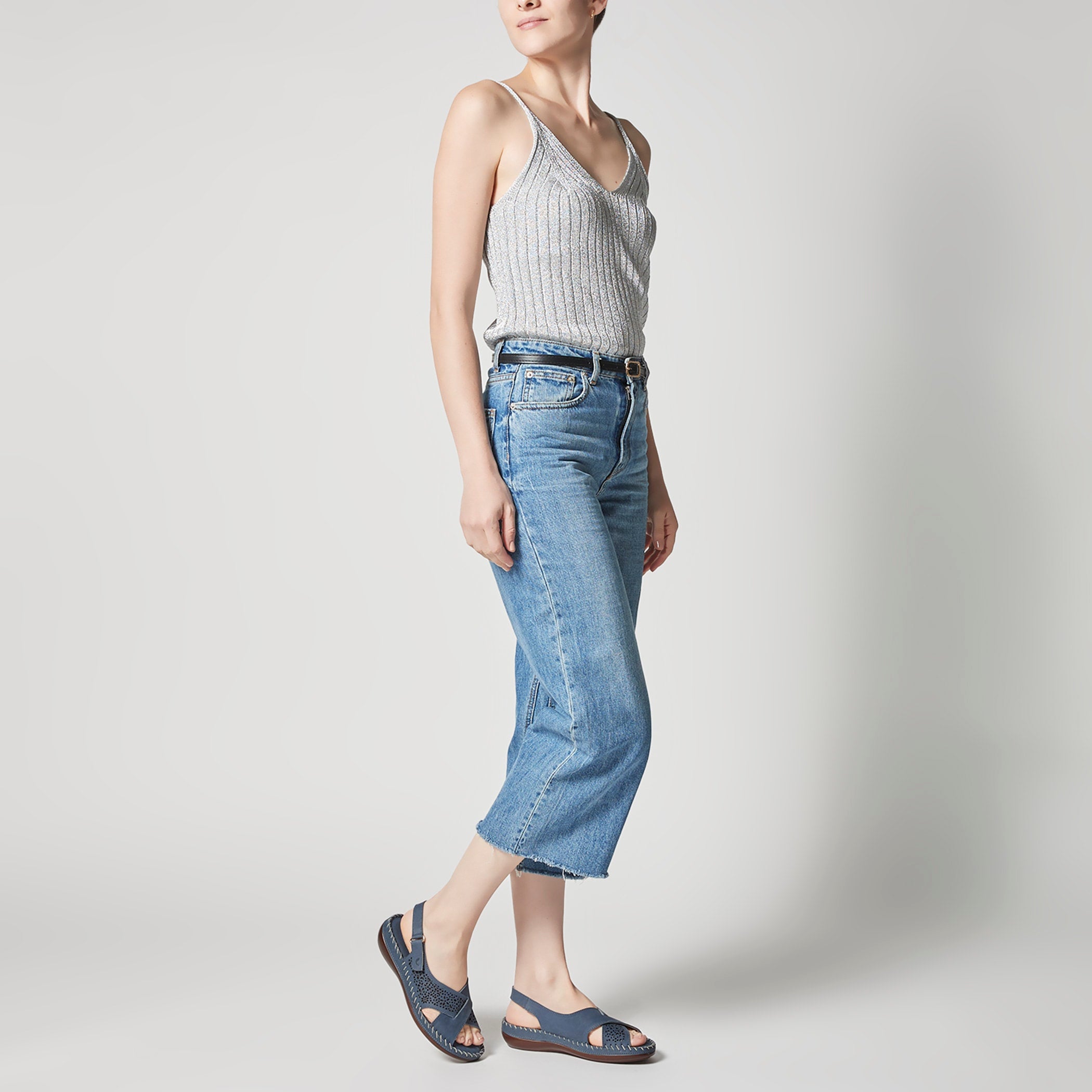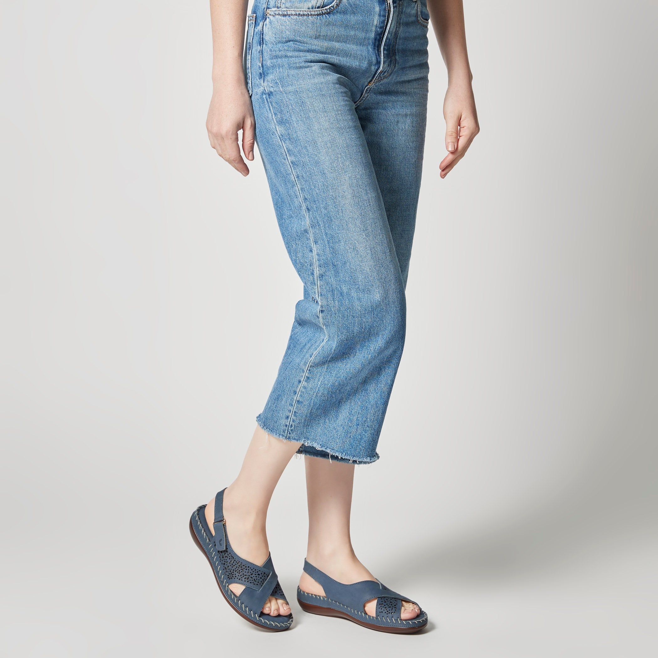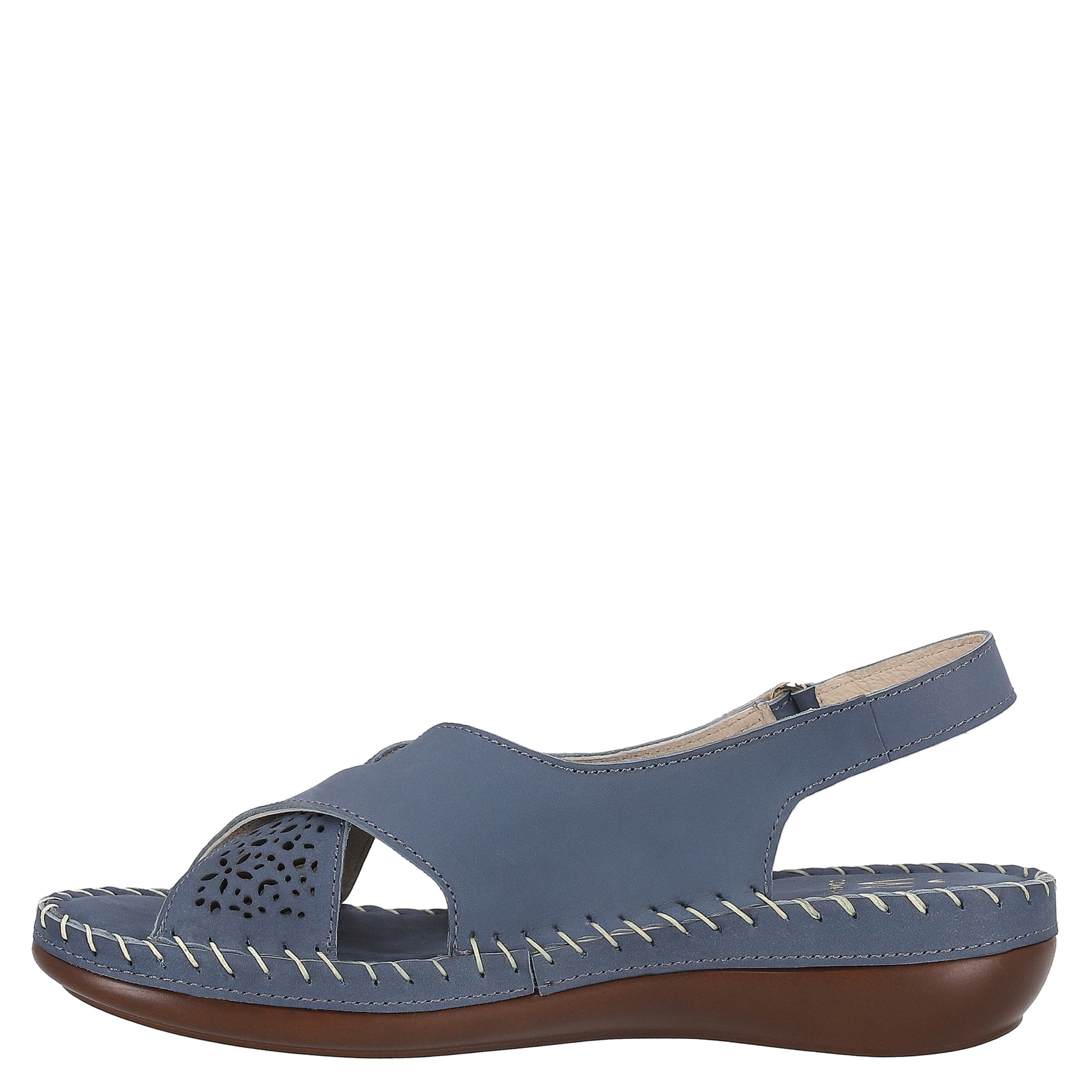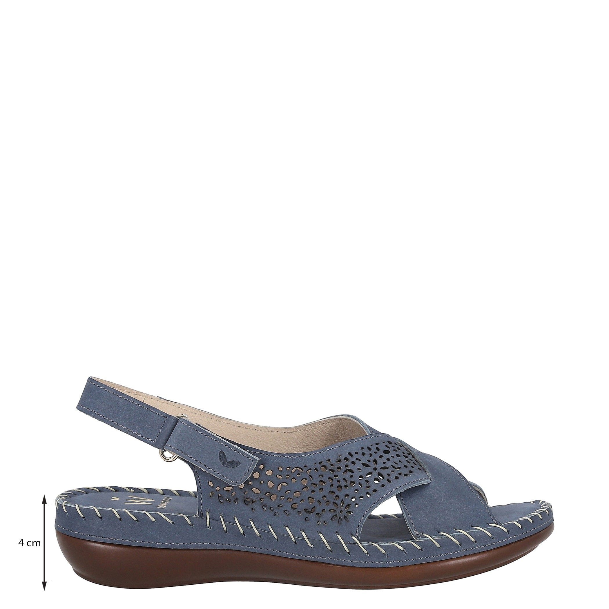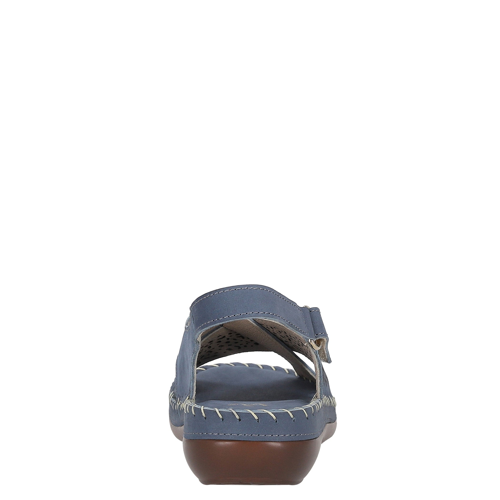Sandalia W Confort para mujer elaborada en material piel con aplicación de corte láser, estampado liso, fijación de velcro, punta redonda, cuña flat y textura lisa.