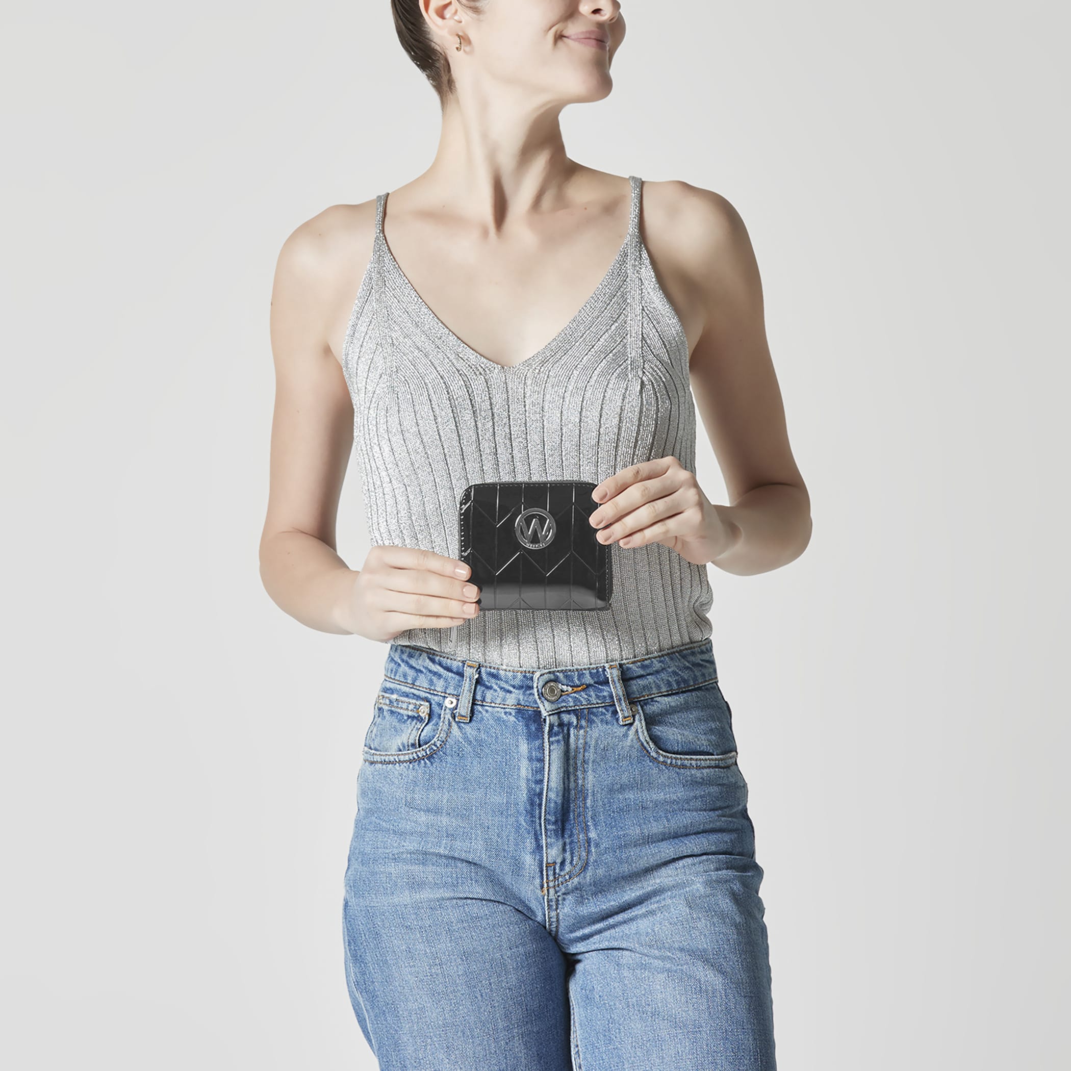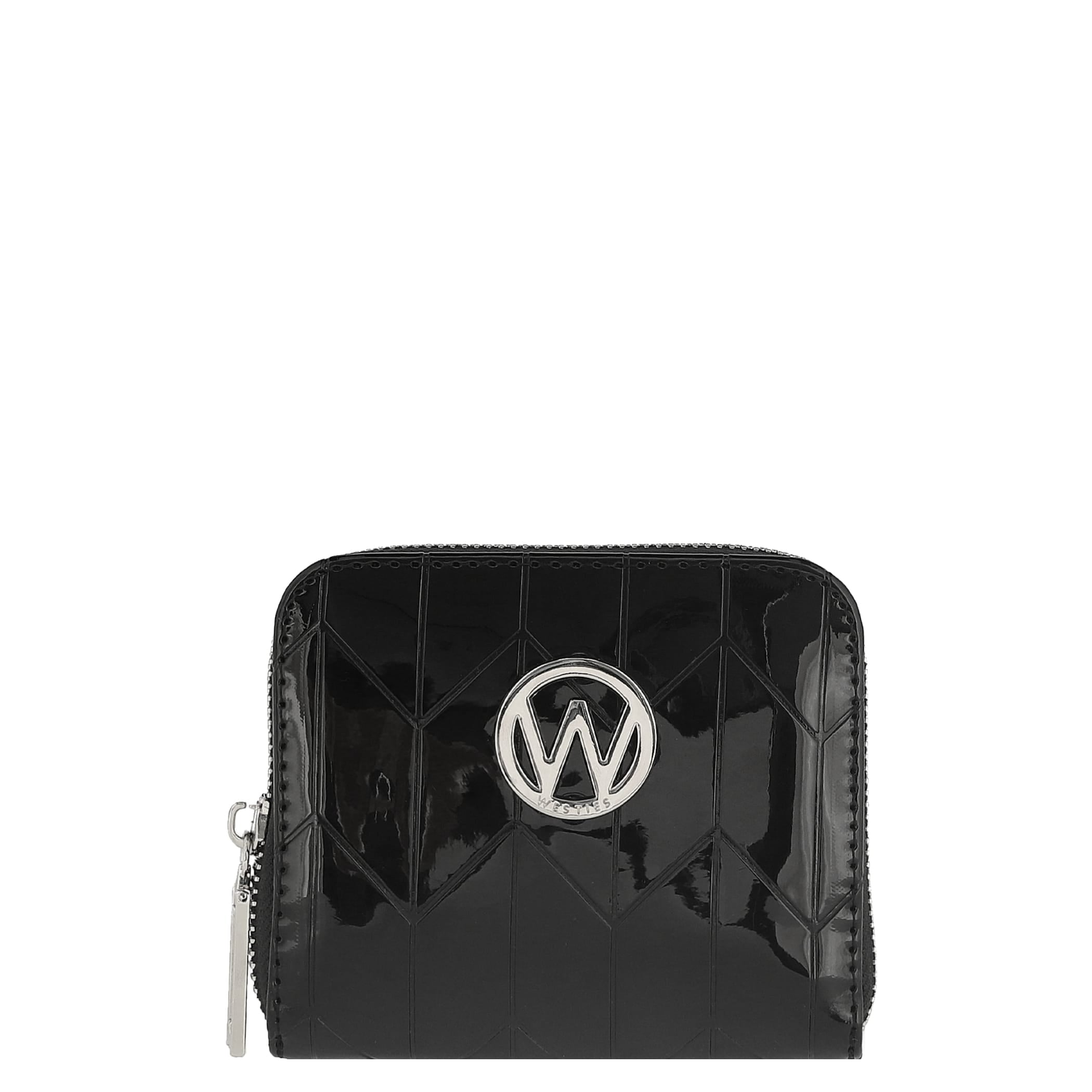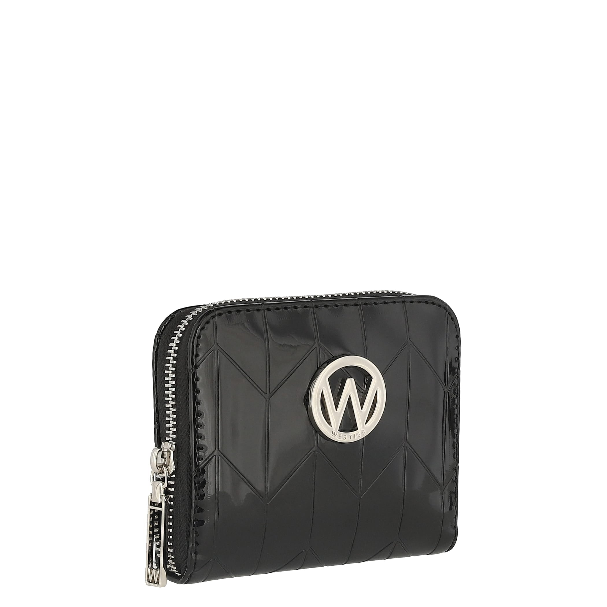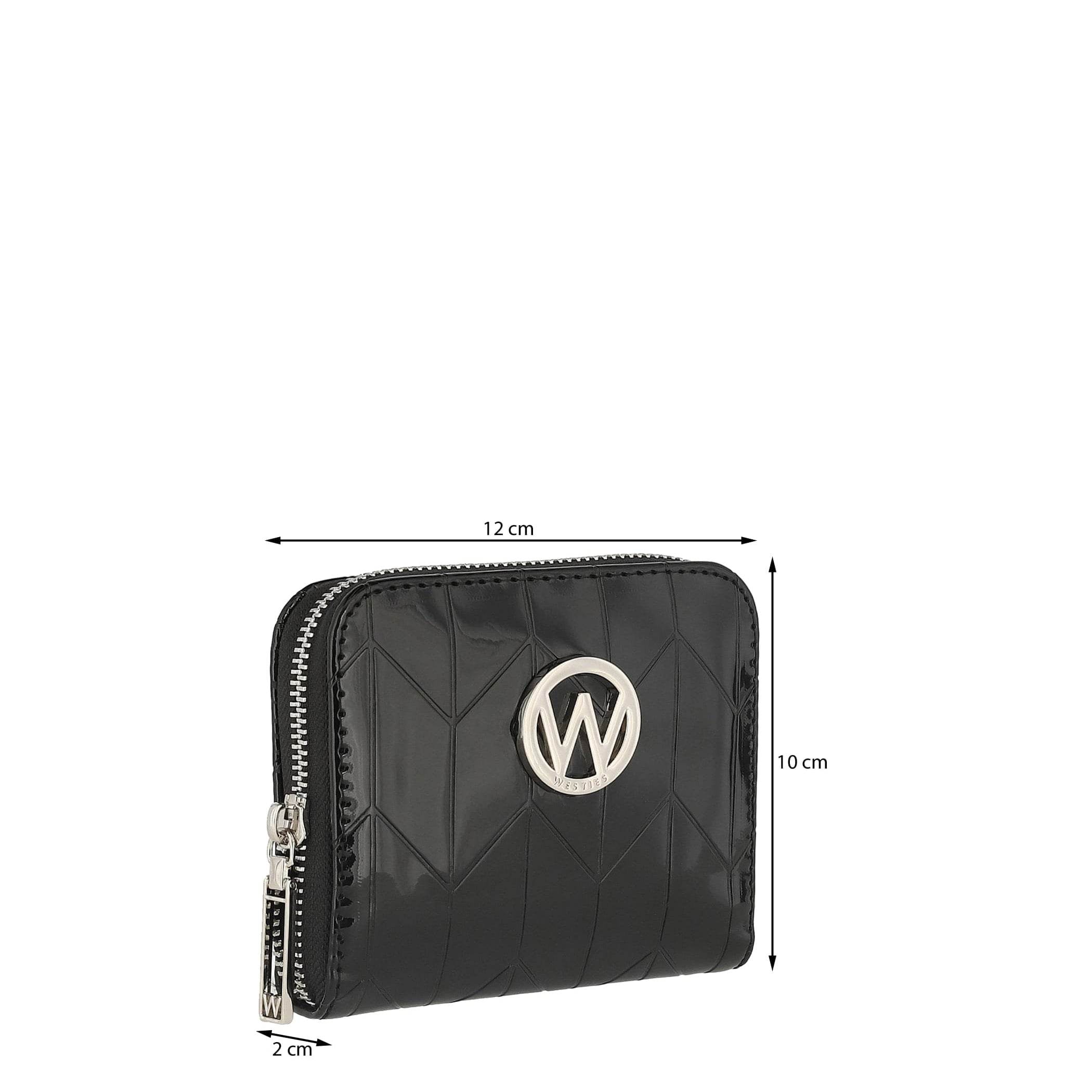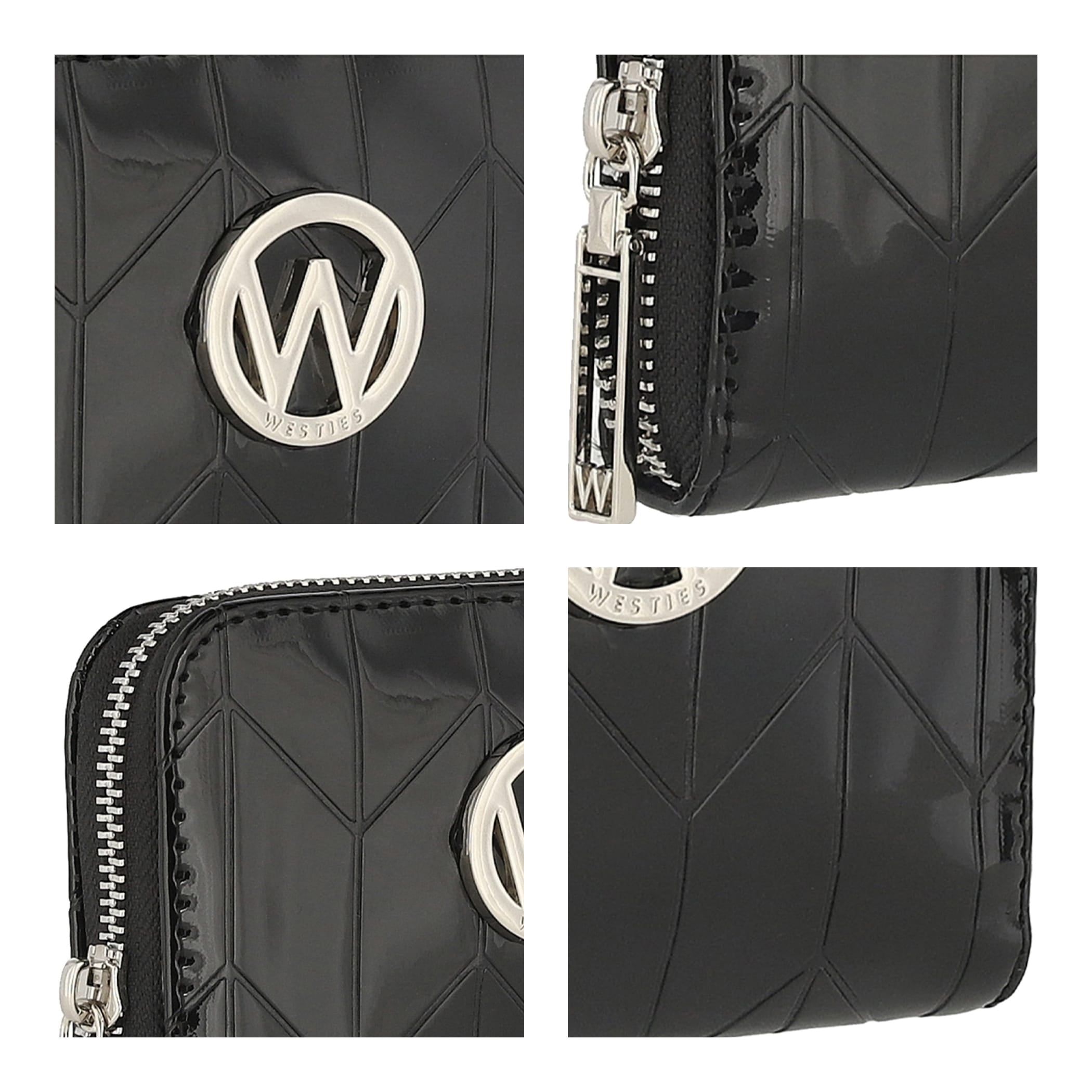 Cartera Westies para mujer elaborada en material charol sintético con estampado liso, fijación de cierre y textura lisa.