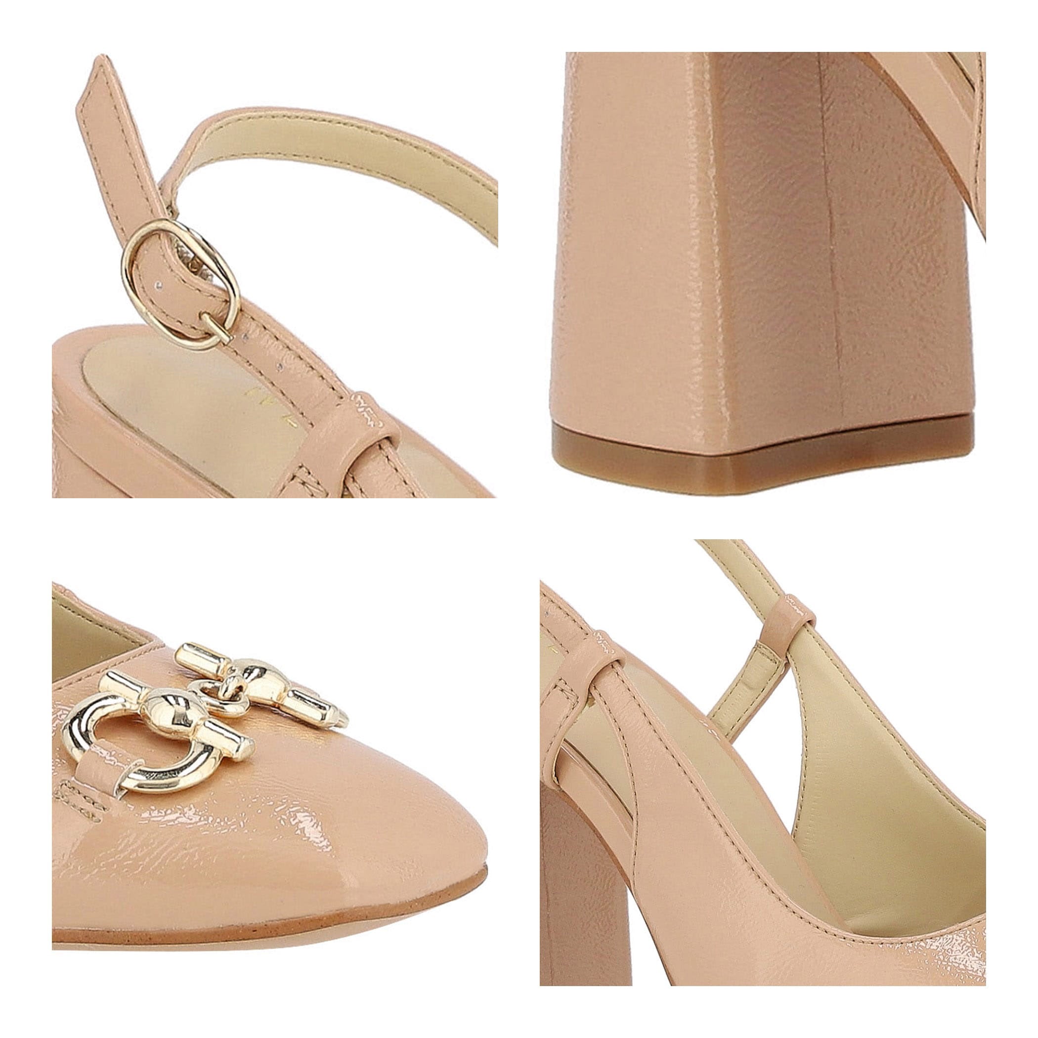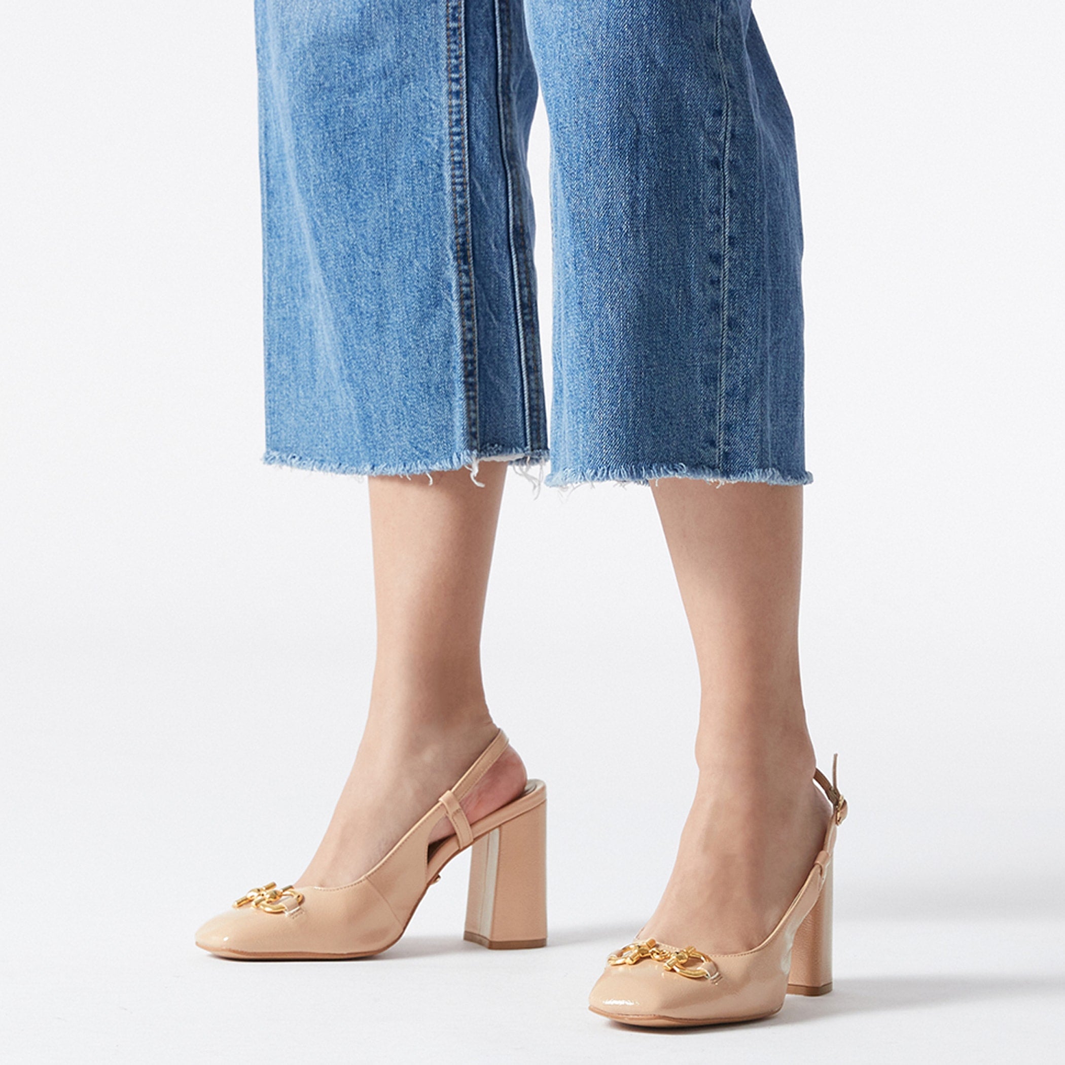 Zapatilla Westies para mujer elaborado en material sintético acabado charol con aplicación de herraje, fijación de hebilla en el tobillo, cuña baja con punta cuadrada, forro sintético, suela pre acabada, y textura lisa.