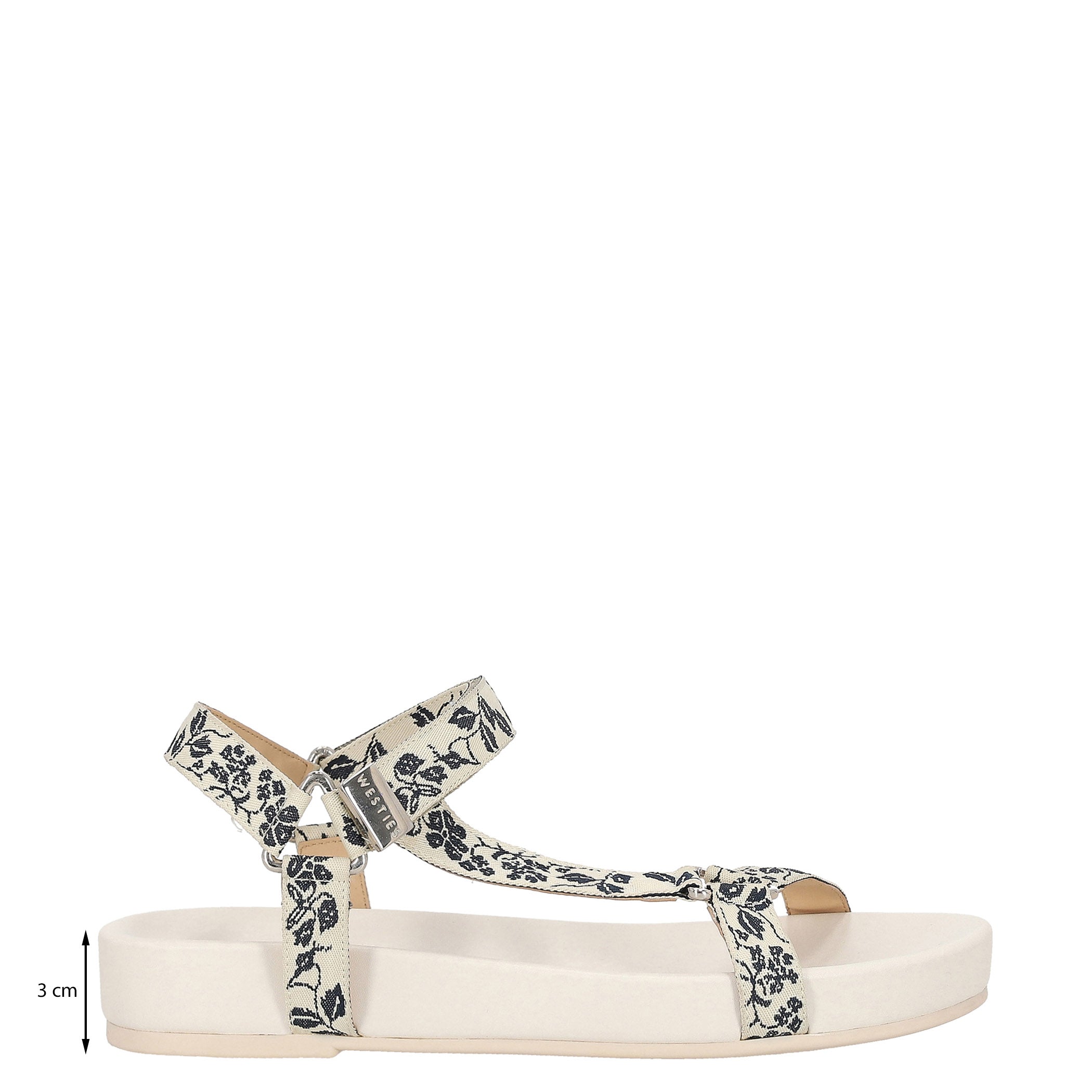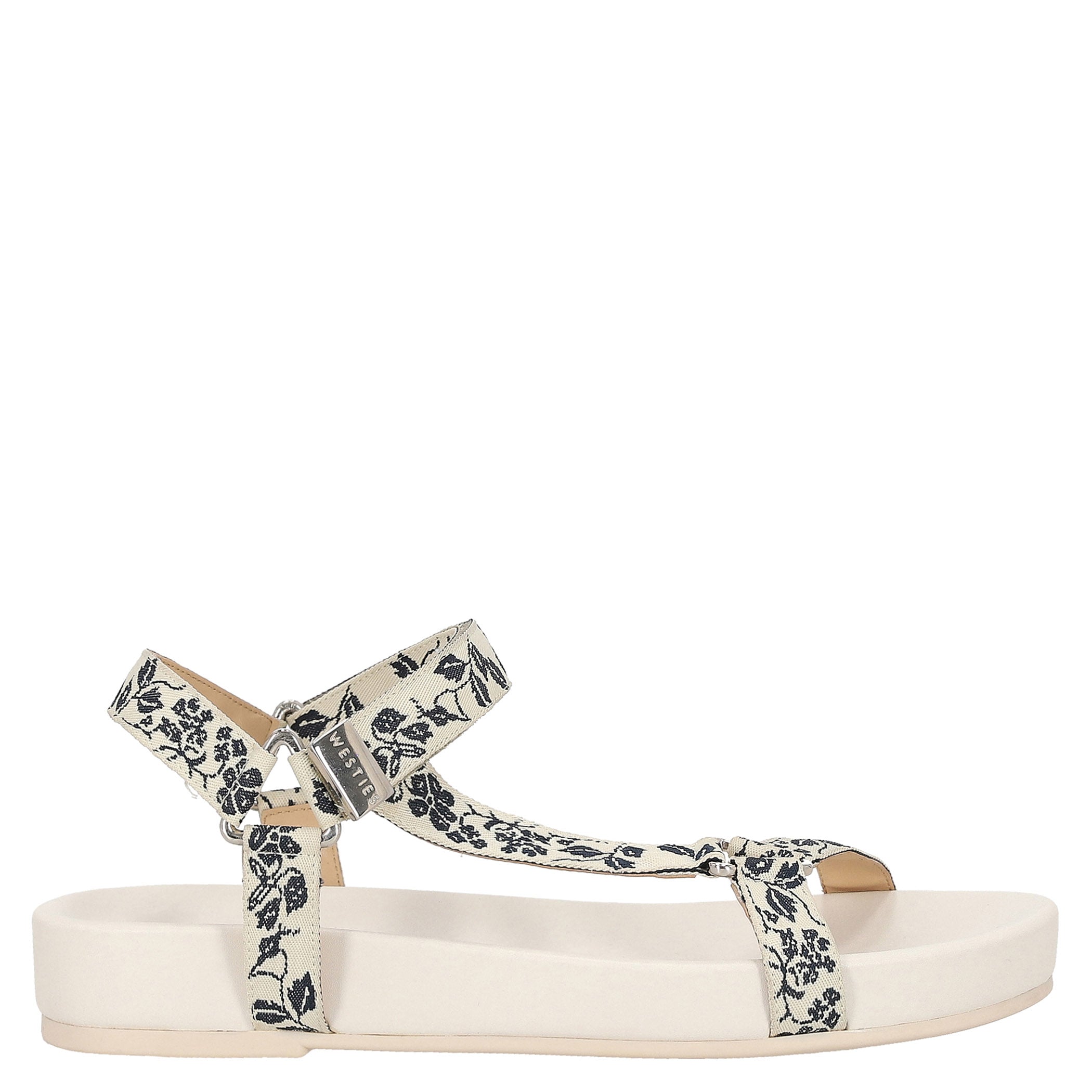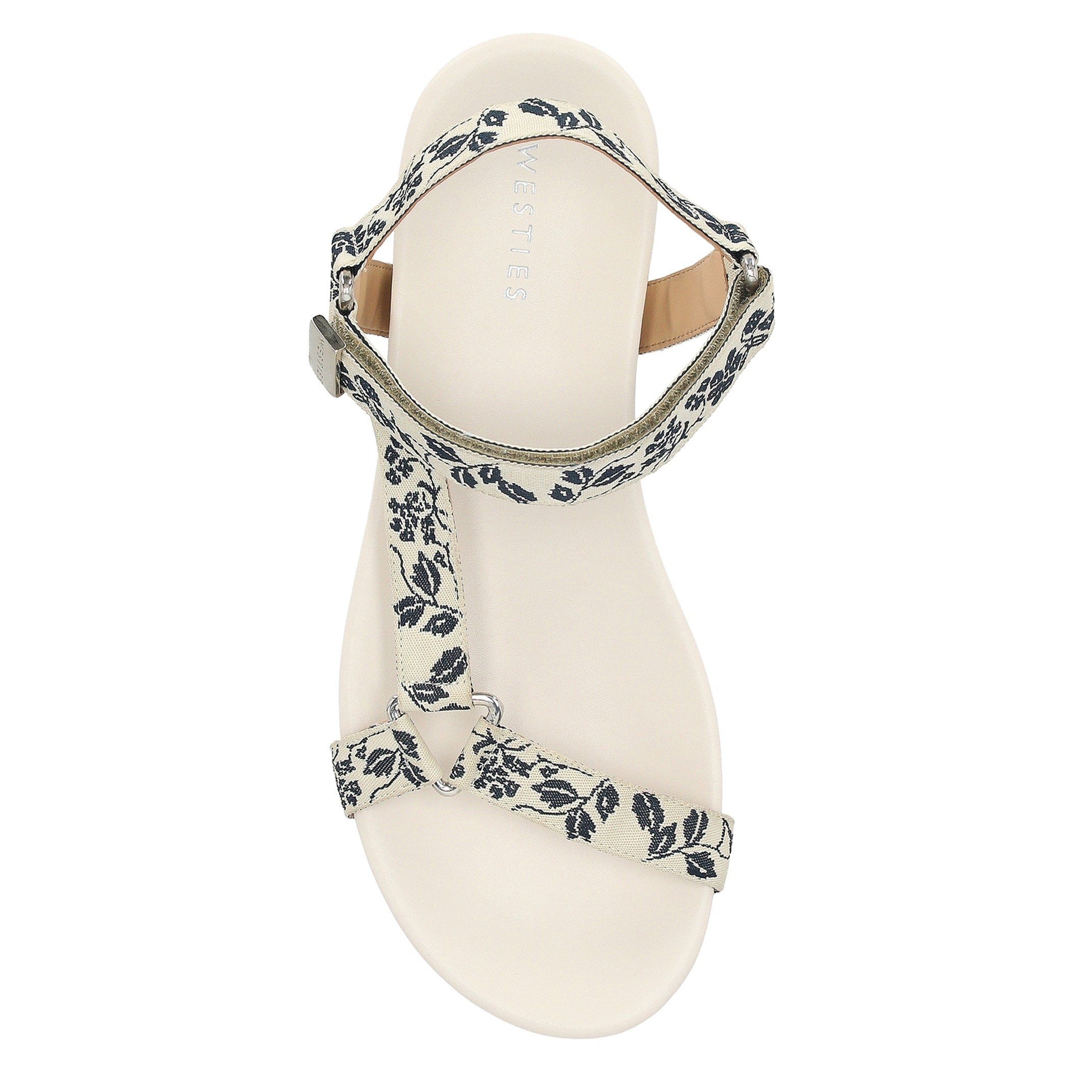 Sandalia Westies para mujer elaborada en material textil con estampado gráfico, fijación de velcro, cuña flat, punta redonda y textura lisa.