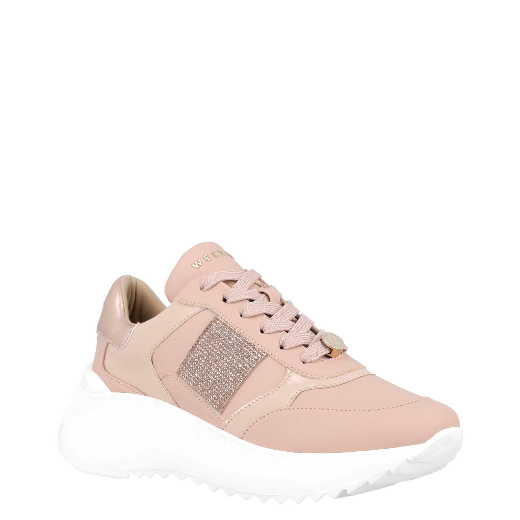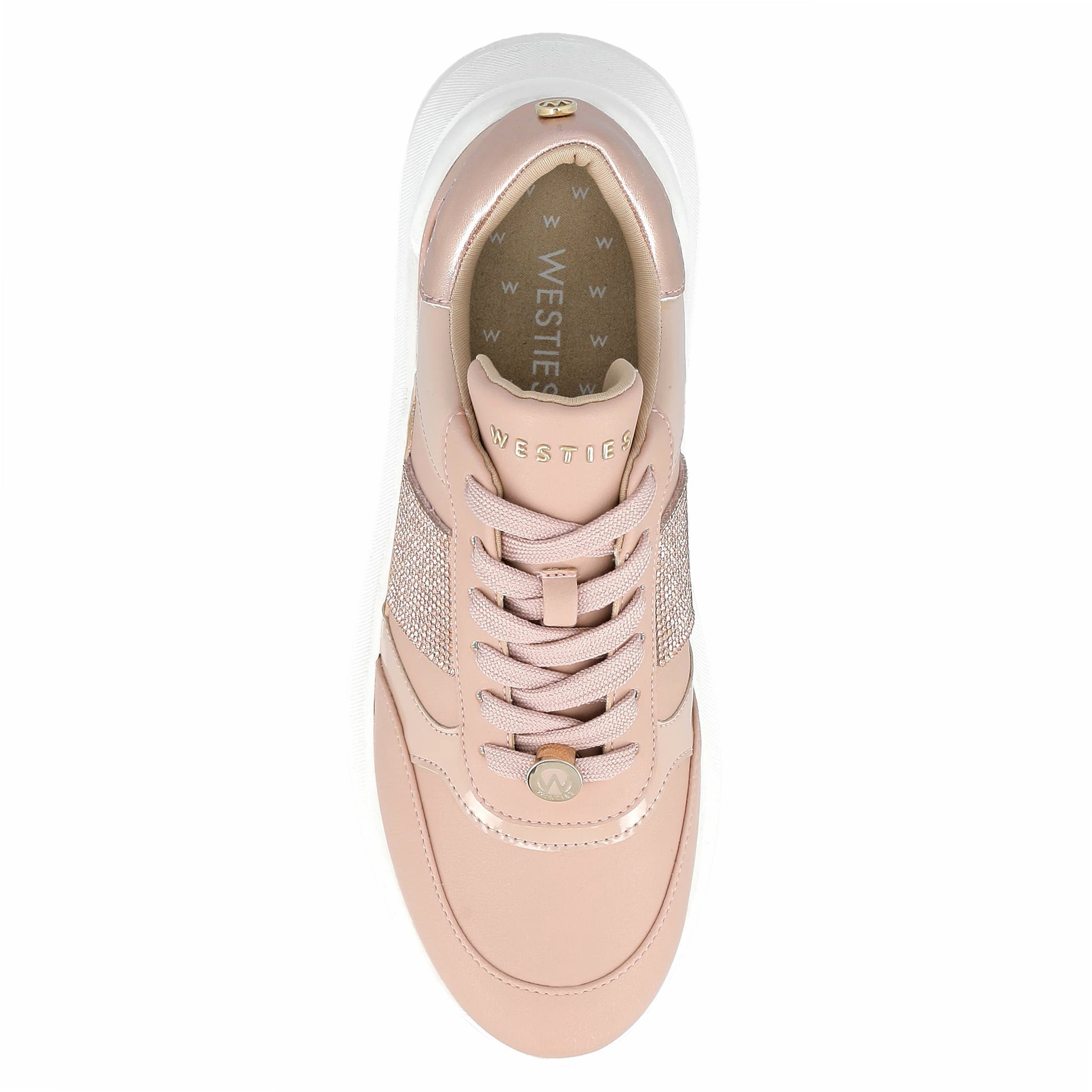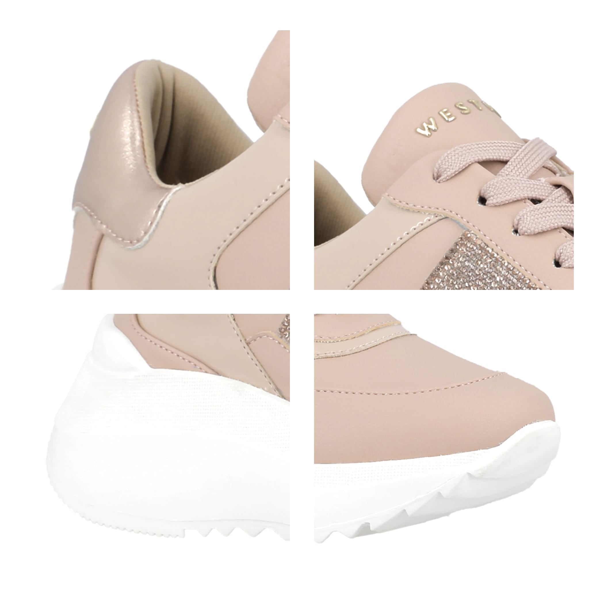 Tenis Westies para mujer elaborado en material sintético con aplicación pedrería, estampado liso, forro textil, suela de inyección, fijación agujeta, punta redonda, textura lisa, con una altura de plataforma 2.8 cm.