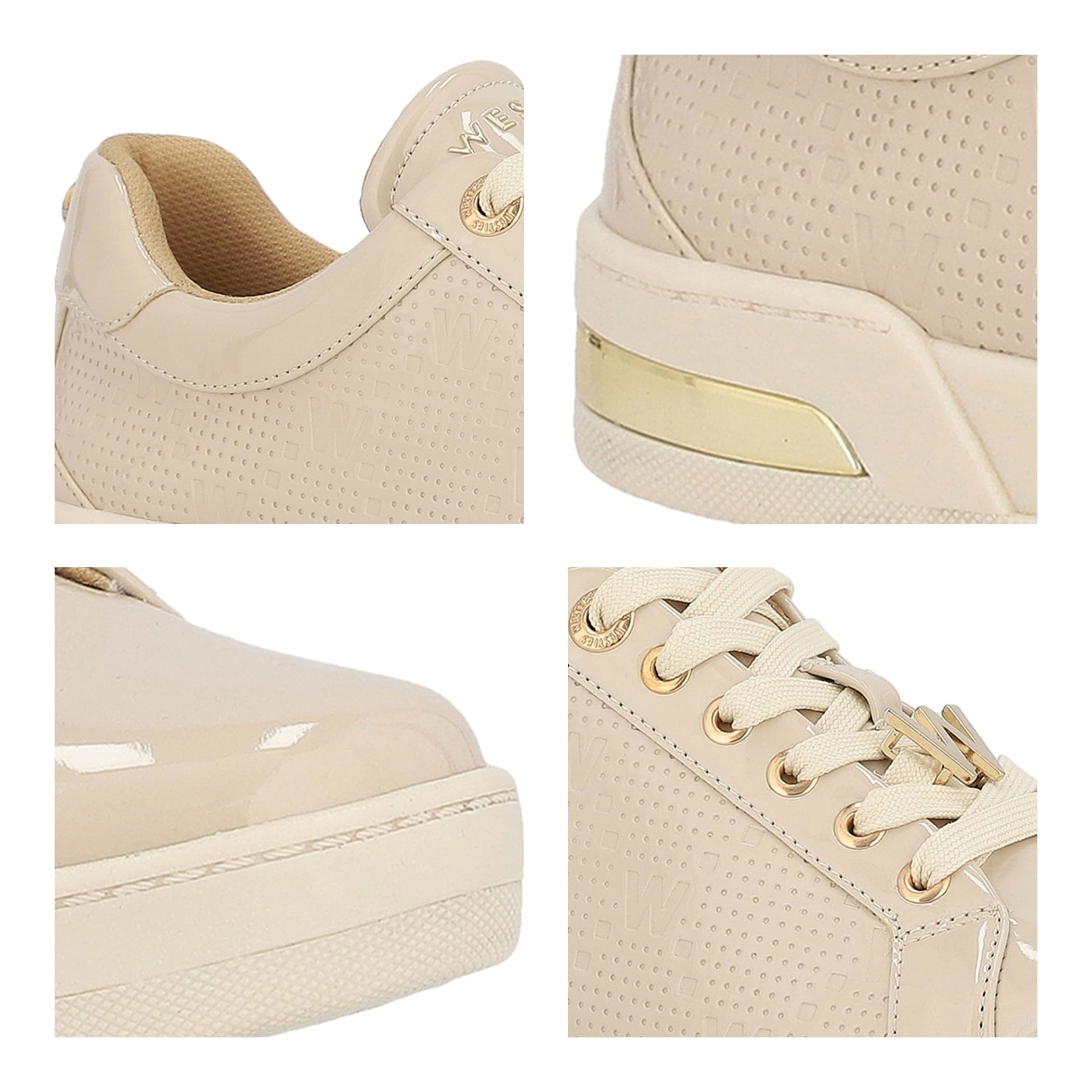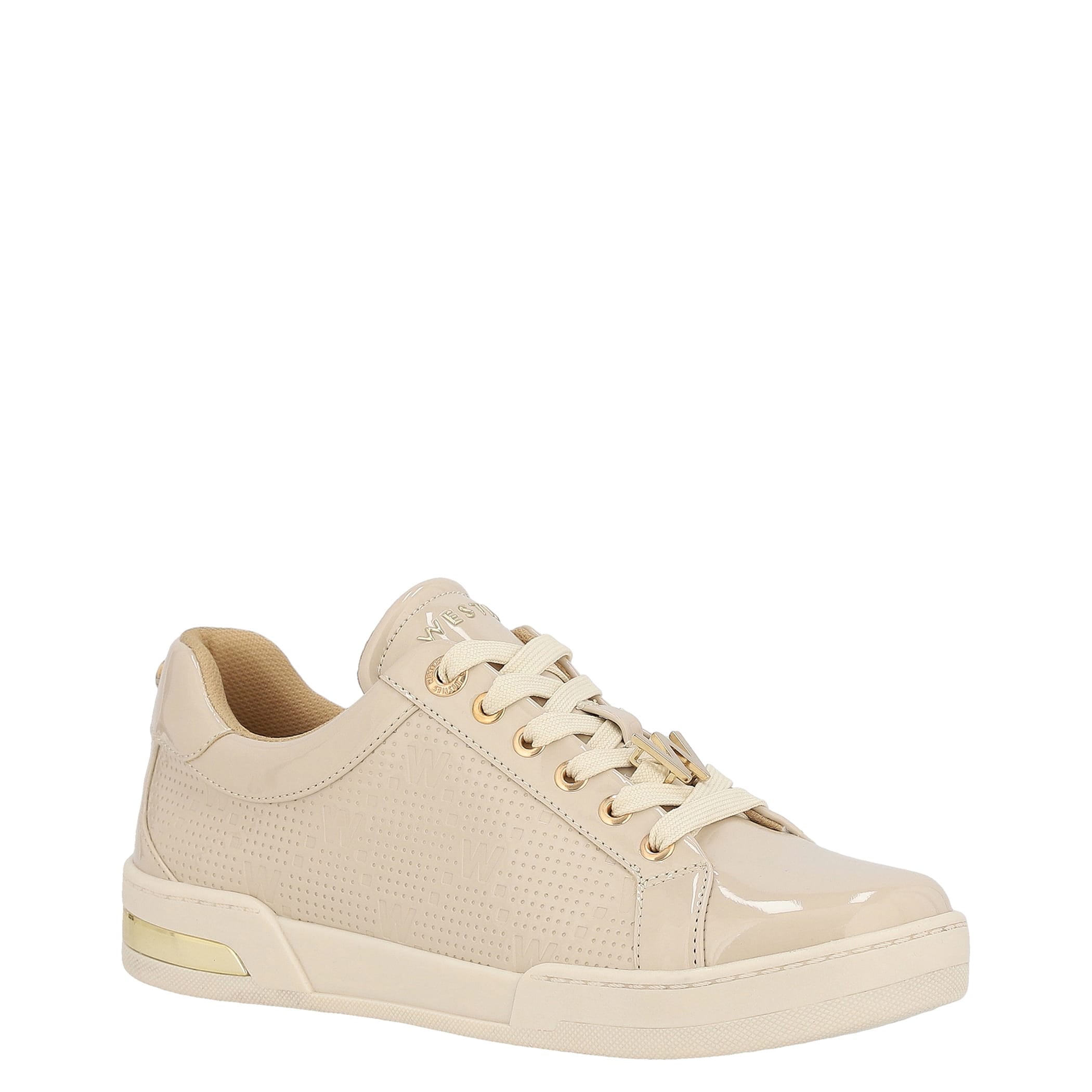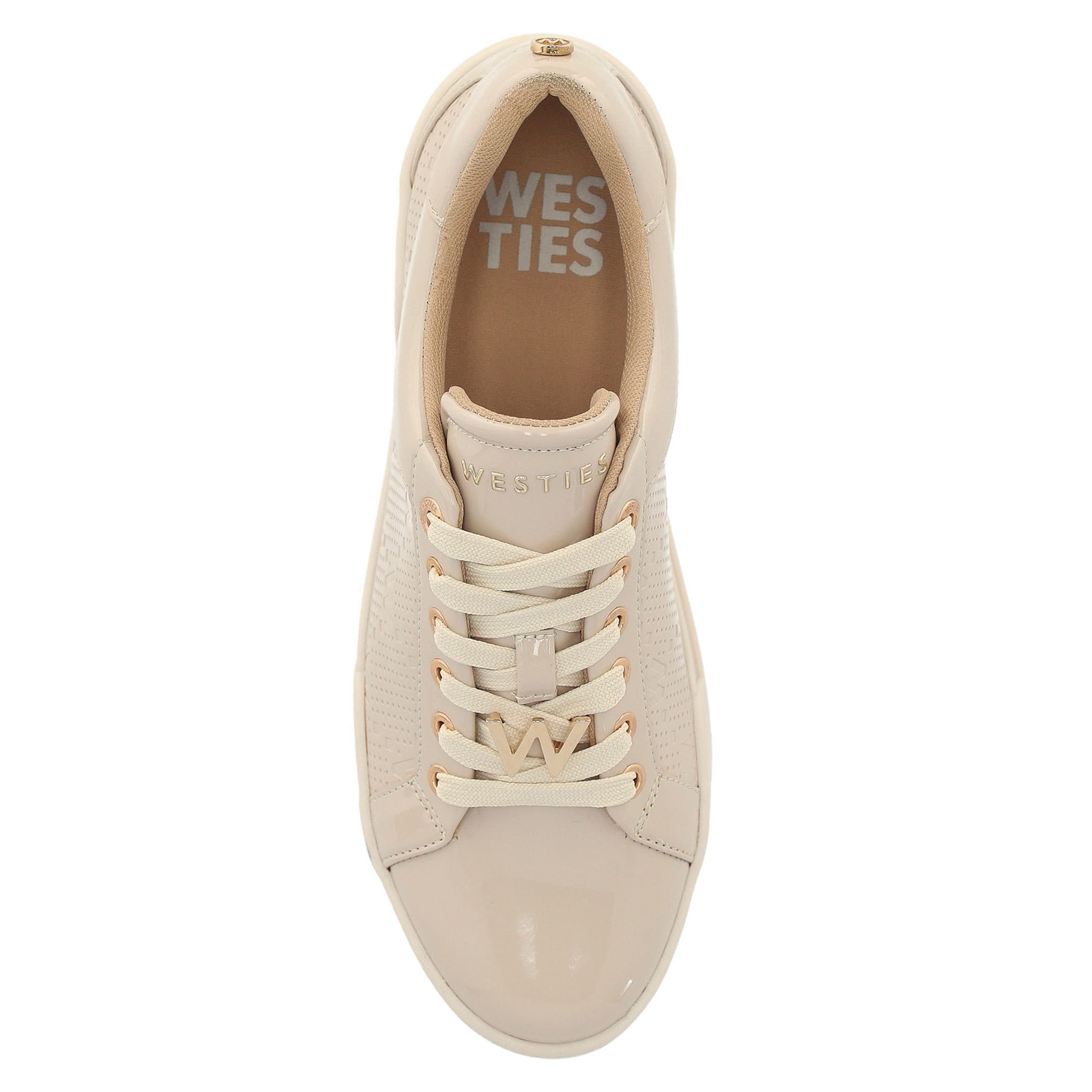 Tenis Westies para mujer elaborado en material charol sintético con estampado de logotipo, fijación de agujeta, punta redonda, cuña flat y textura lisa.
