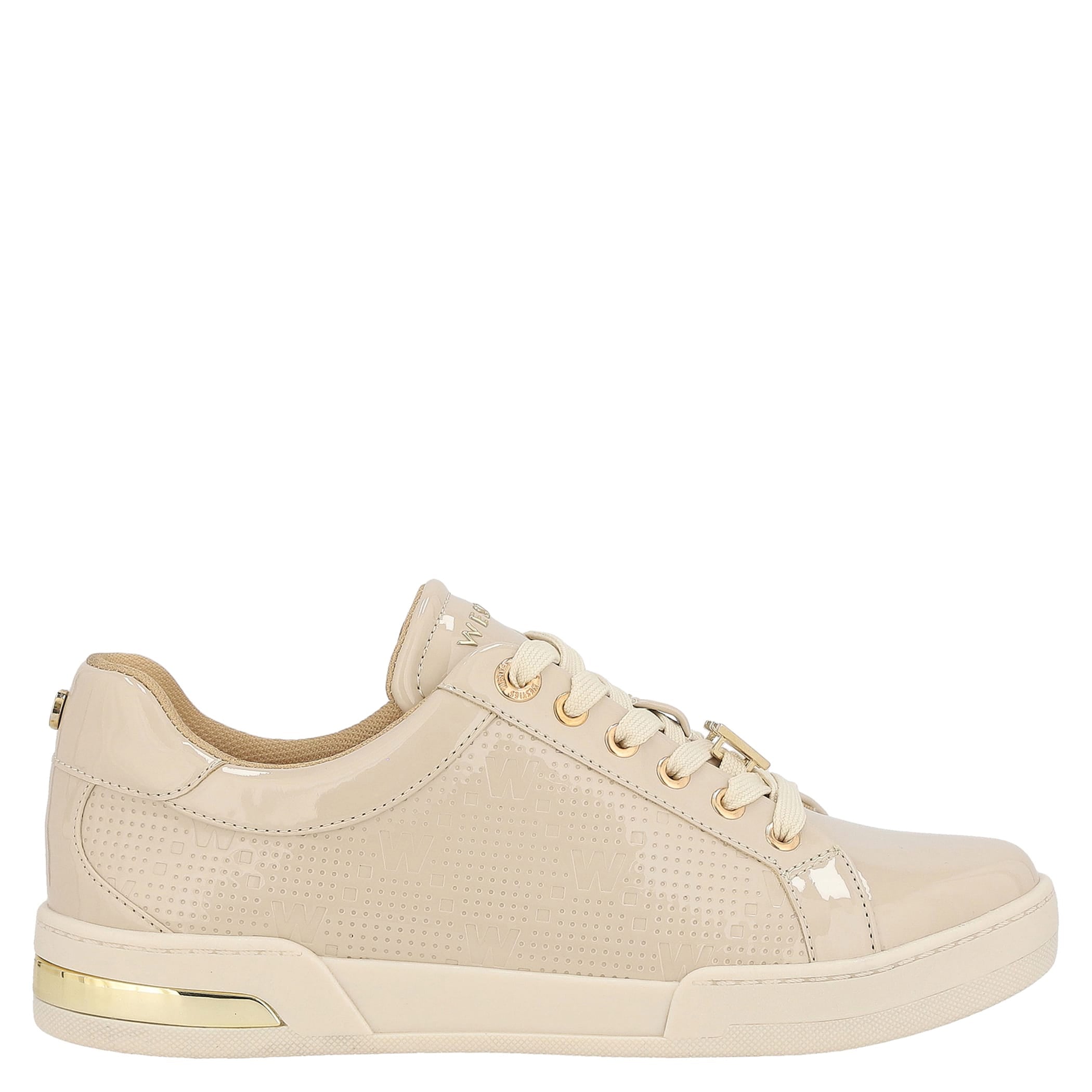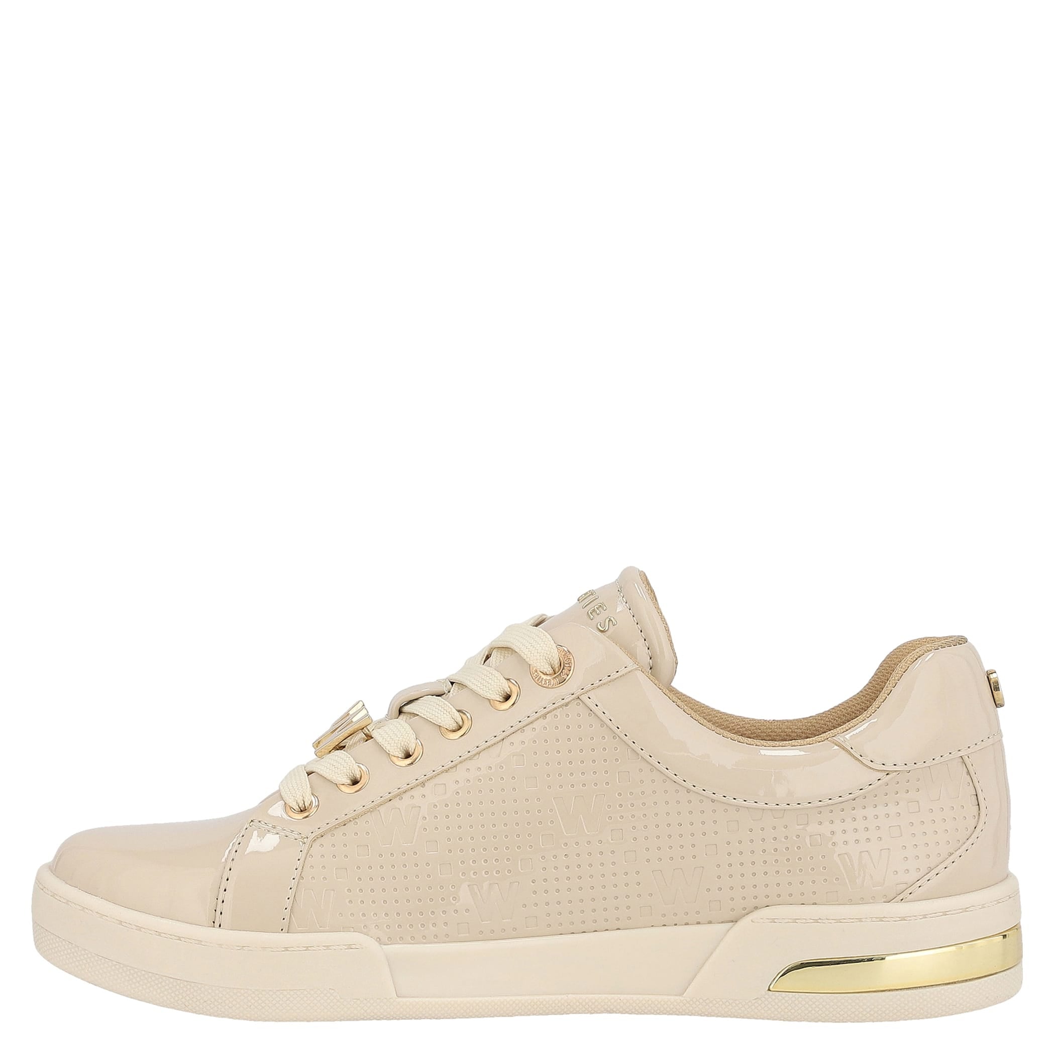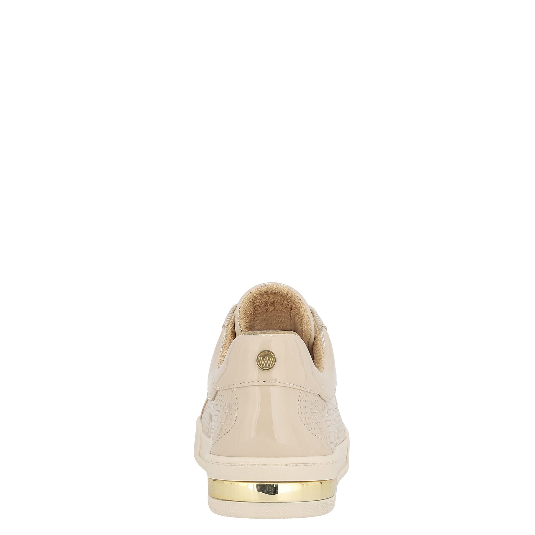 Tenis Westies para mujer elaborado en material charol sintético con estampado de logotipo, fijación de agujeta, punta redonda, cuña flat y textura lisa.
