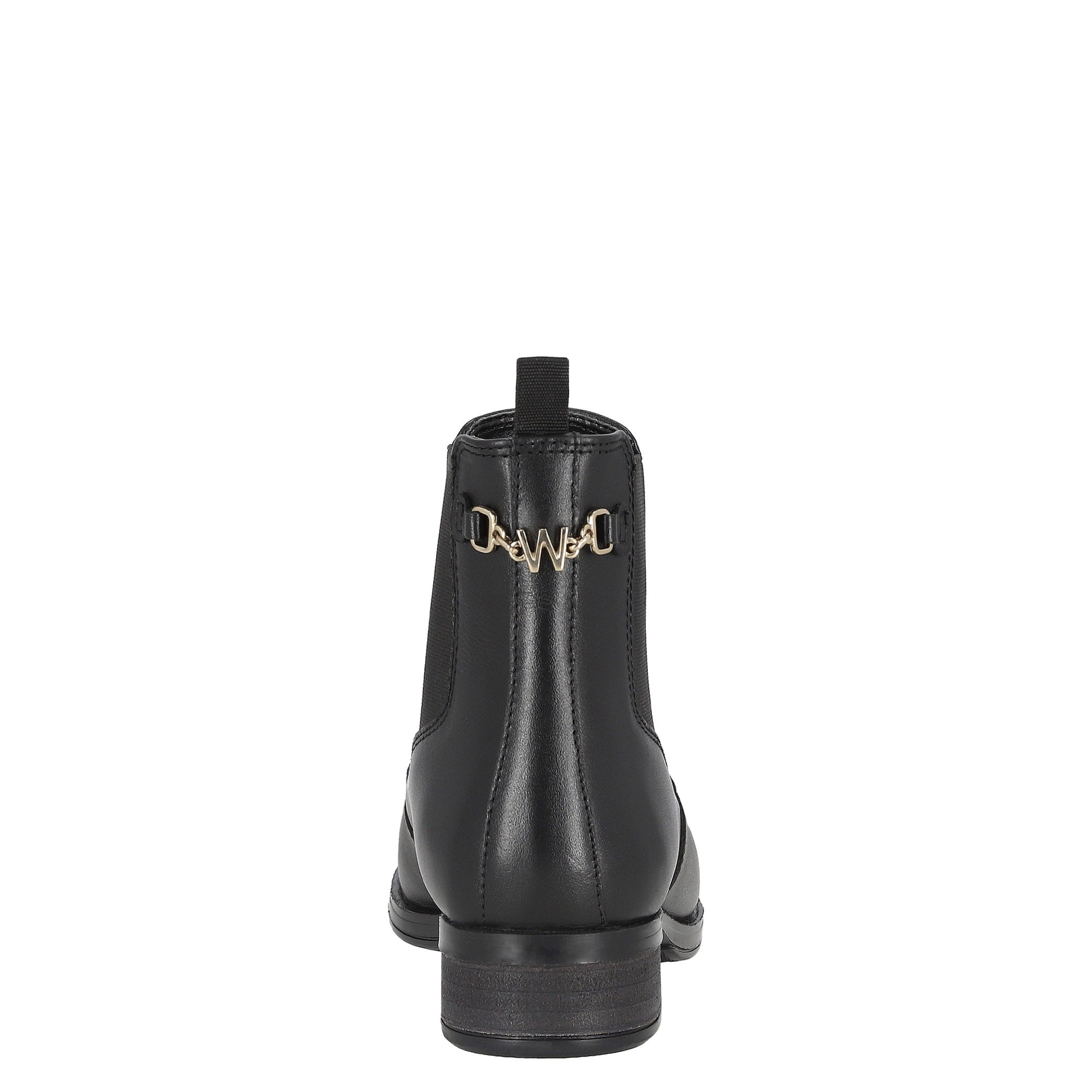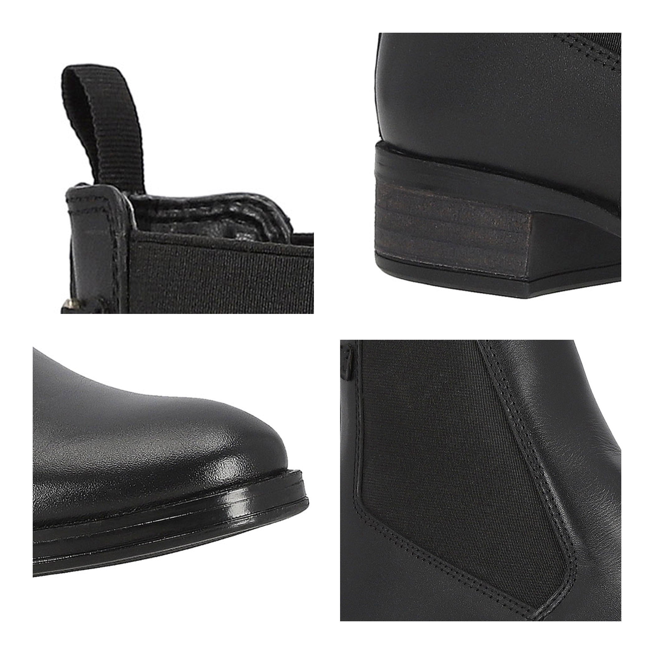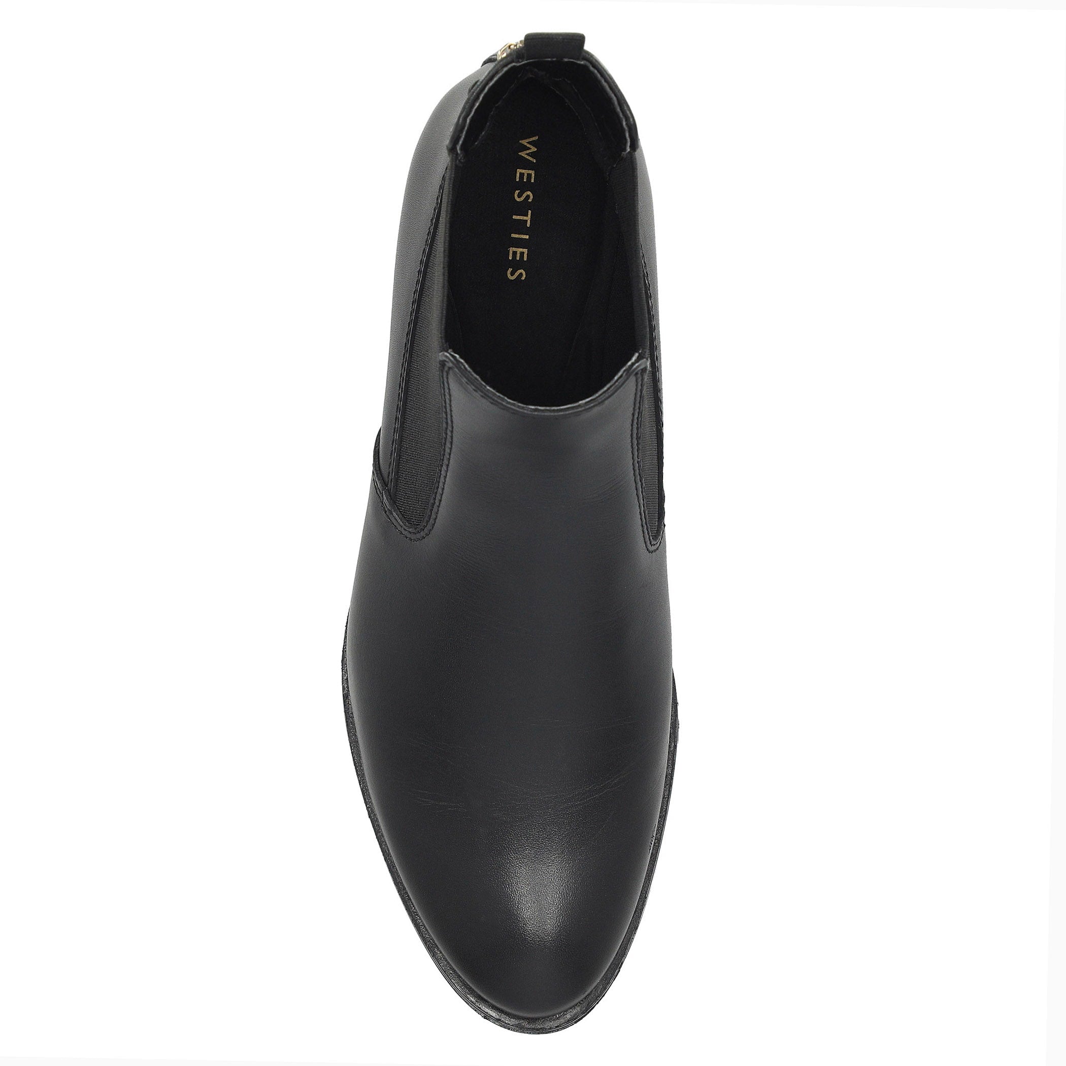 Botin Westies para mujer elaborado en material de piel con aplicación de herraje, estampado liso, fijación de cierre, punta redonda, textura lisa, suela de inyección y cuña flat.