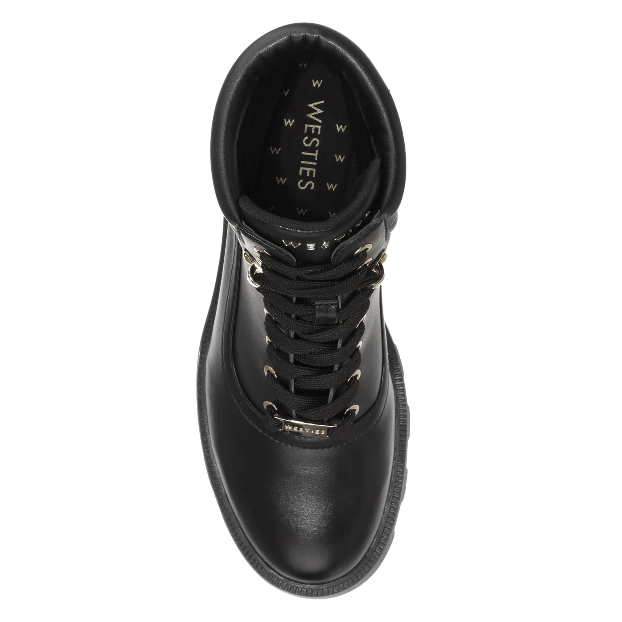 Botín Westies para mujer elaborado en material sintético con fijación de agujeta, cuña baja con punta redonda, forro textil, suela sintética, y textura lisa.