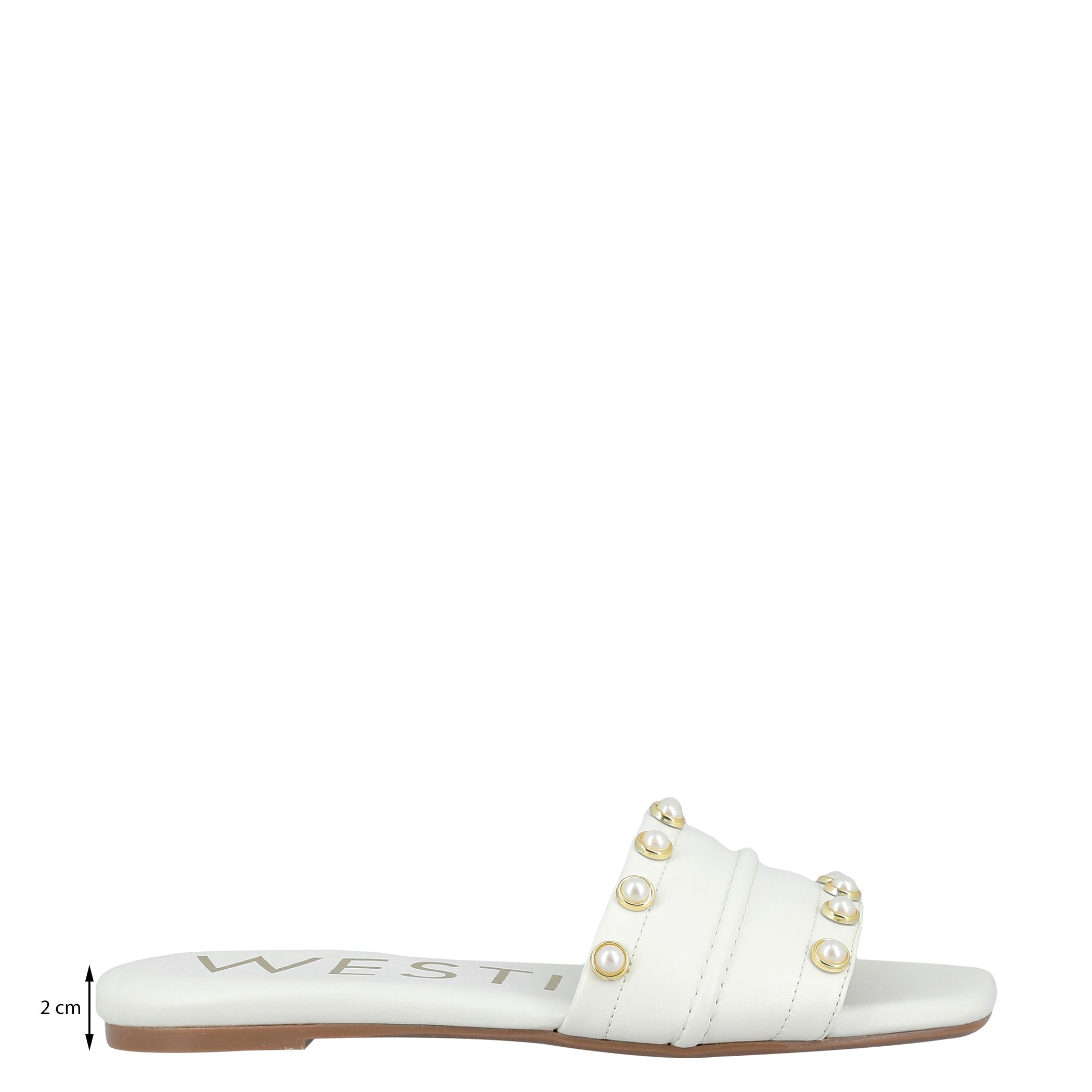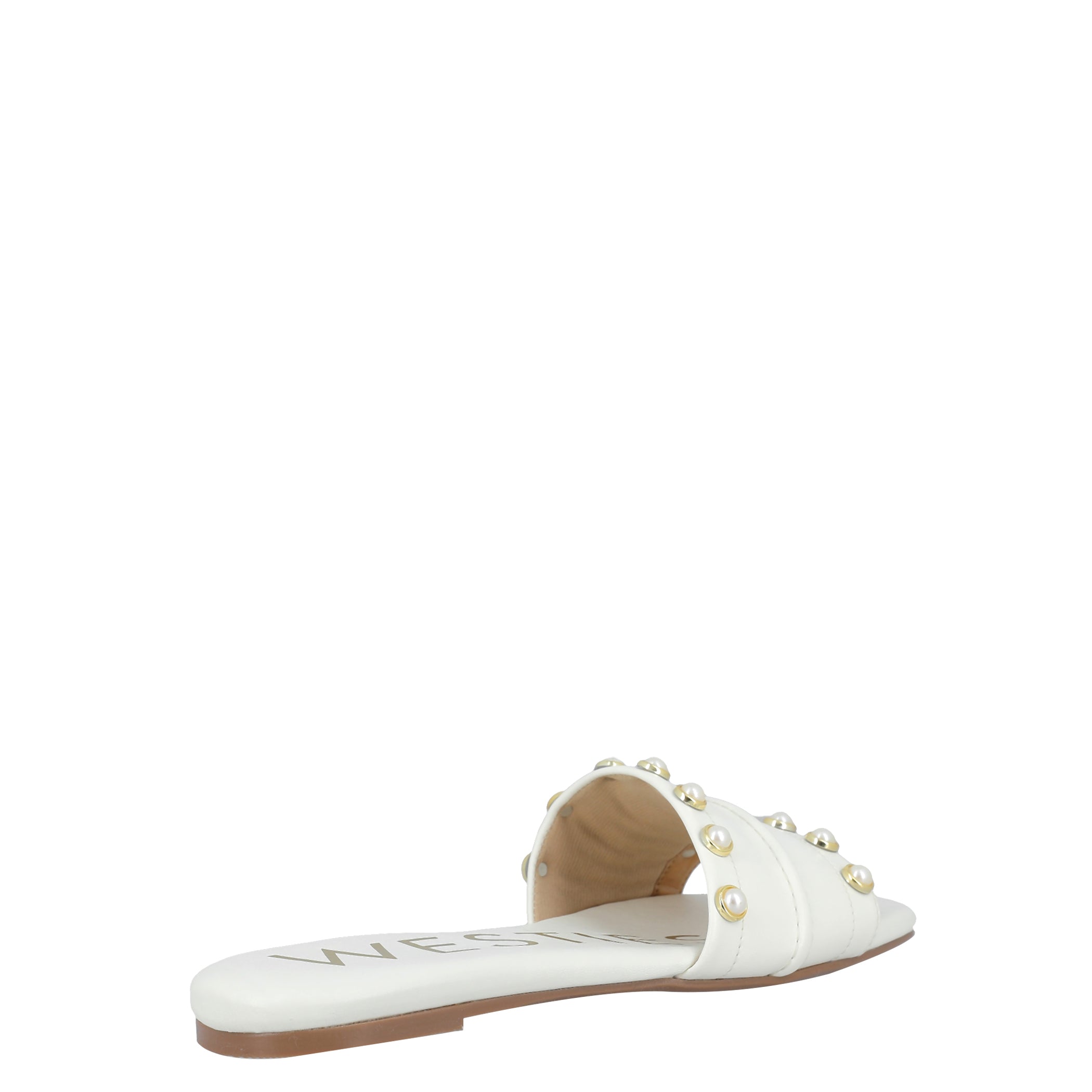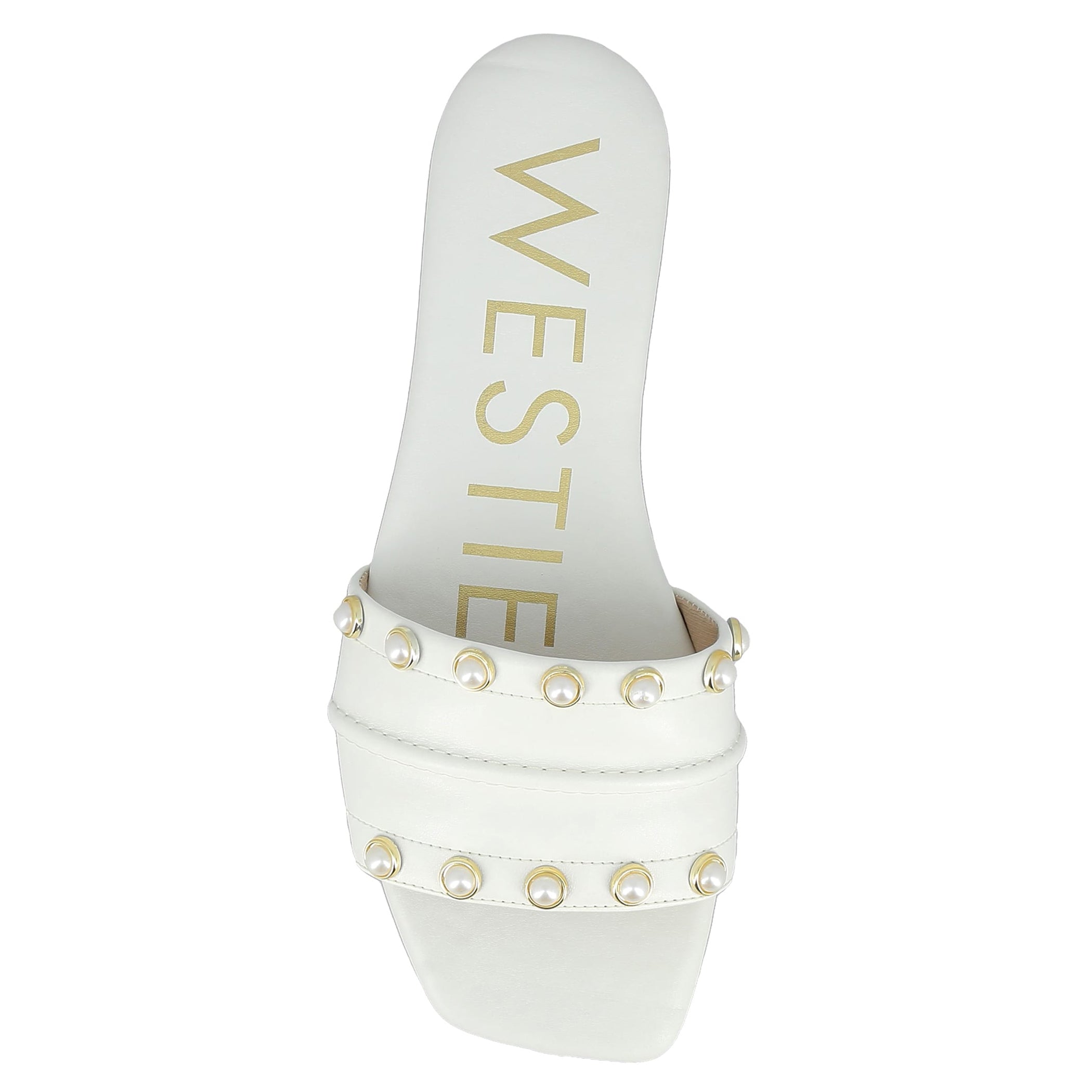 Sandalia Westies para mujer elaborado en material sintético con aplicación perla, estampado liso, forro sintético, suela inyección, fijación abierto, punta cuadrada, textura lisa, con una altura de tacón 2 cm.