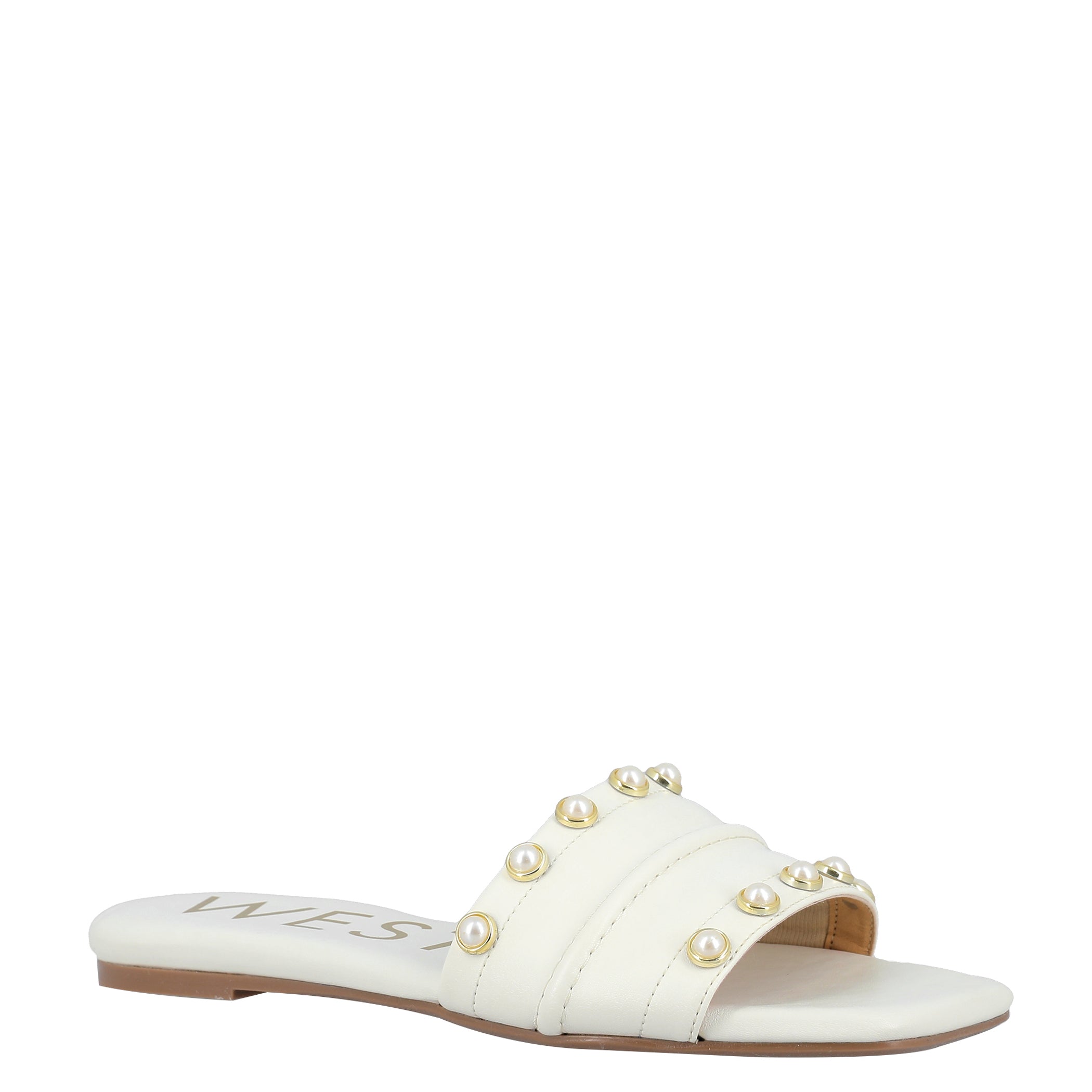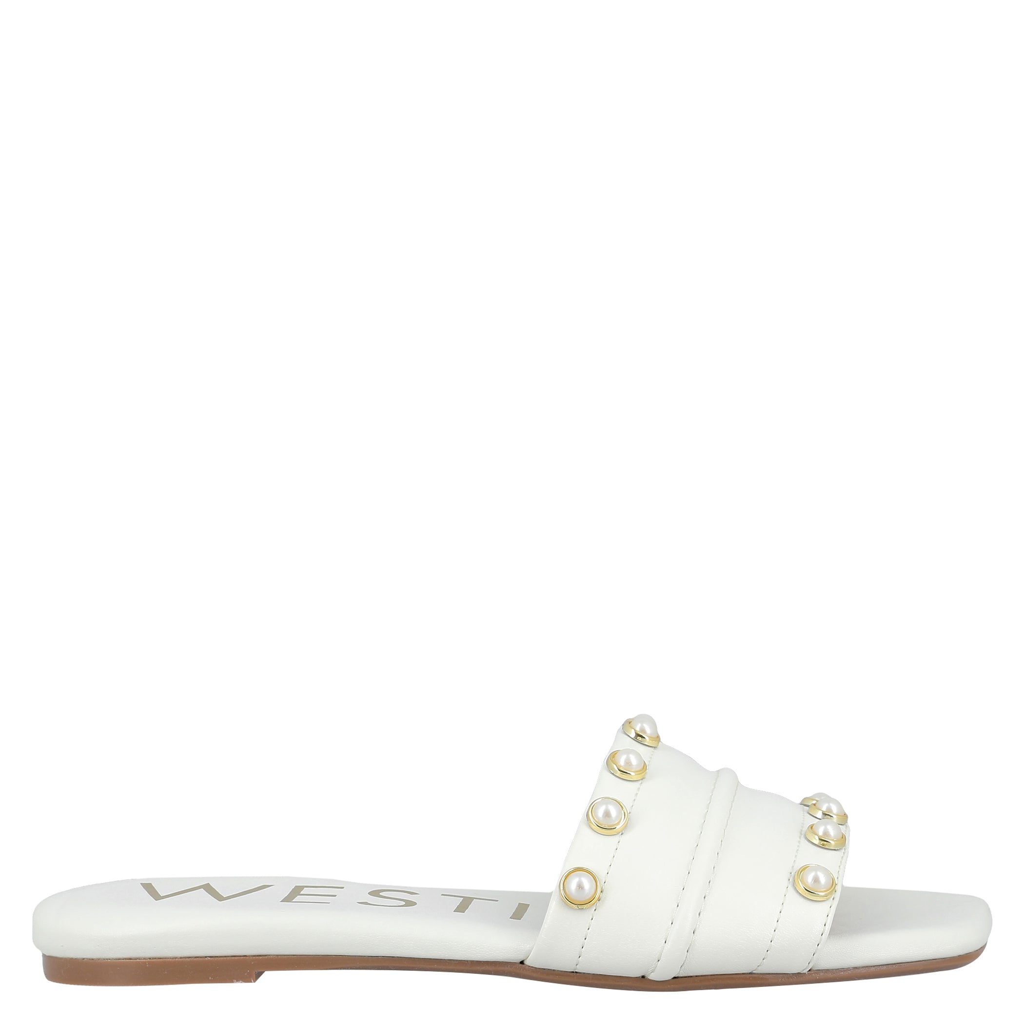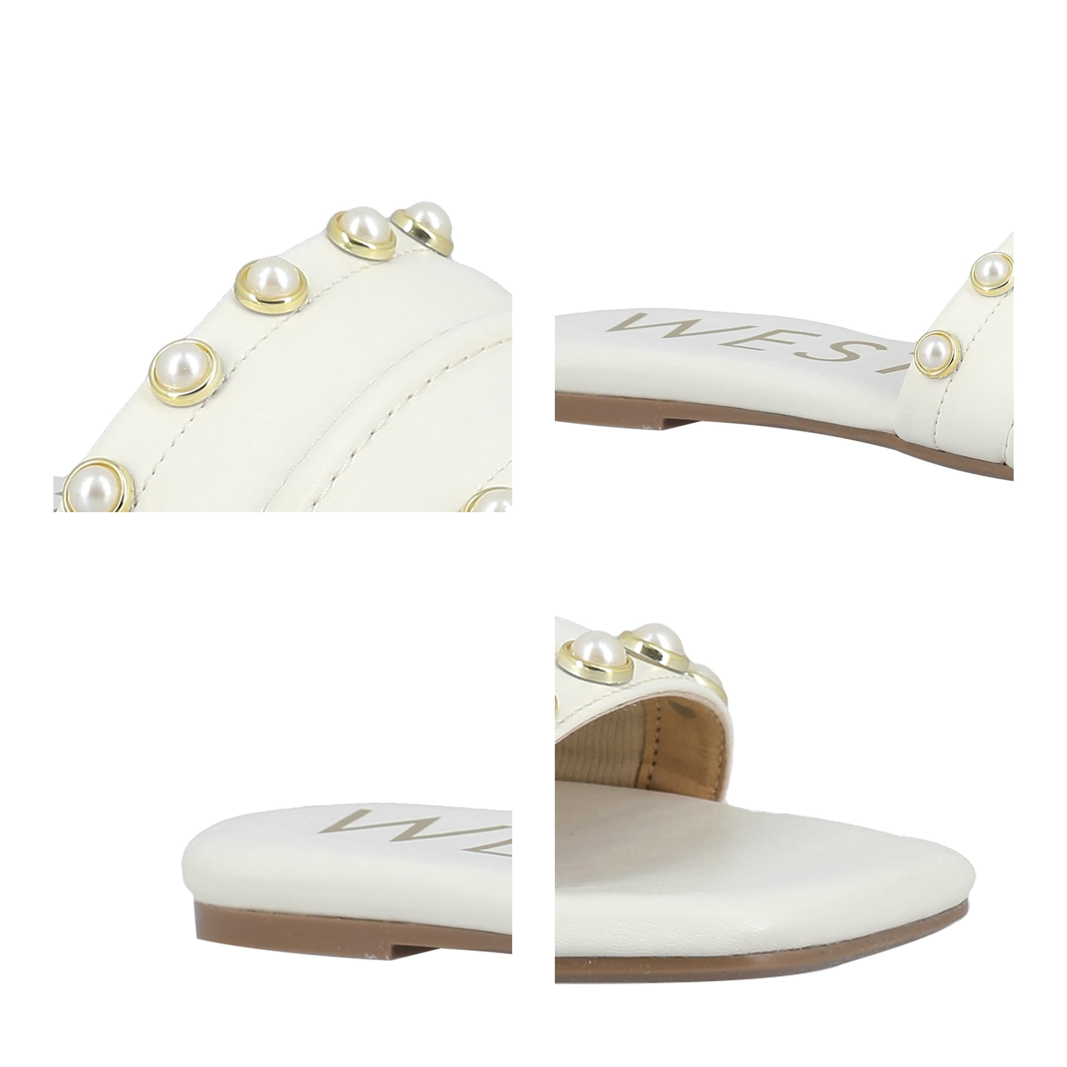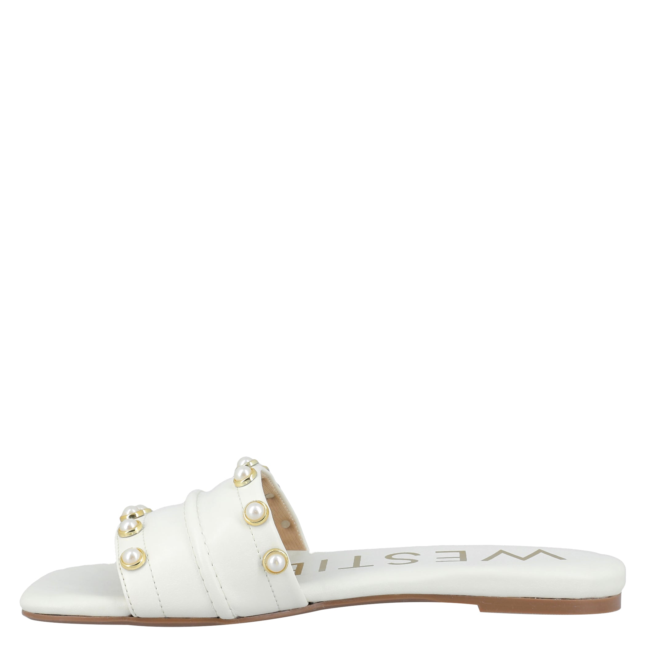 Sandalia Westies para mujer elaborado en material sintético con aplicación perla, estampado liso, forro sintético, suela inyección, fijación abierto, punta cuadrada, textura lisa, con una altura de tacón 2 cm.