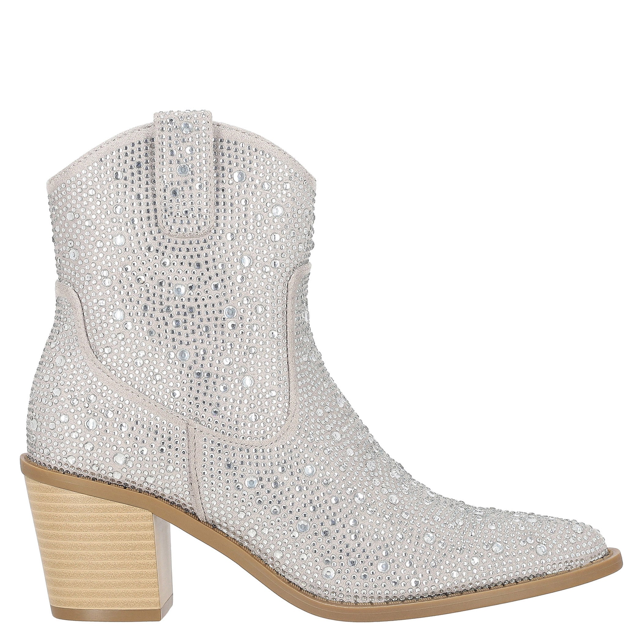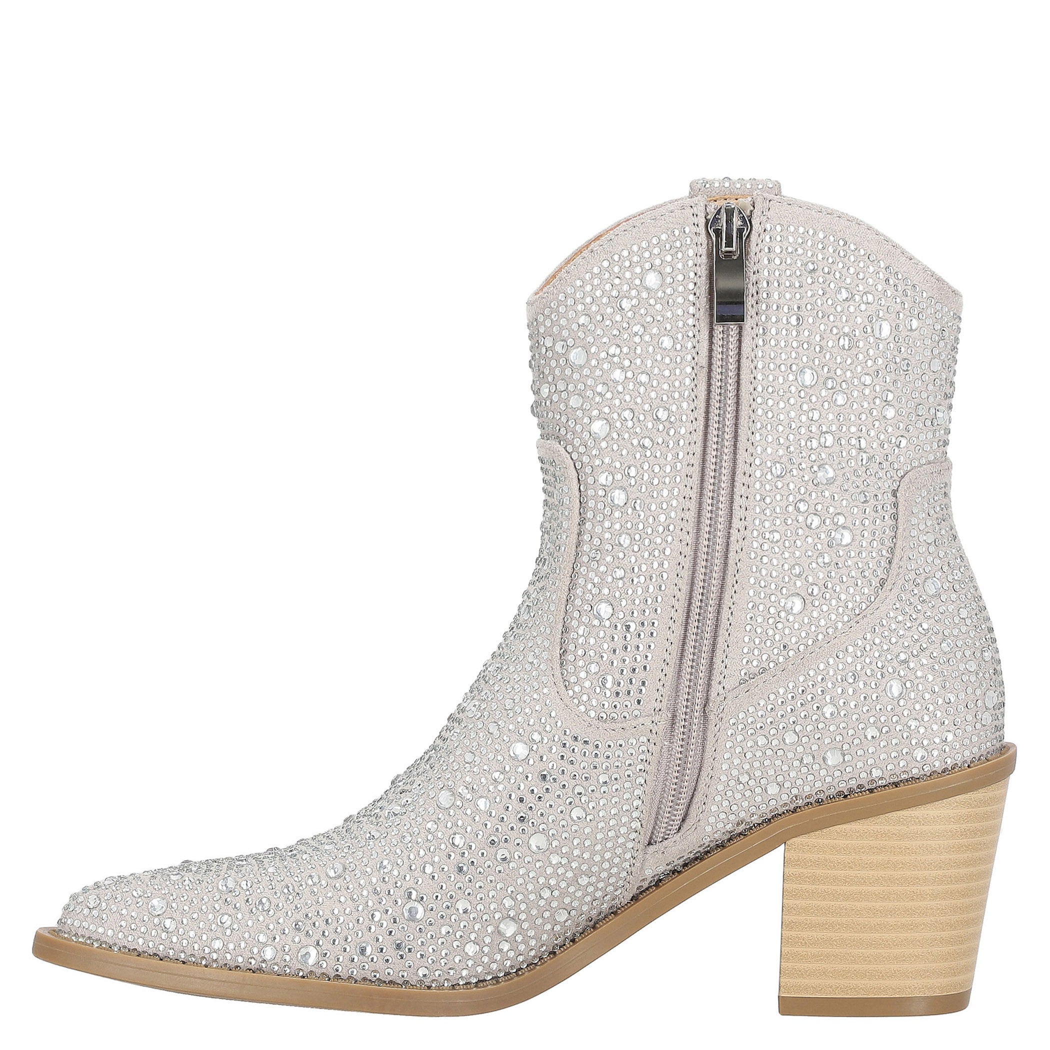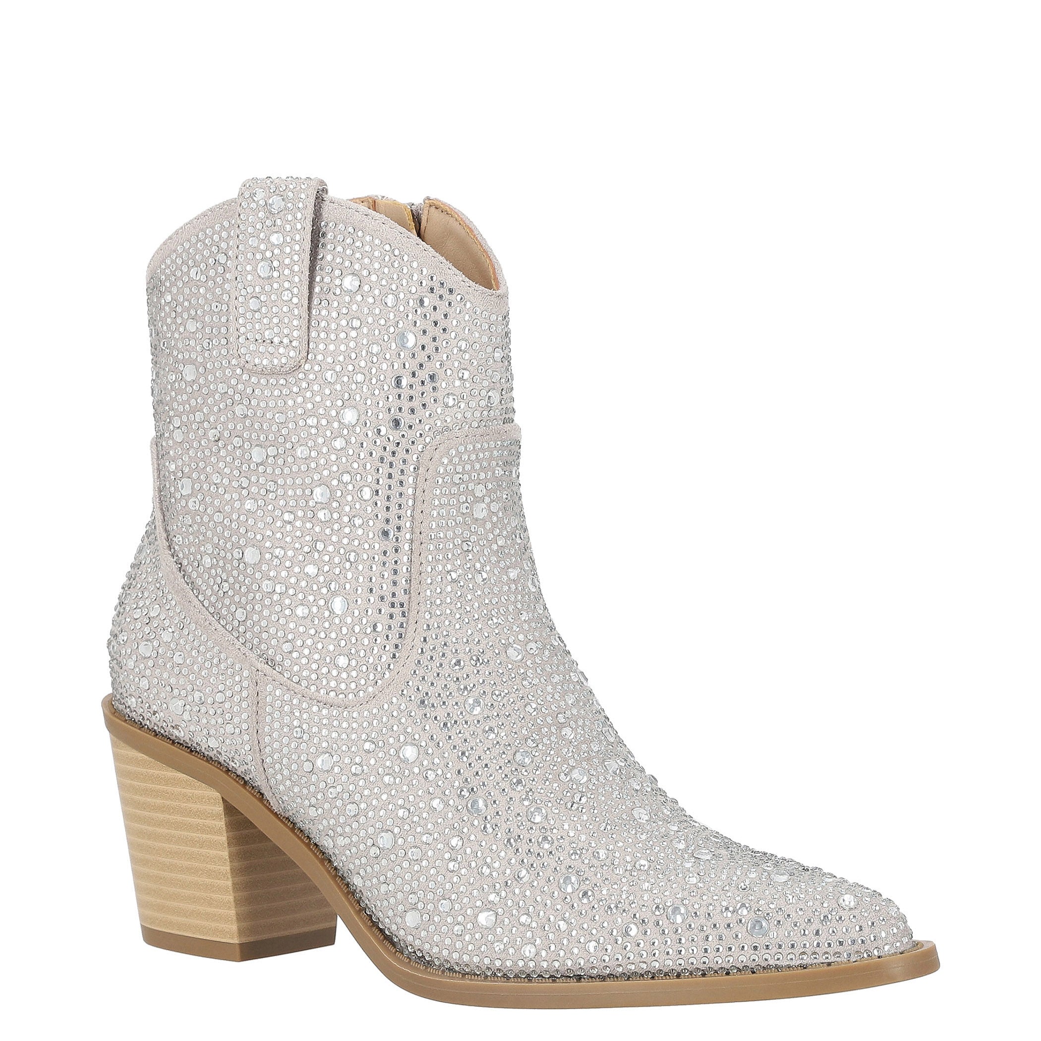 Botín Westies para mujer elaborado en material textil con aplicación de pedrería, estampado liso, fijación de cierre, punta puntal, suela sintética, cuña baja y textura lisa.