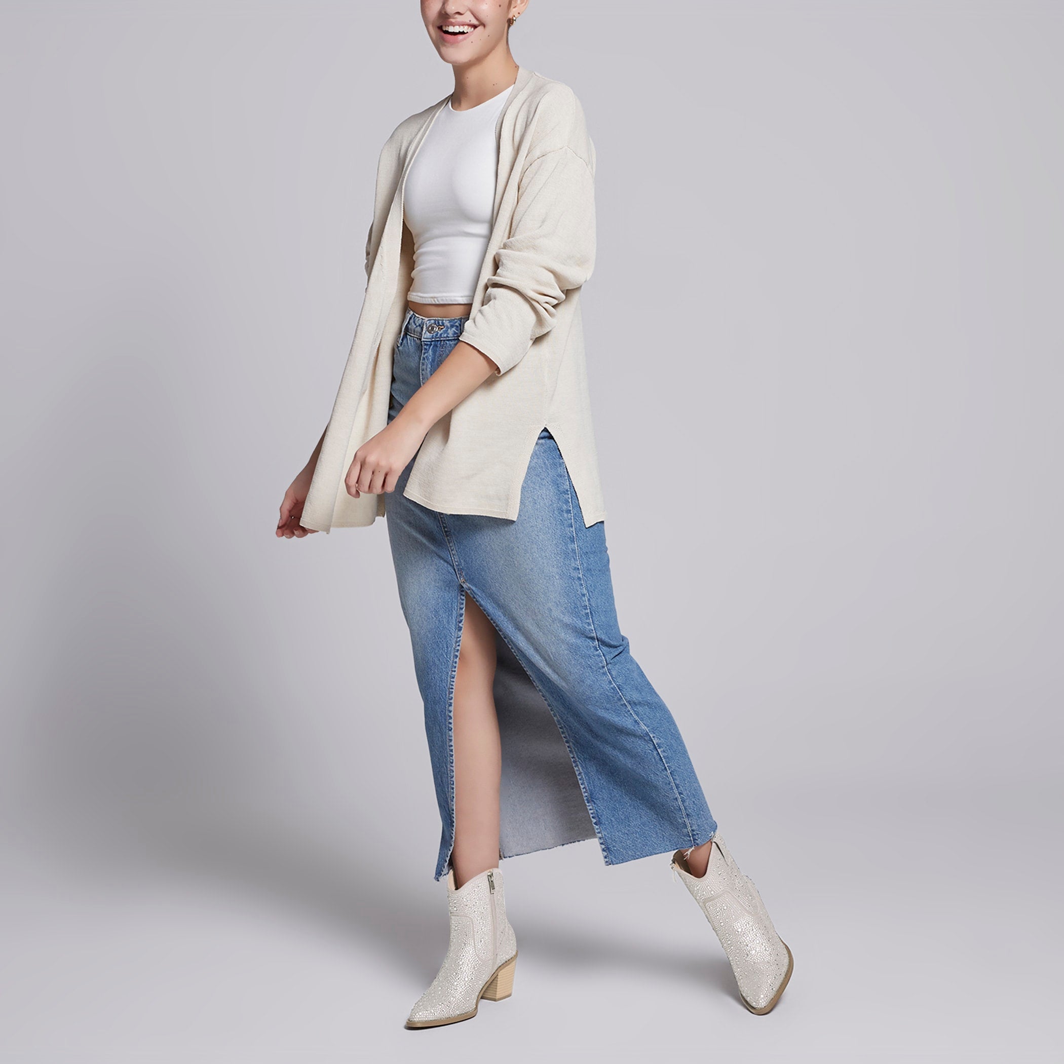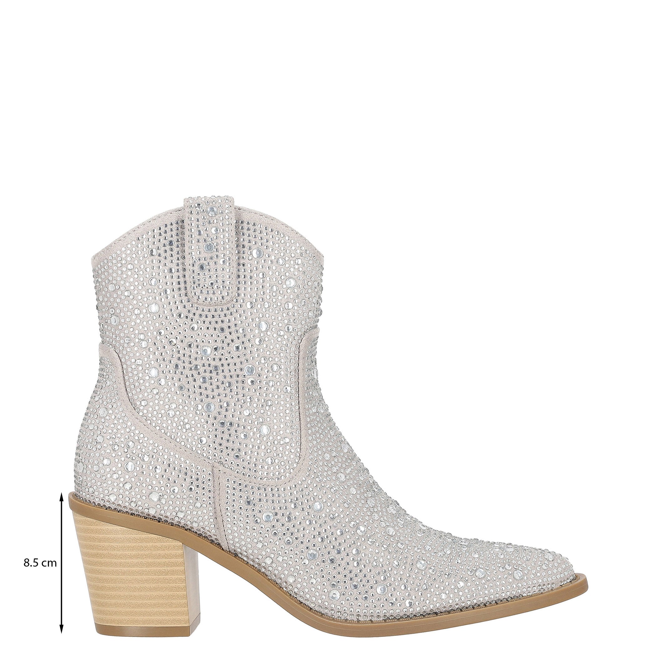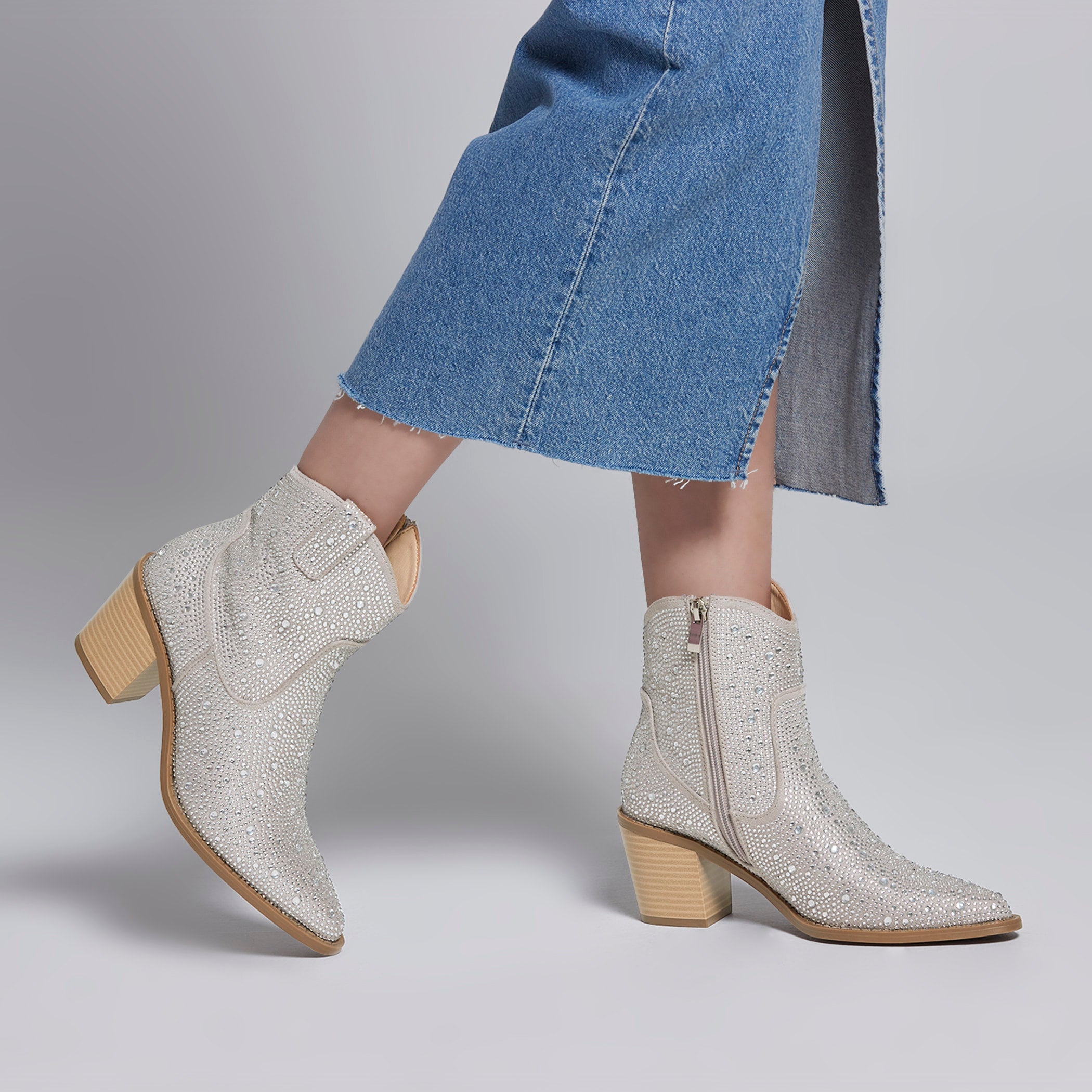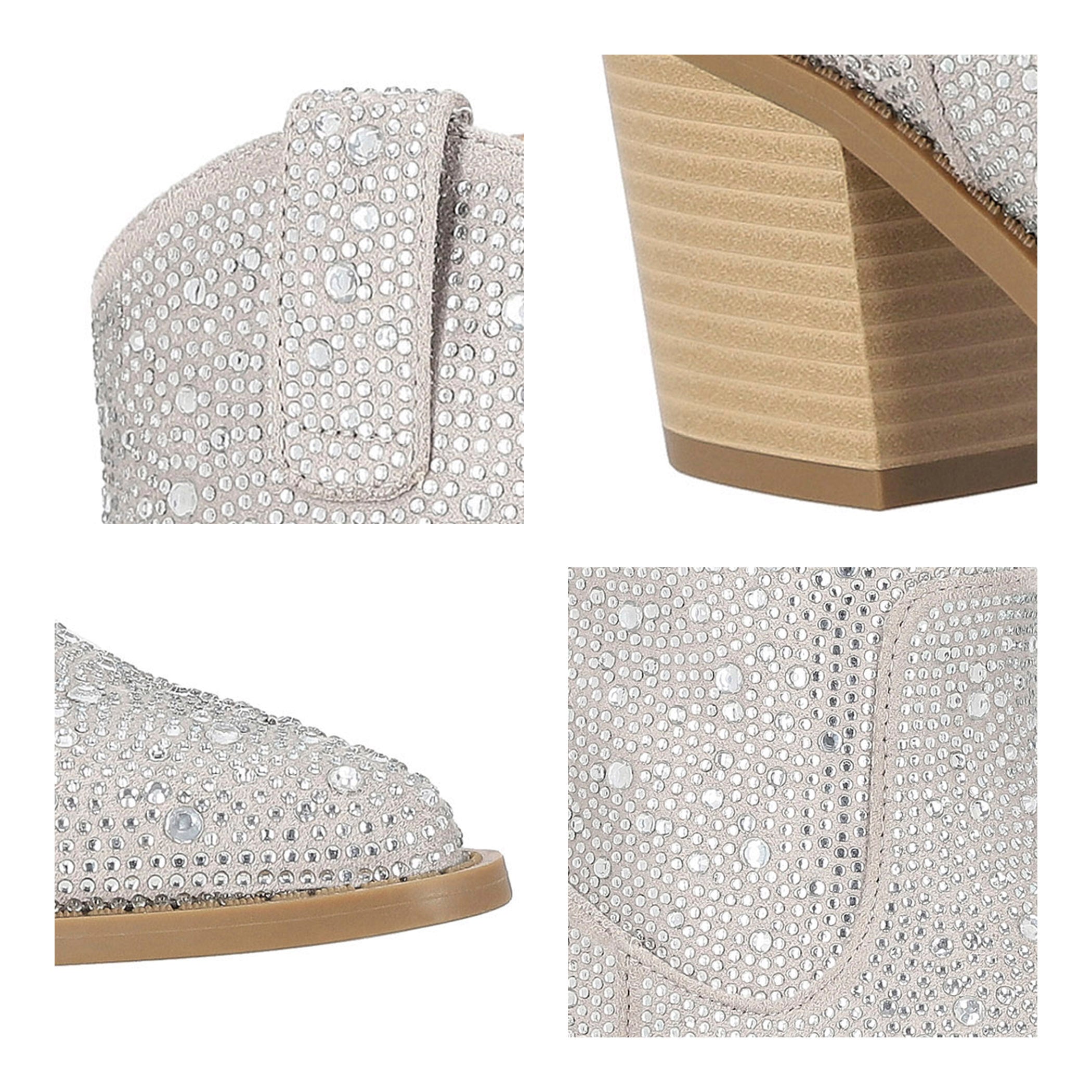 Botín Westies para mujer elaborado en material textil con aplicación de pedrería, estampado liso, fijación de cierre, punta puntal, suela sintética, cuña baja y textura lisa.