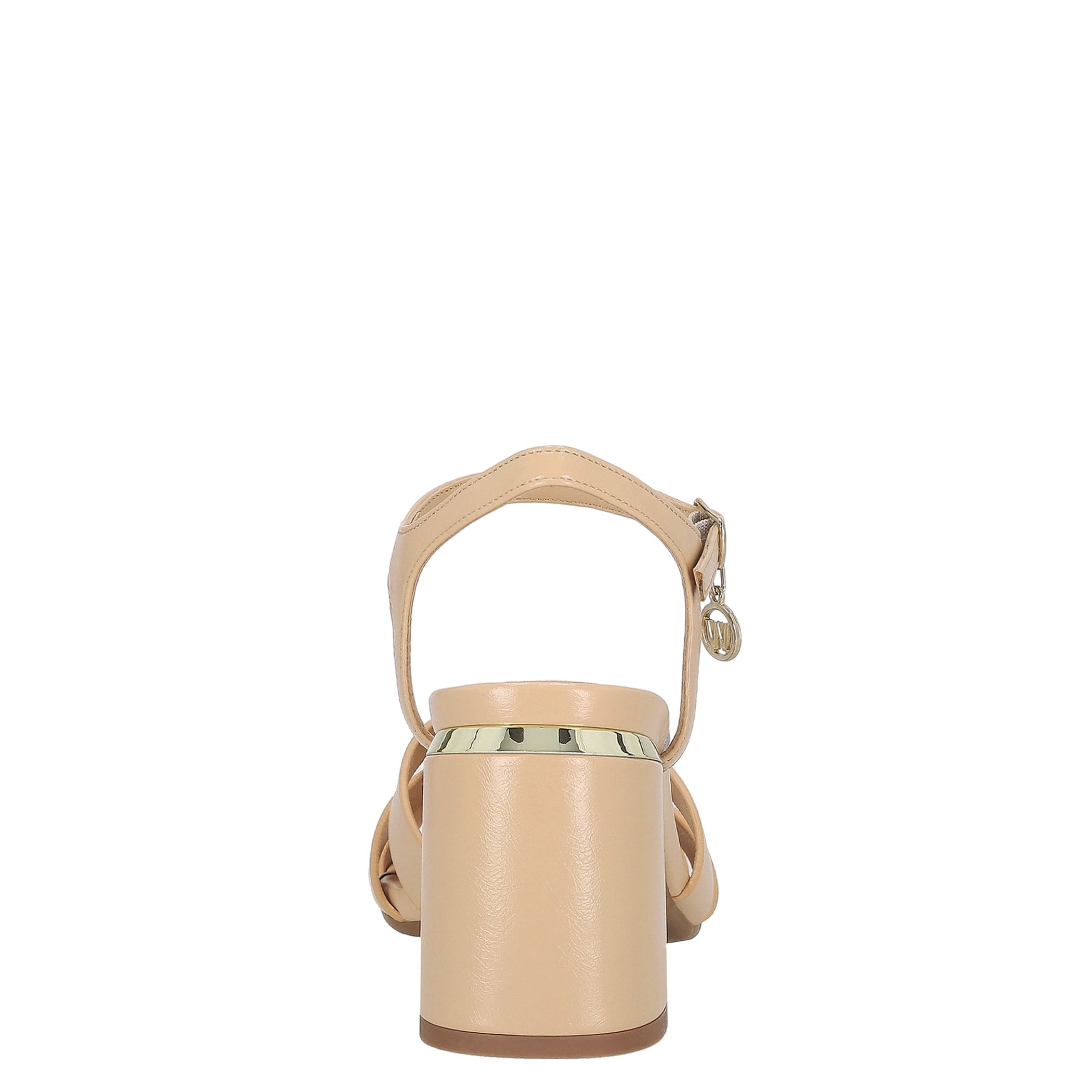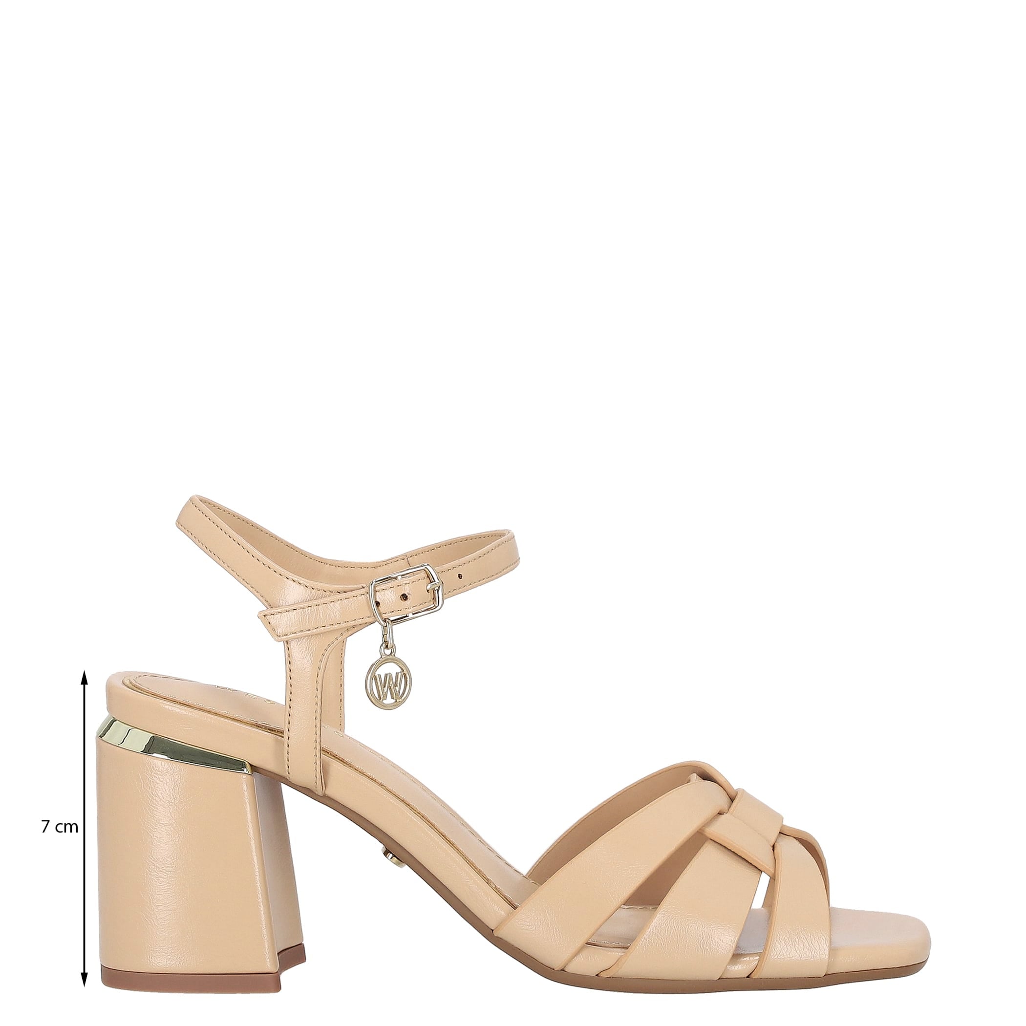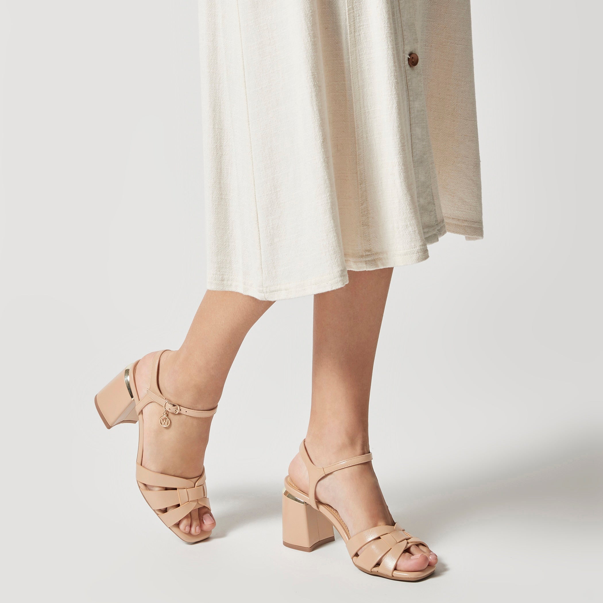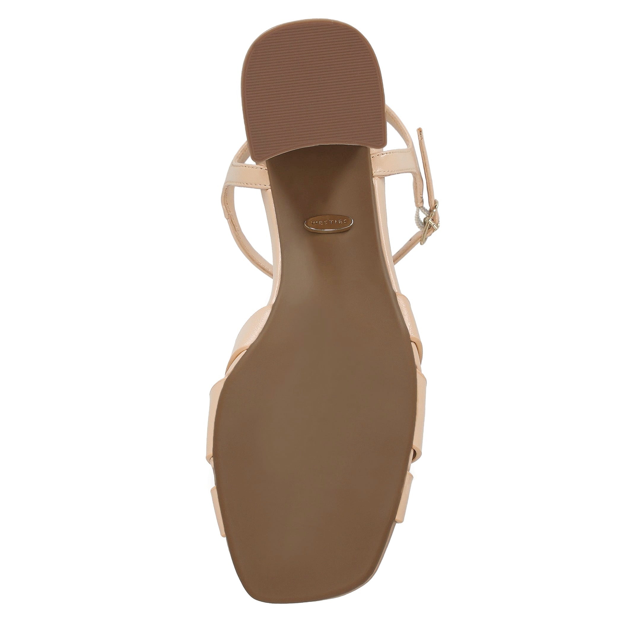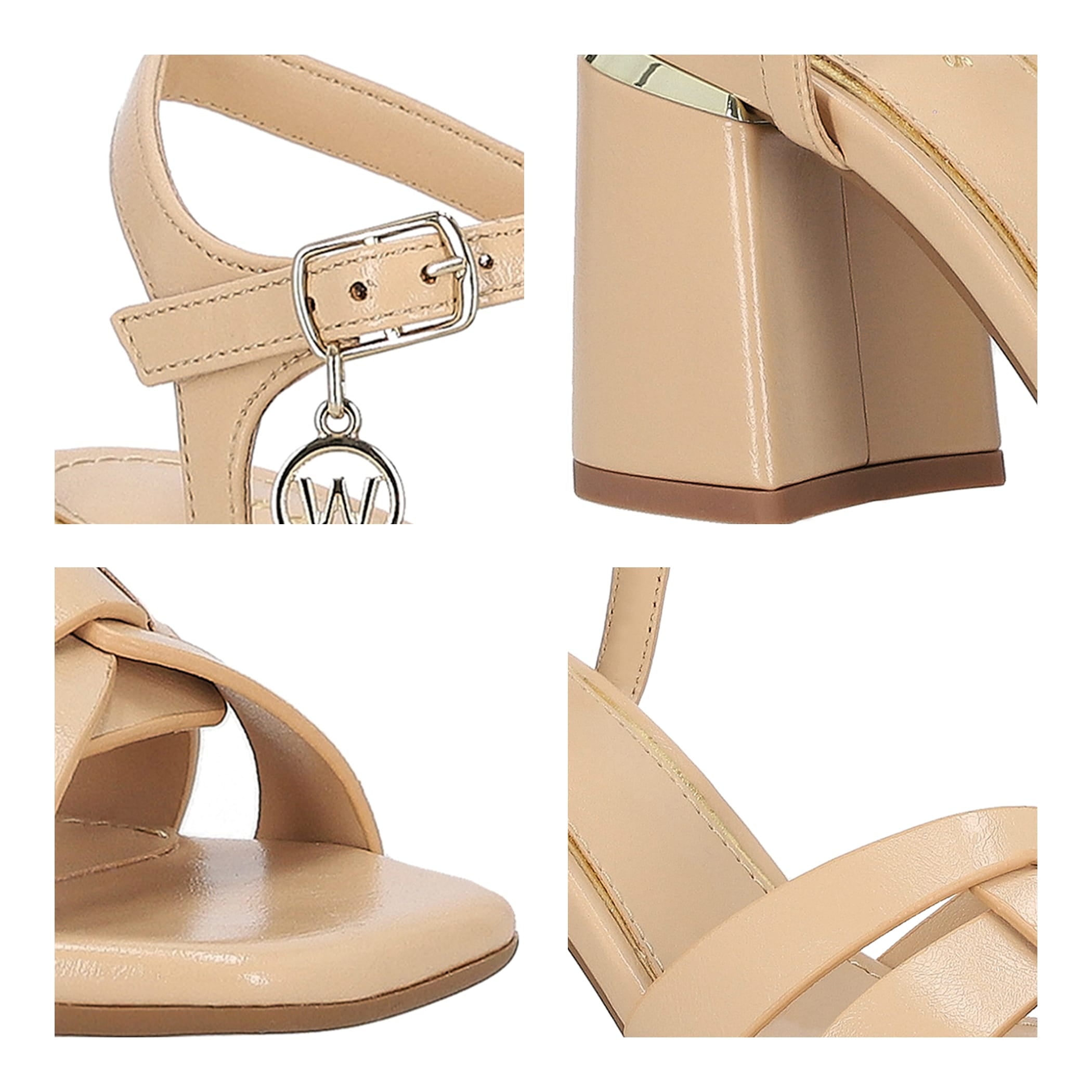 Sandalia Westies para mujer elaborada en material sintético con aplicación de herraje, estampado liso, fijación de hebilla, cuña alta, punta cuadrada y textura lisa.